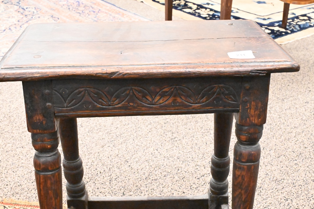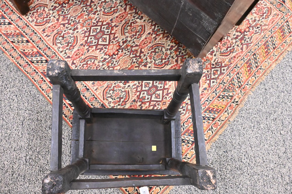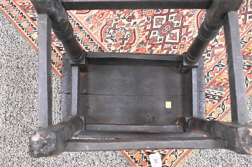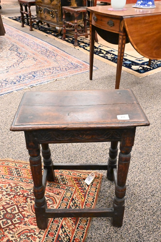 Lot 211: Oak Joint Stool, having rectangle top, on block and turned legs, box stretchers, height 21 1/2 inches, top 11″ x 18″. Provenance: Estate of Wallace Bradway, New Haven, CT.