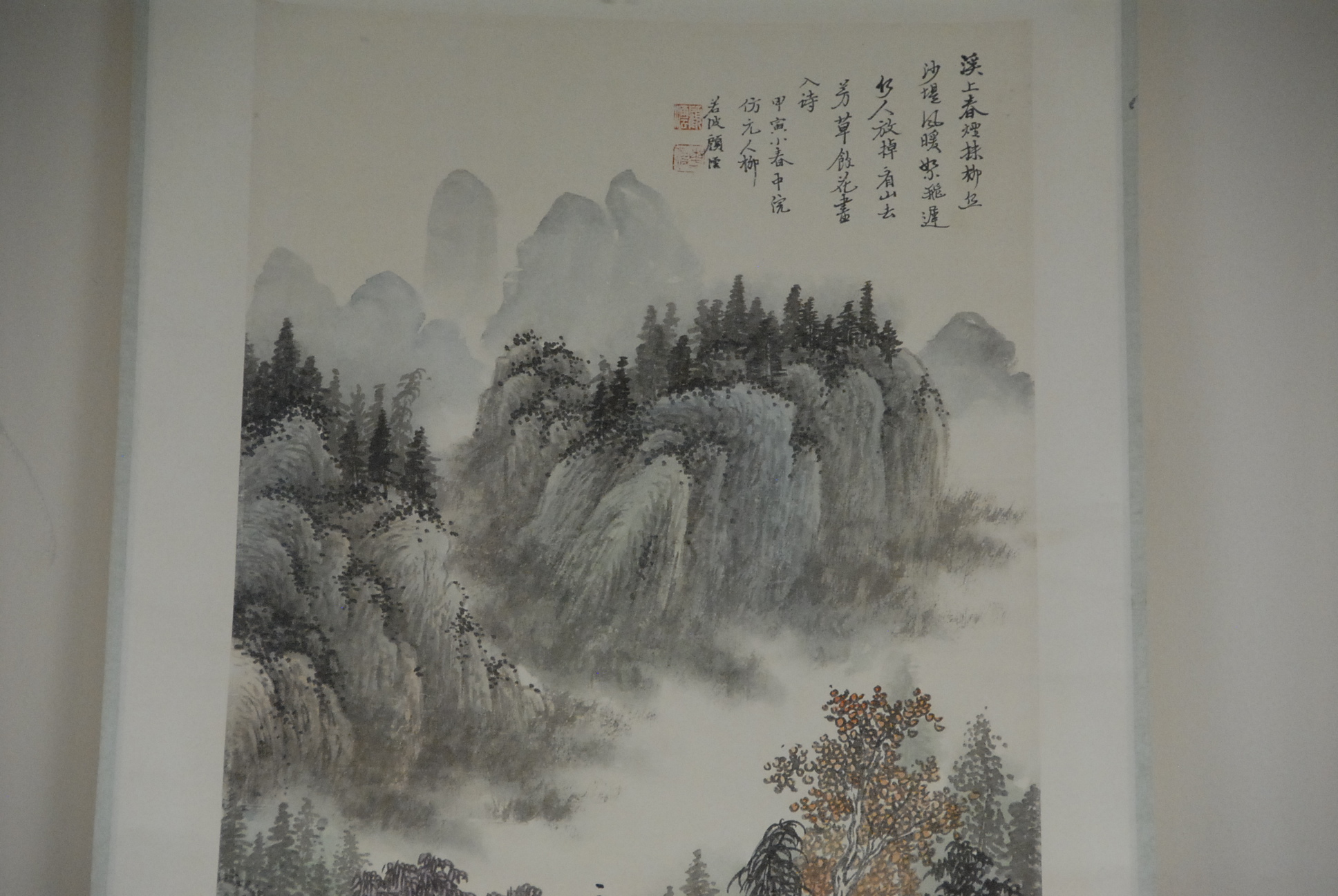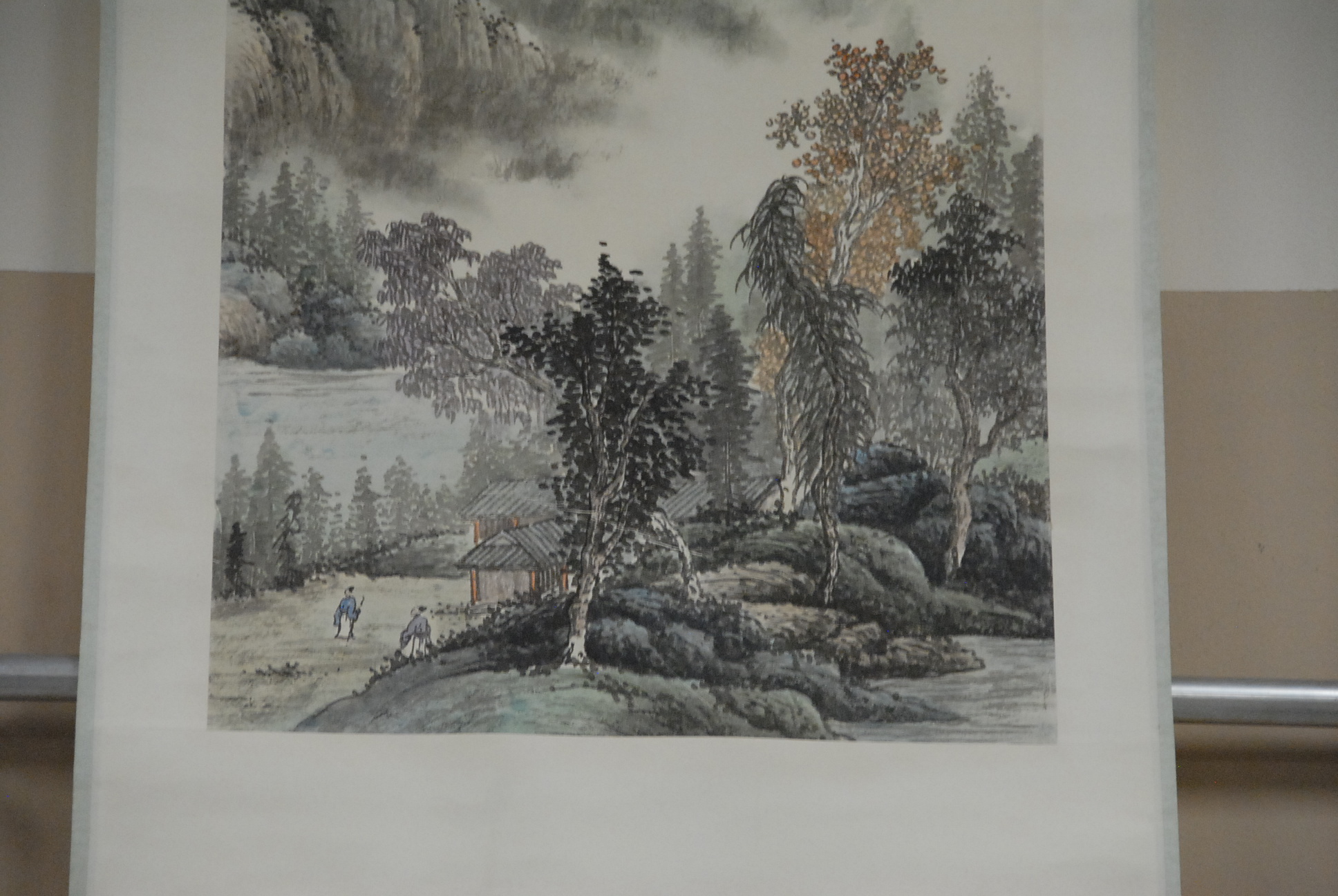 Lot 211: Oriental landscape scroll of mountainous landscape with figures, 33 x 17.