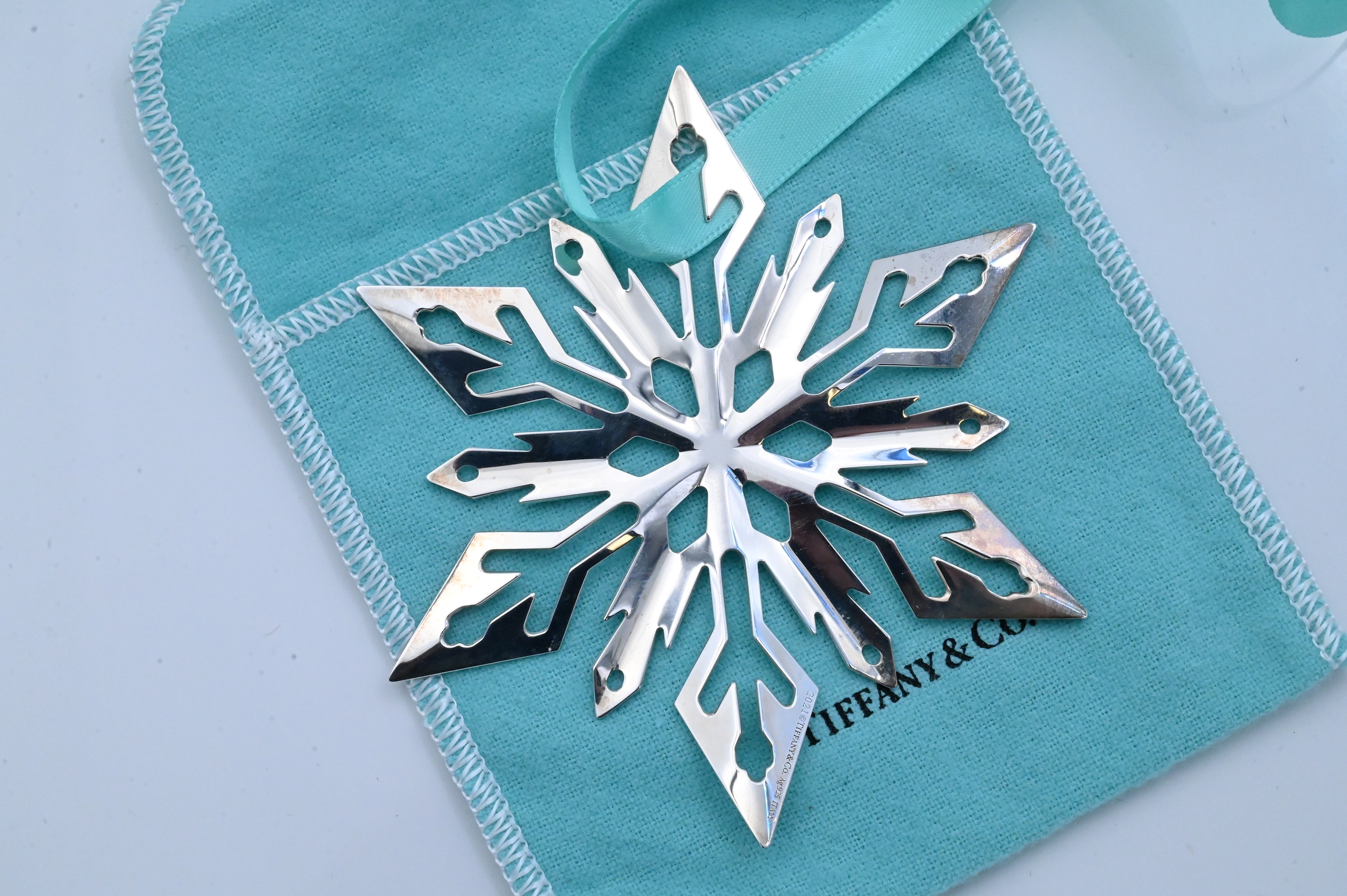 Marked “2021 © Tiffany & Co. Ag925 Italy,” suspended from Tiffany blue ribbon, in original pouch and box.