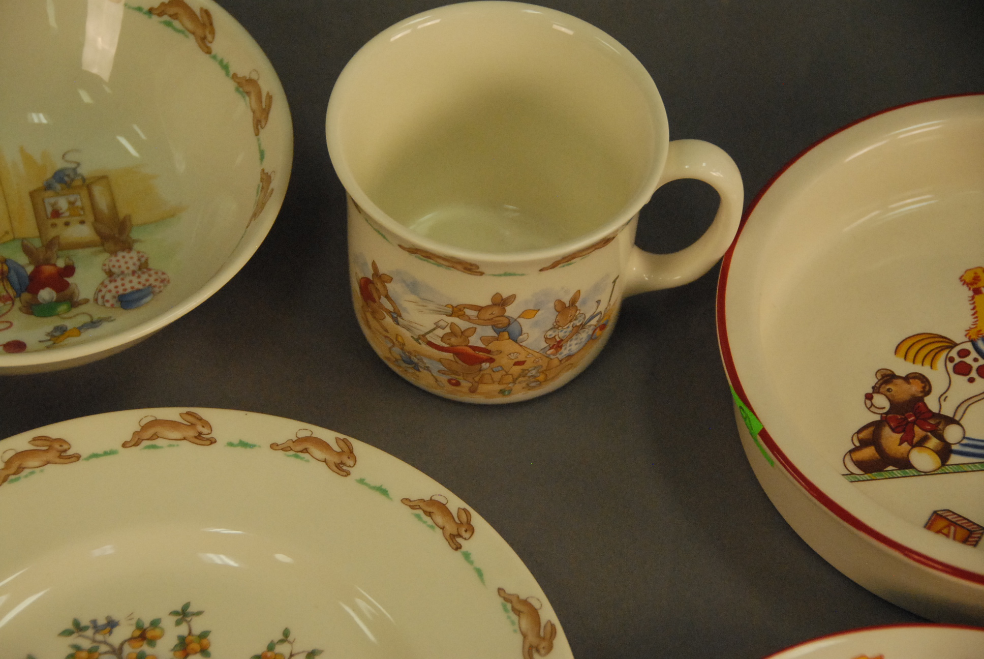 Two child’s dish sets including BunnyKins bowl, plate and cup and a Tiffany Toys masons set.