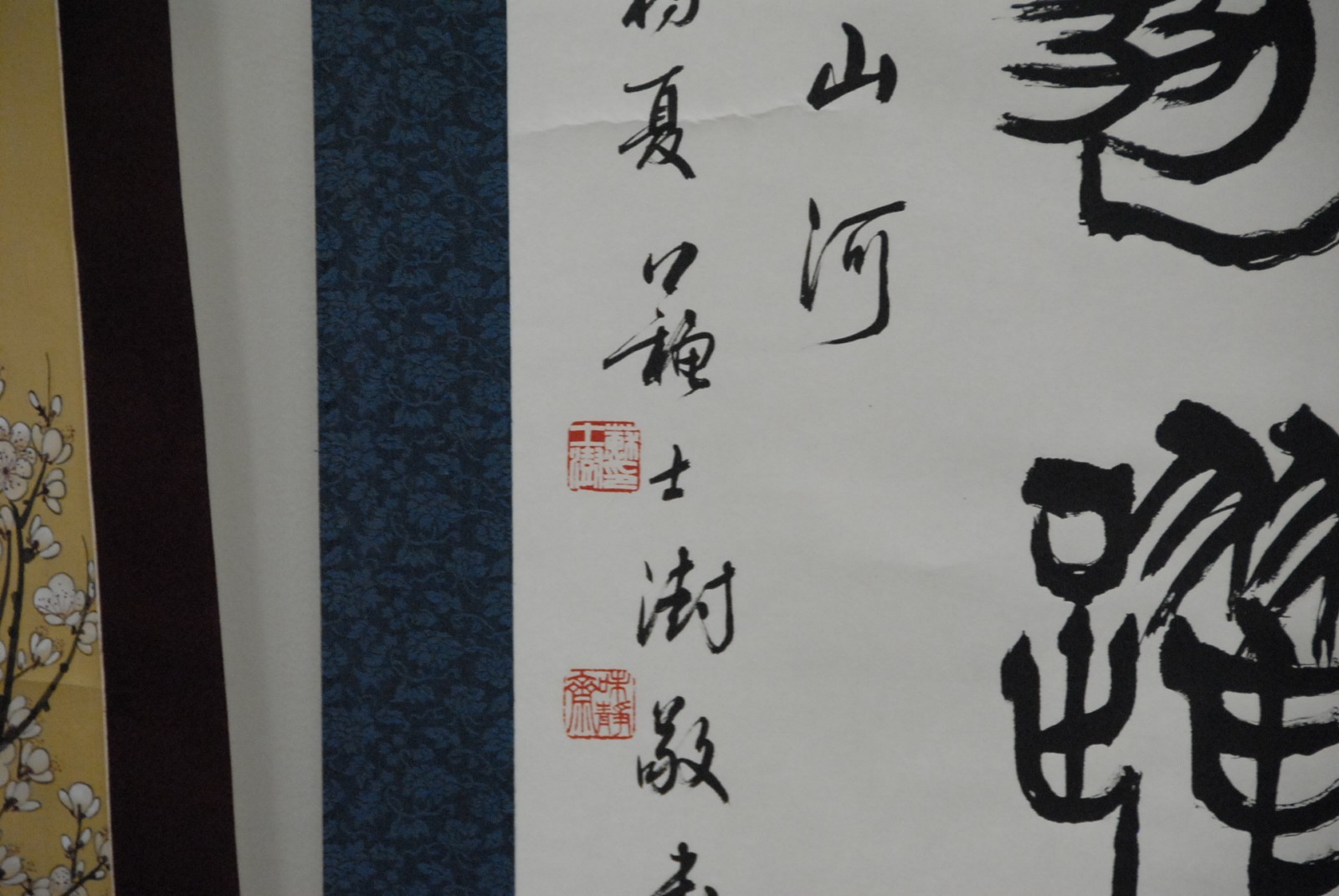 Two Oriental scrolls, one with characters, one with mountainous landscape.