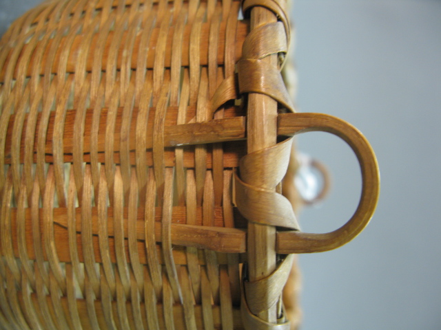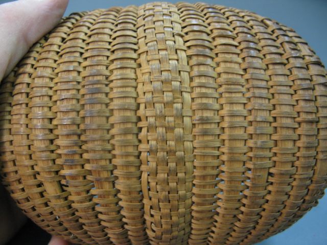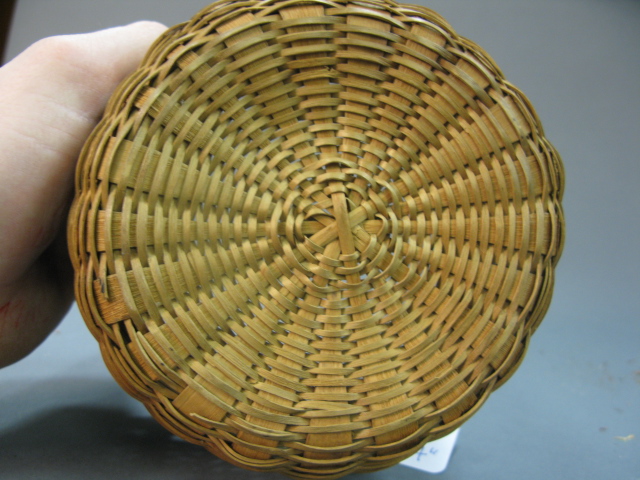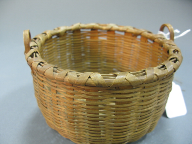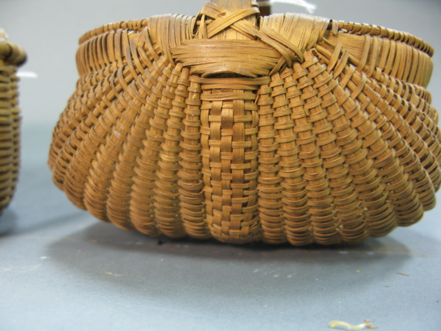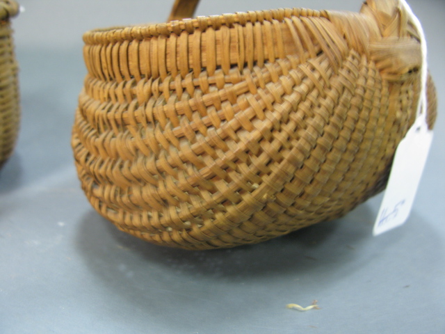 Two primitive baskets each diminutive, one melon and one with two small handles.