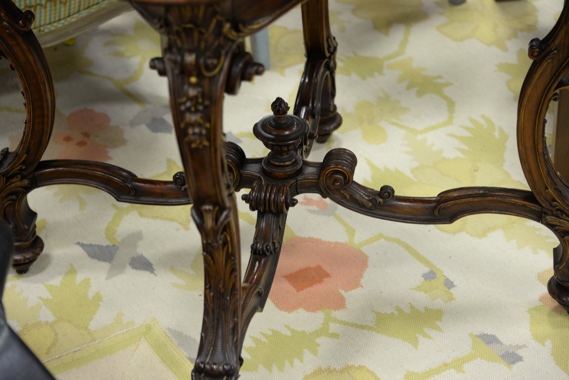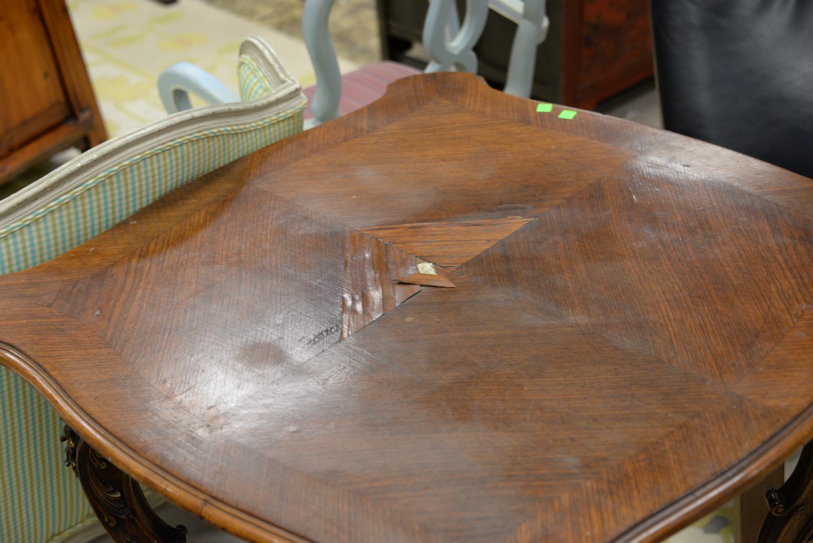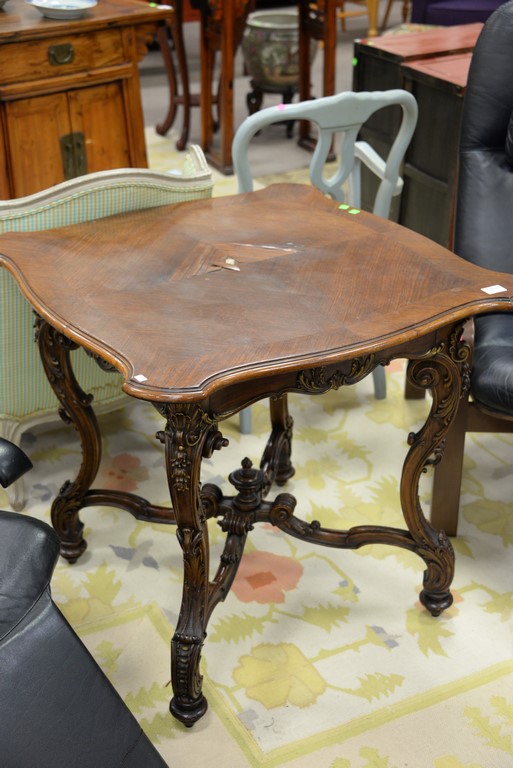 Walnut baroque style table some veneer damage. ht. 30 in. top: 31 x 31