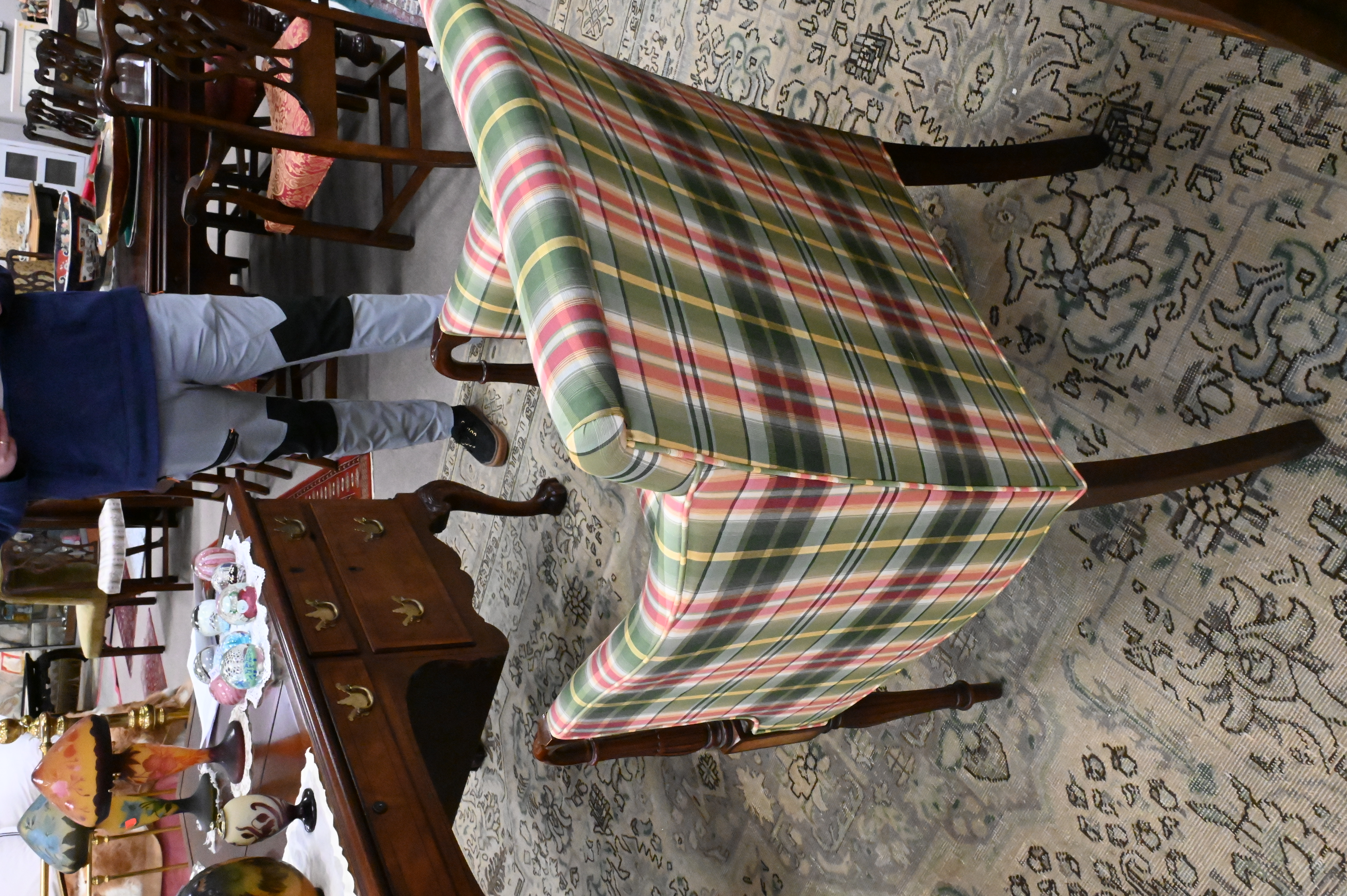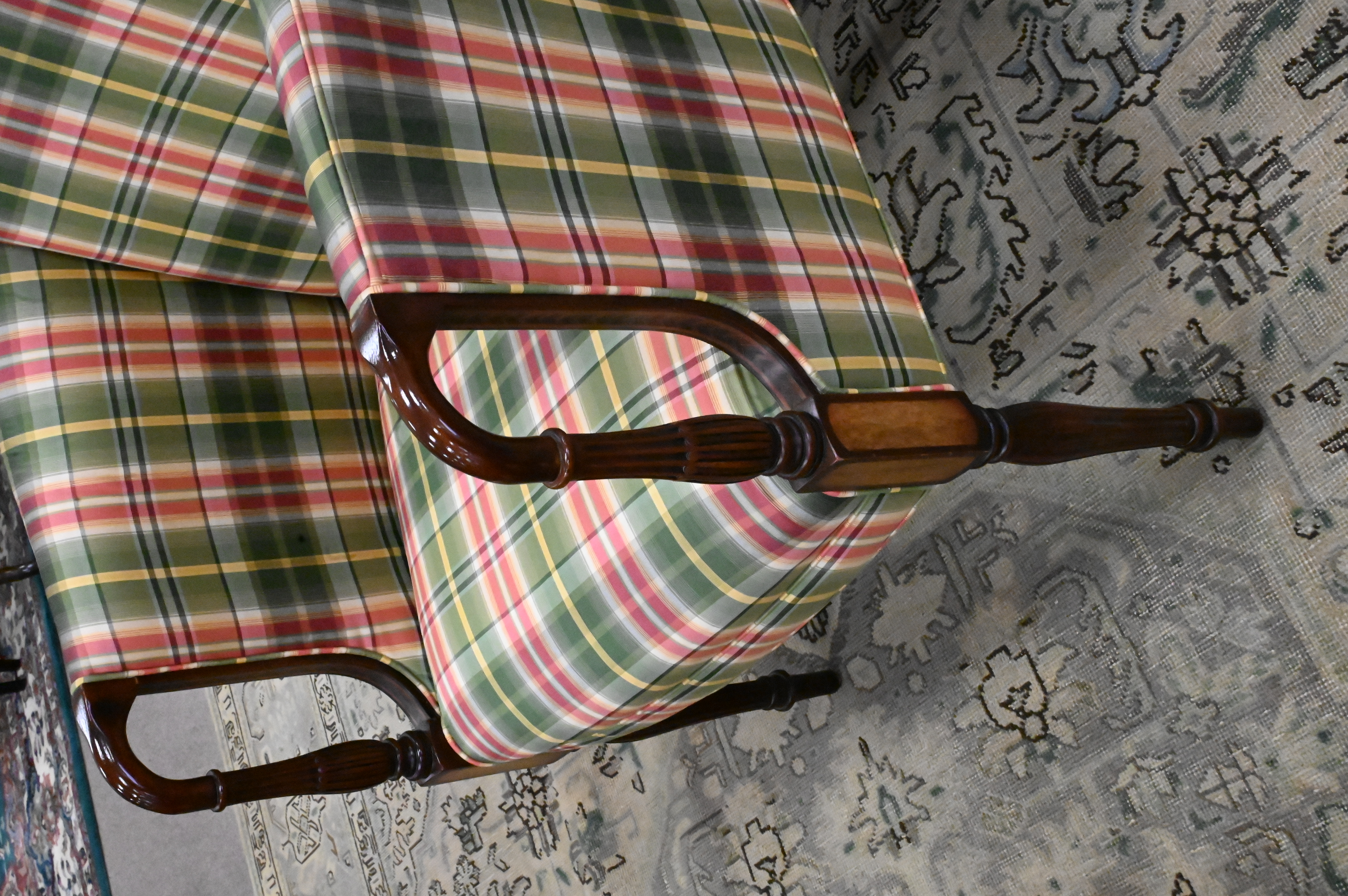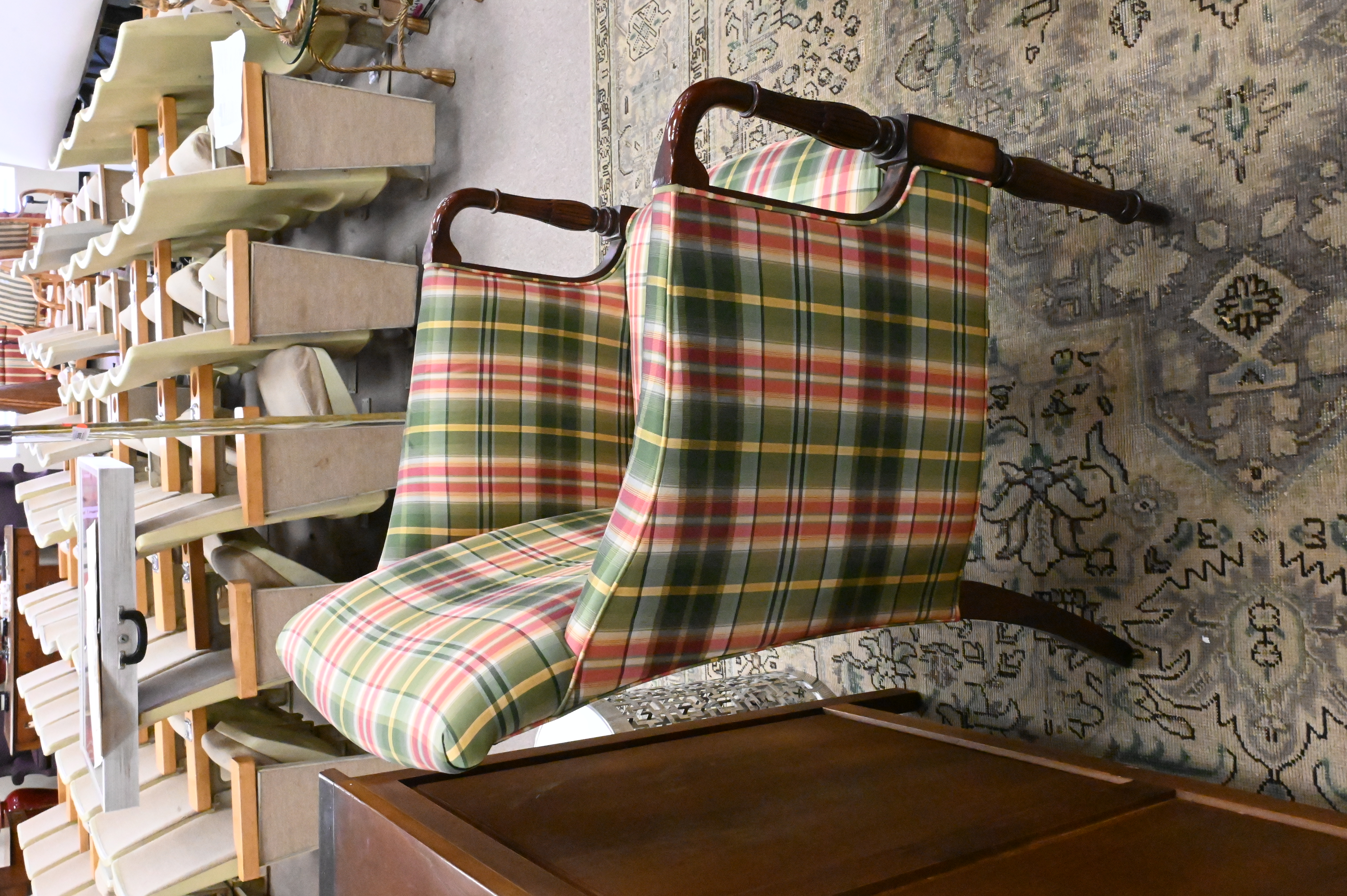 A Pair of Southwood Upholstered Sheraton Style Armchairs, having inlaid frame along with fluted legs, height 36 inches, width 24 inches, depth 26 inches.