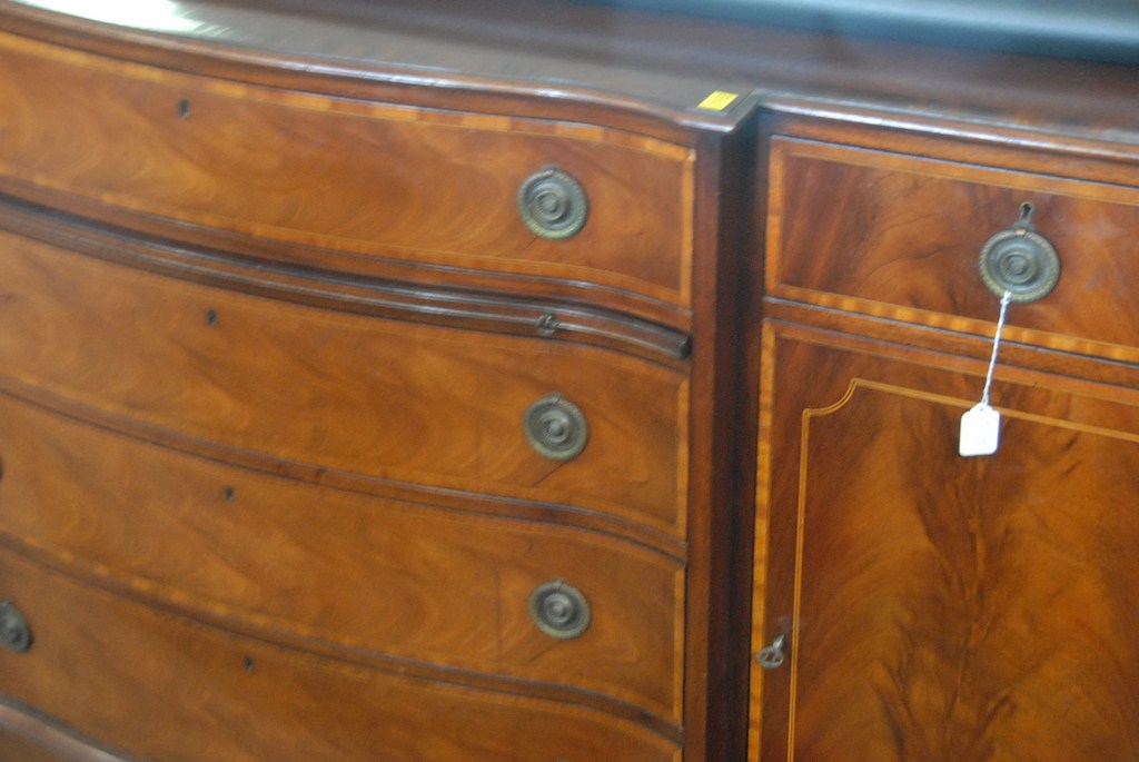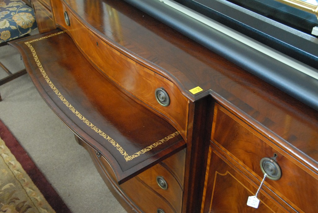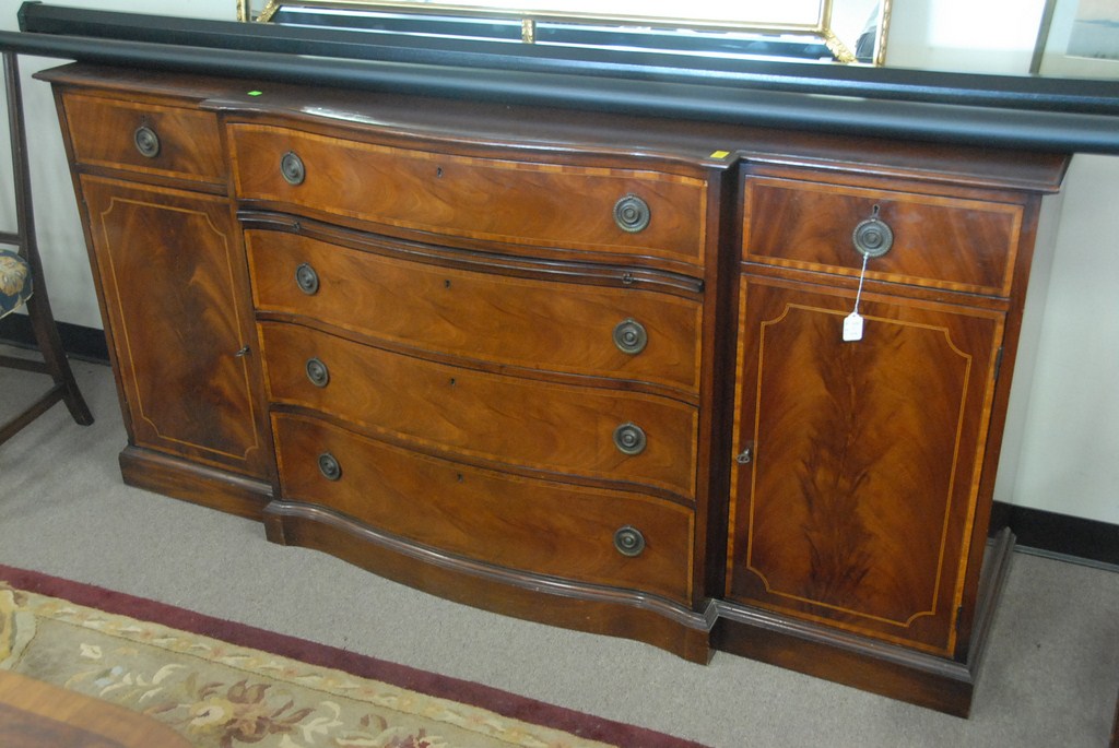 Lot 212: Beacon Hill custom mahogany credenza with banded and line inlays, signed with paper label, ht. 36 1/2, lg. 73.