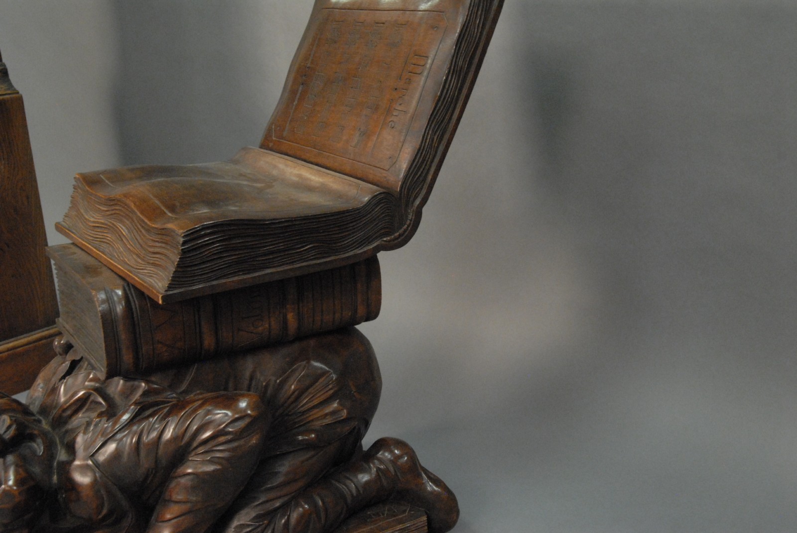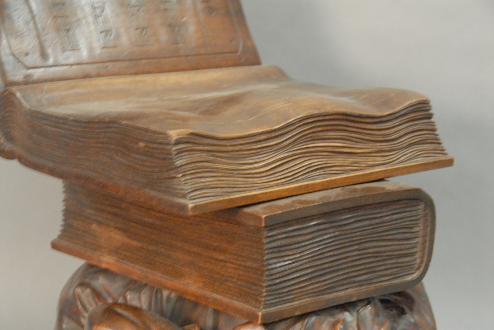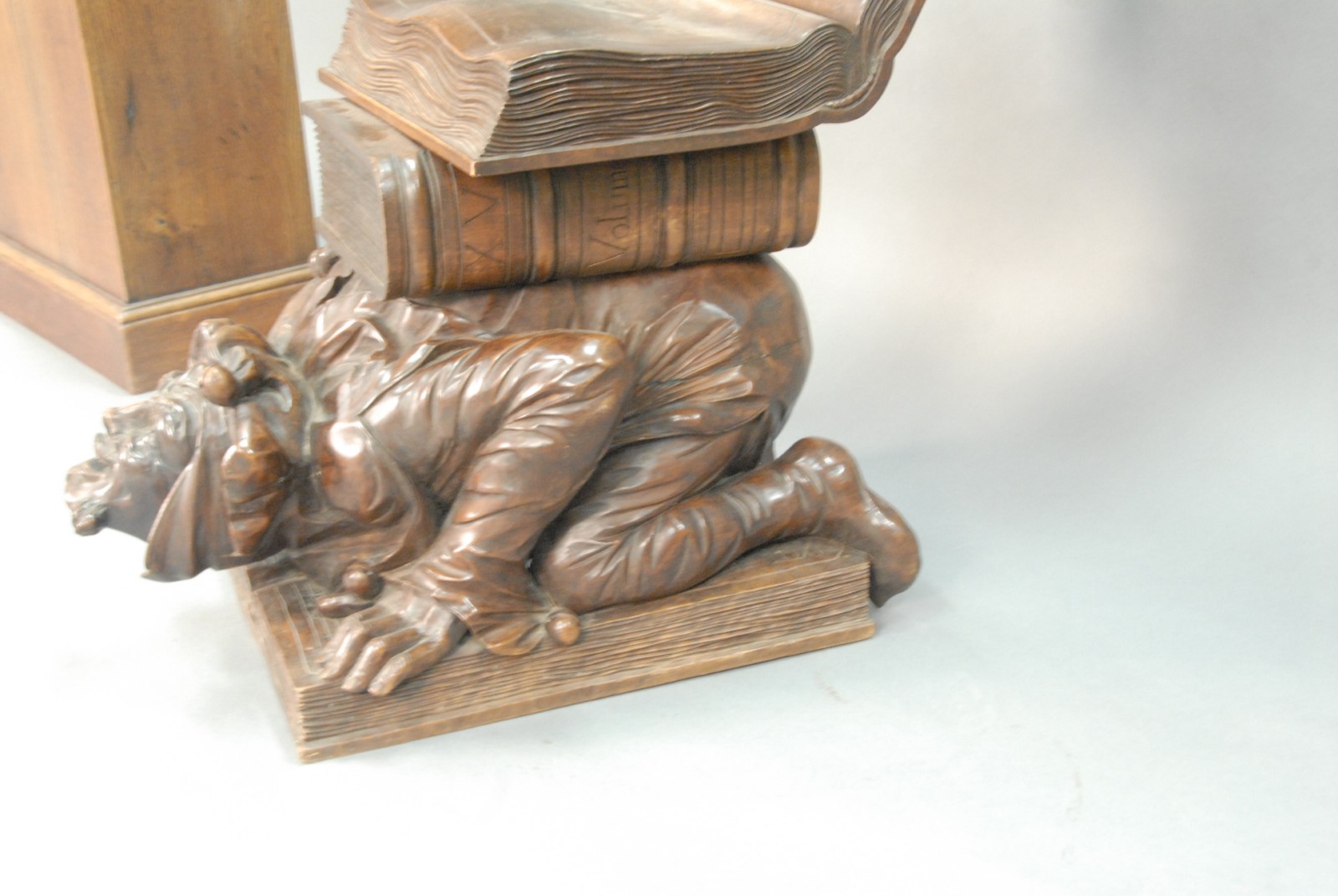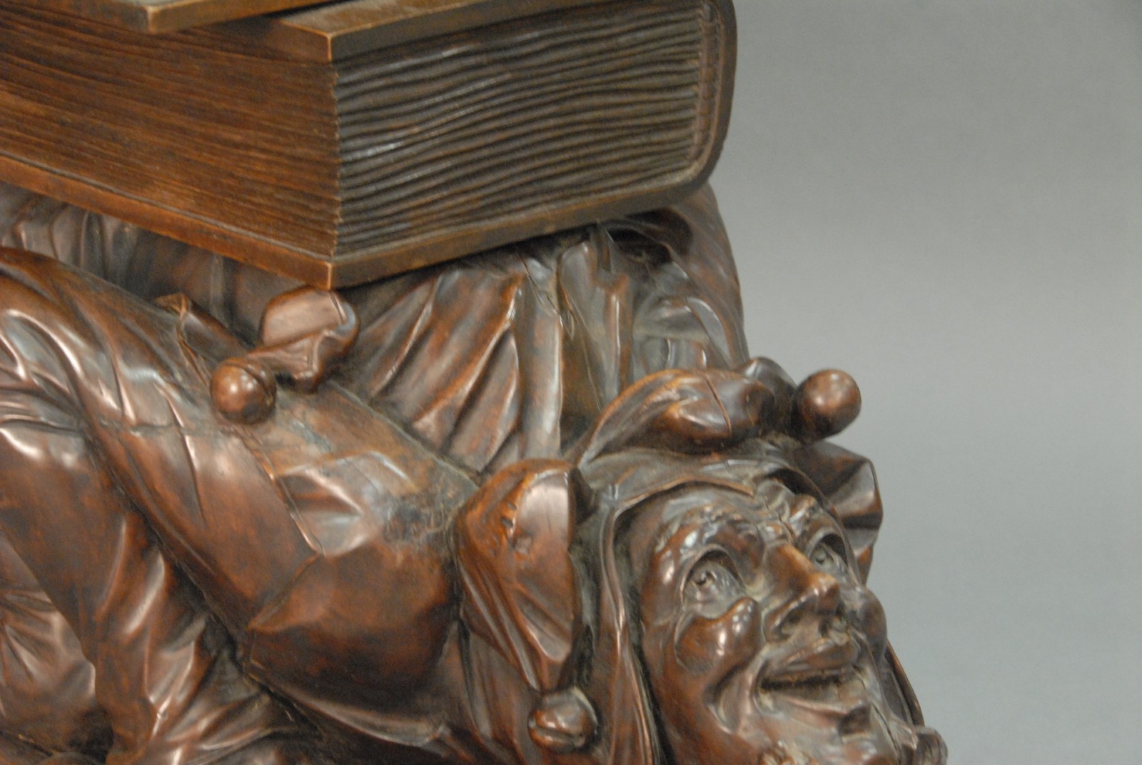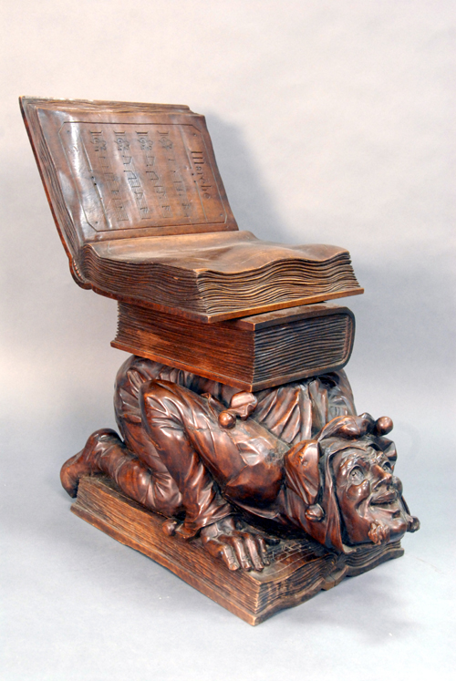 Black Forest carved walnut music seat is of an open book on top of a book on the back of a kneeling jester on top of a book.