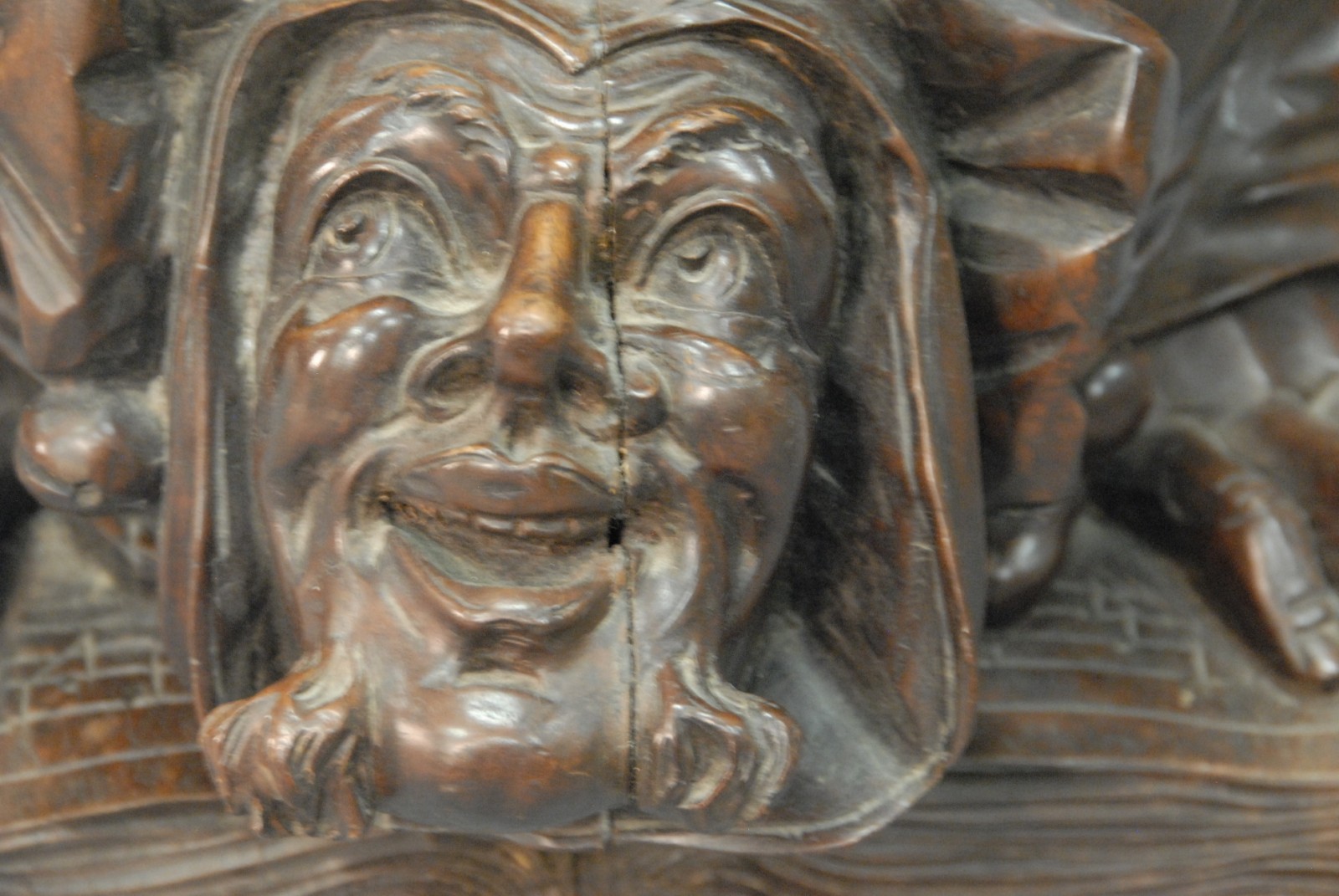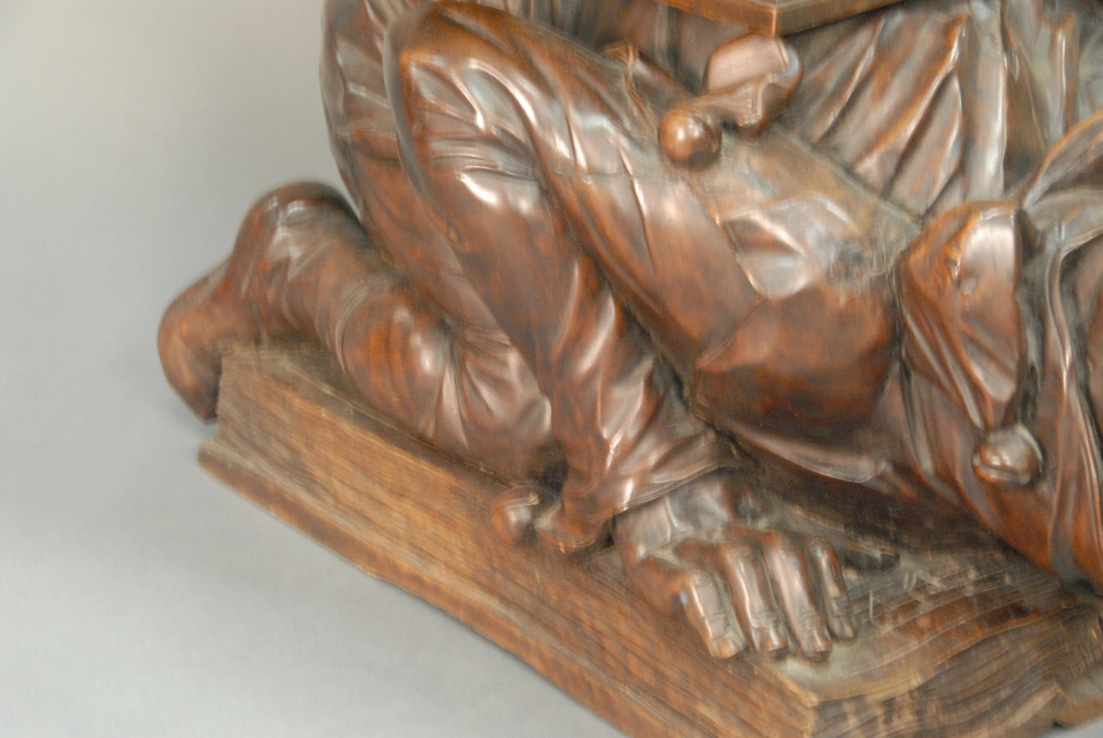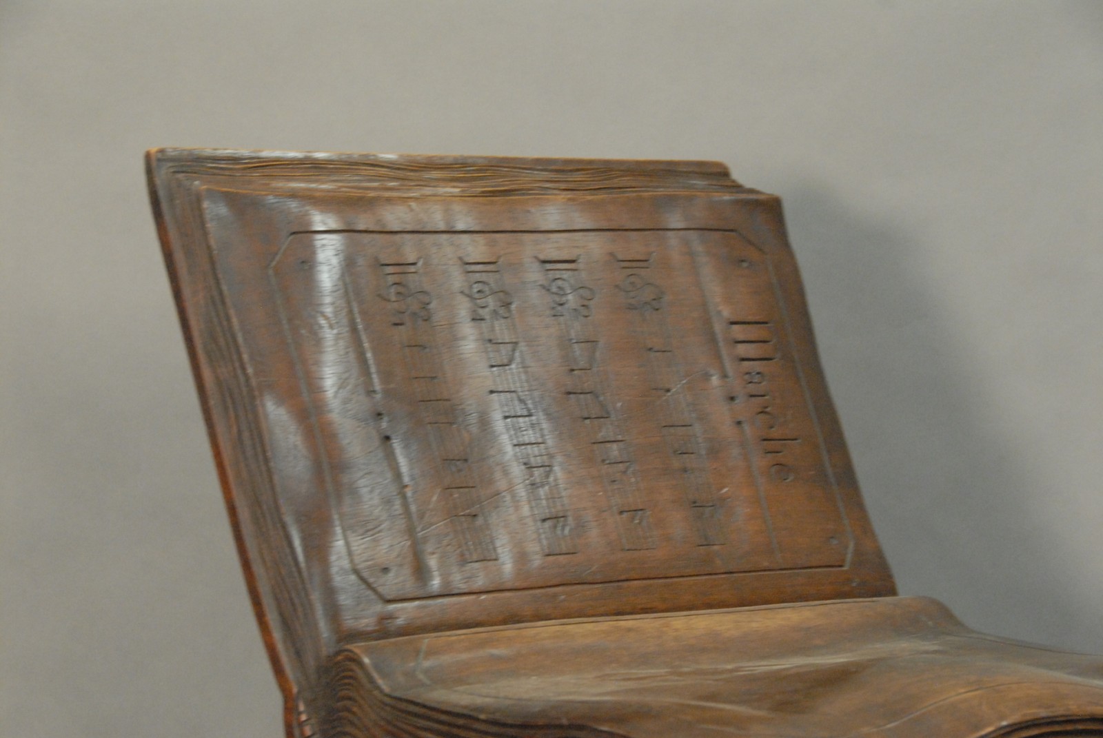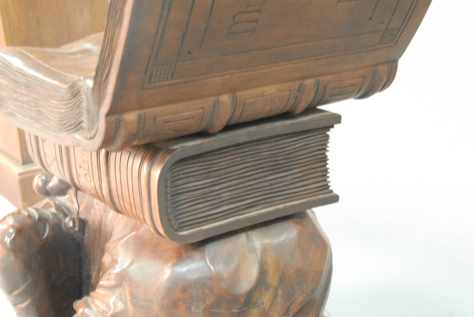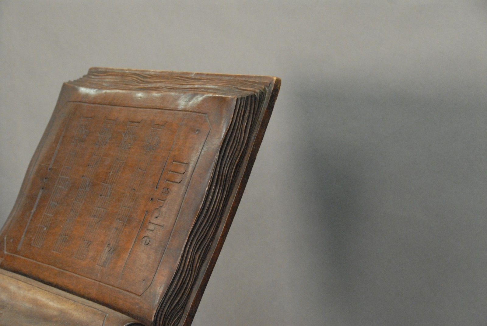 Black Forest carved walnut music seat is of an open book on top of a book on the back of a kneeling jester on top of a book.