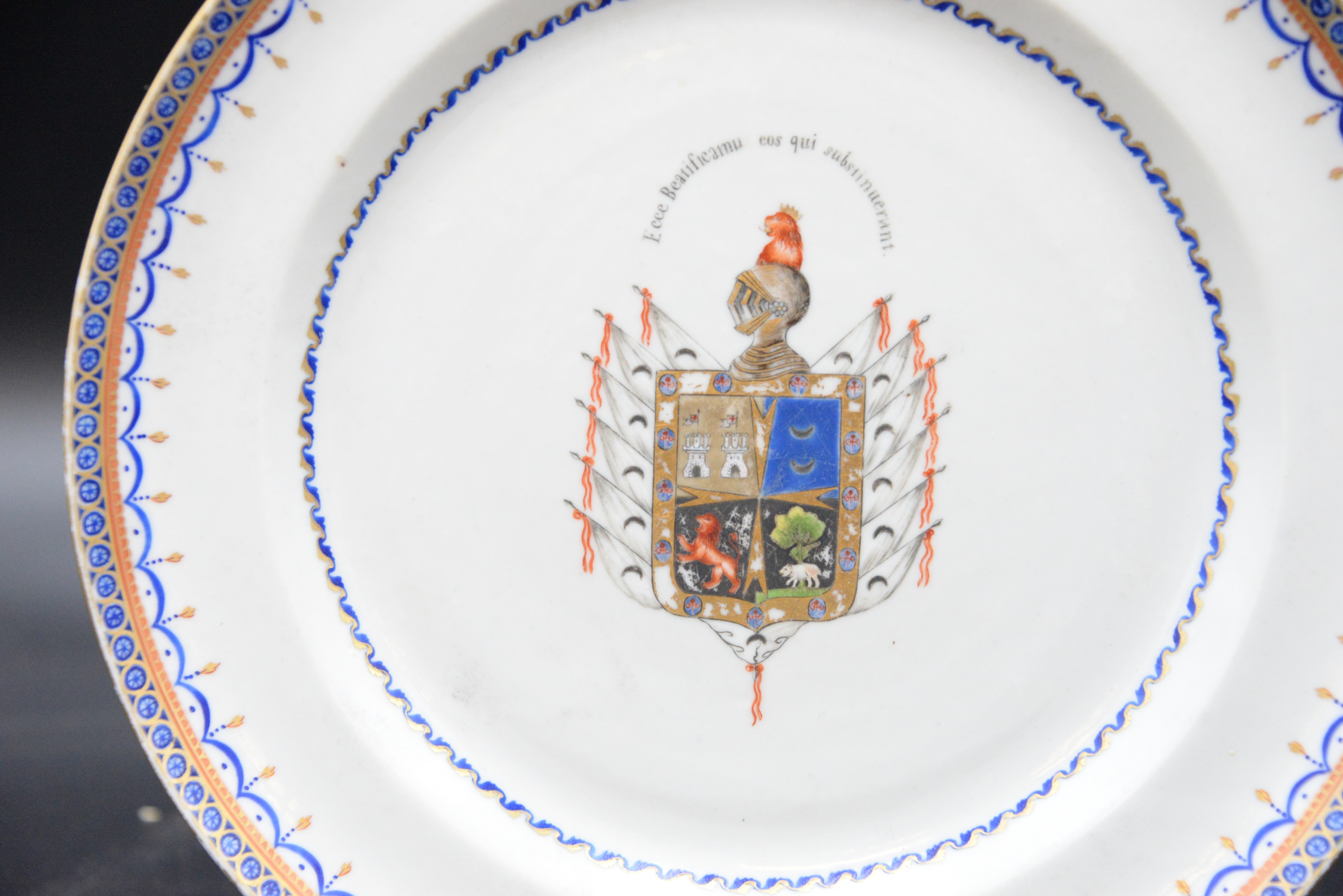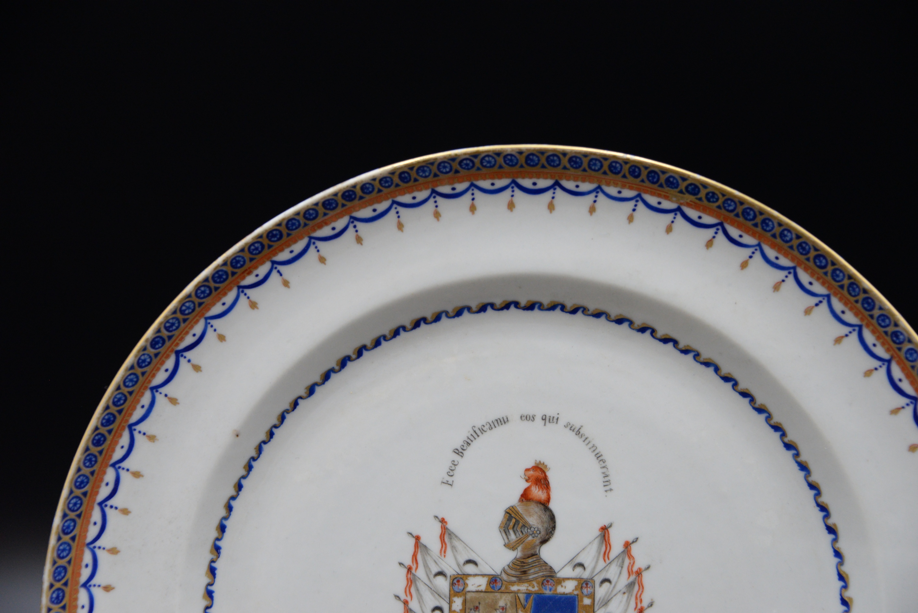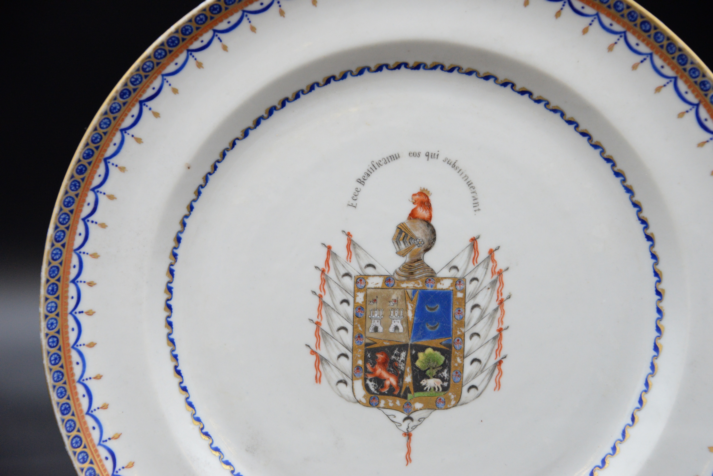 Chinese Export Porcelain Mexican Market Armorial Plate, Qianlong bearing the arms of Solar de Tejada, having swag border along with motto: “Ecce Beatificamus Eos Qui Substinverrint”, diameter 10 inches.