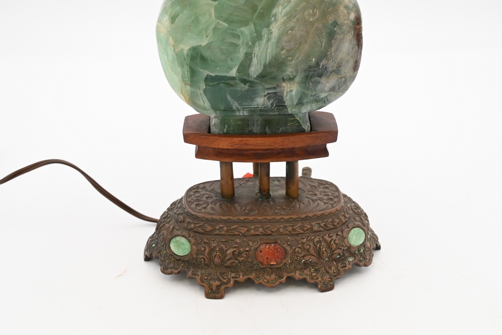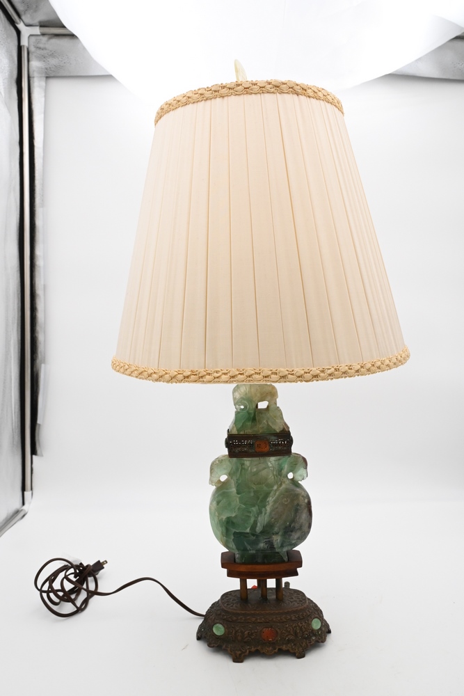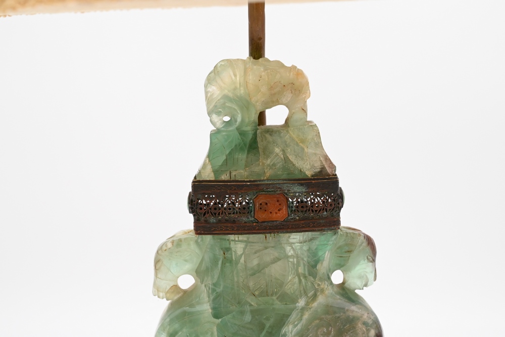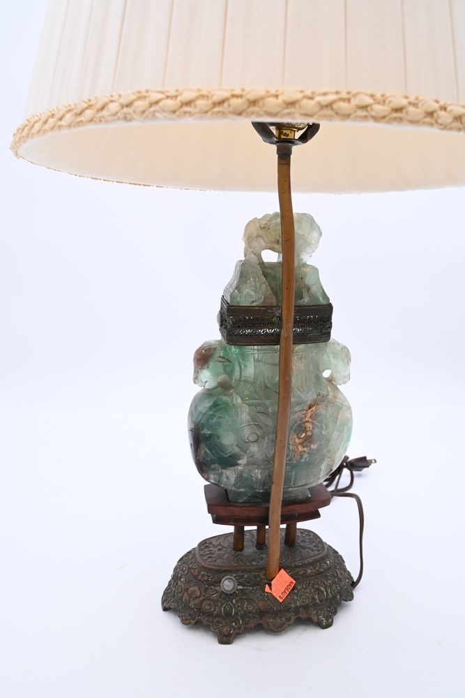Lot 212: Chinese Green Quartz Urn having carved animals, made into a table lamp on bronze base mounted with stones overall height 29 inches Provenance: Waterfront Estate, Stamford, Connecticut.