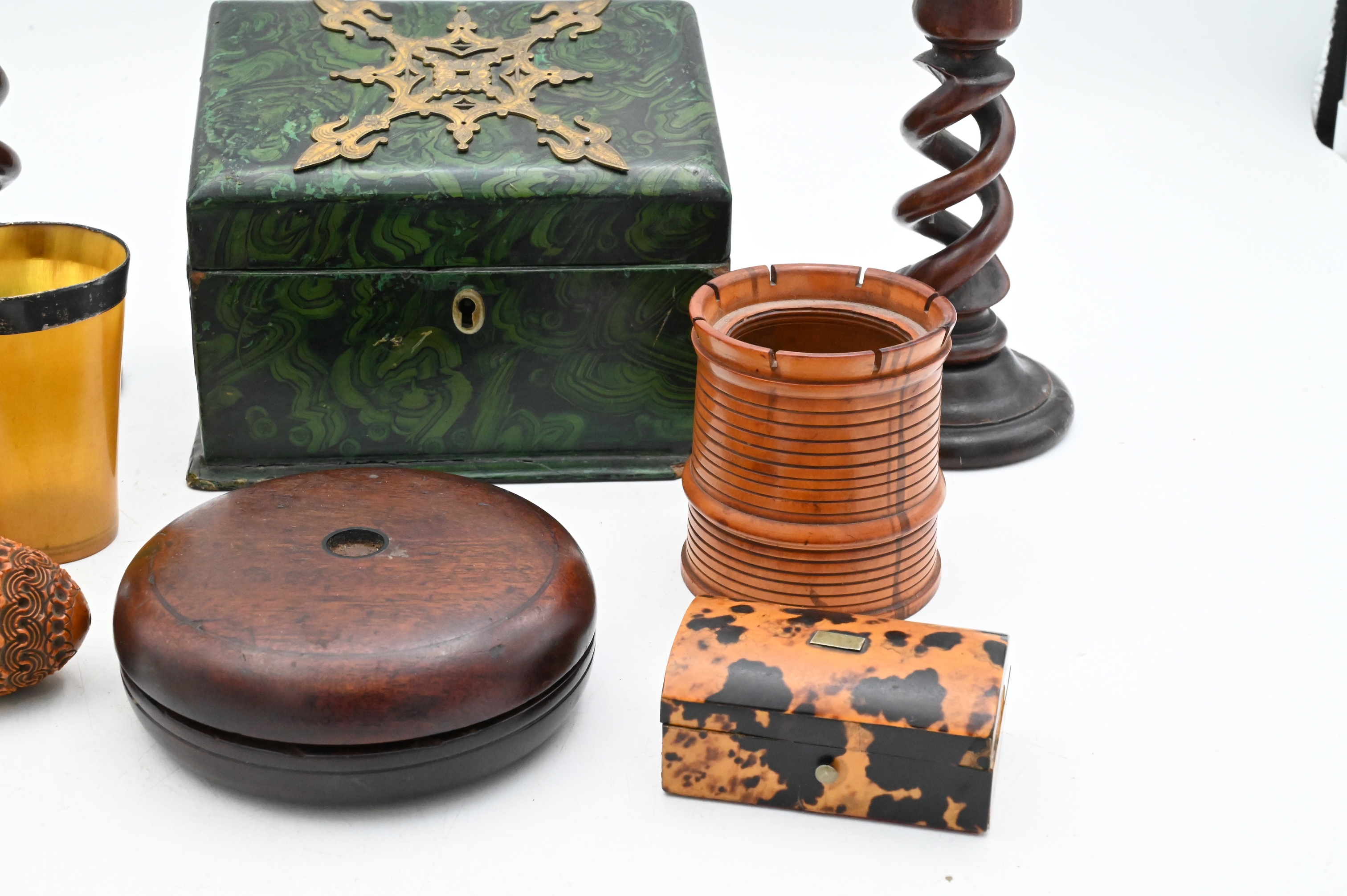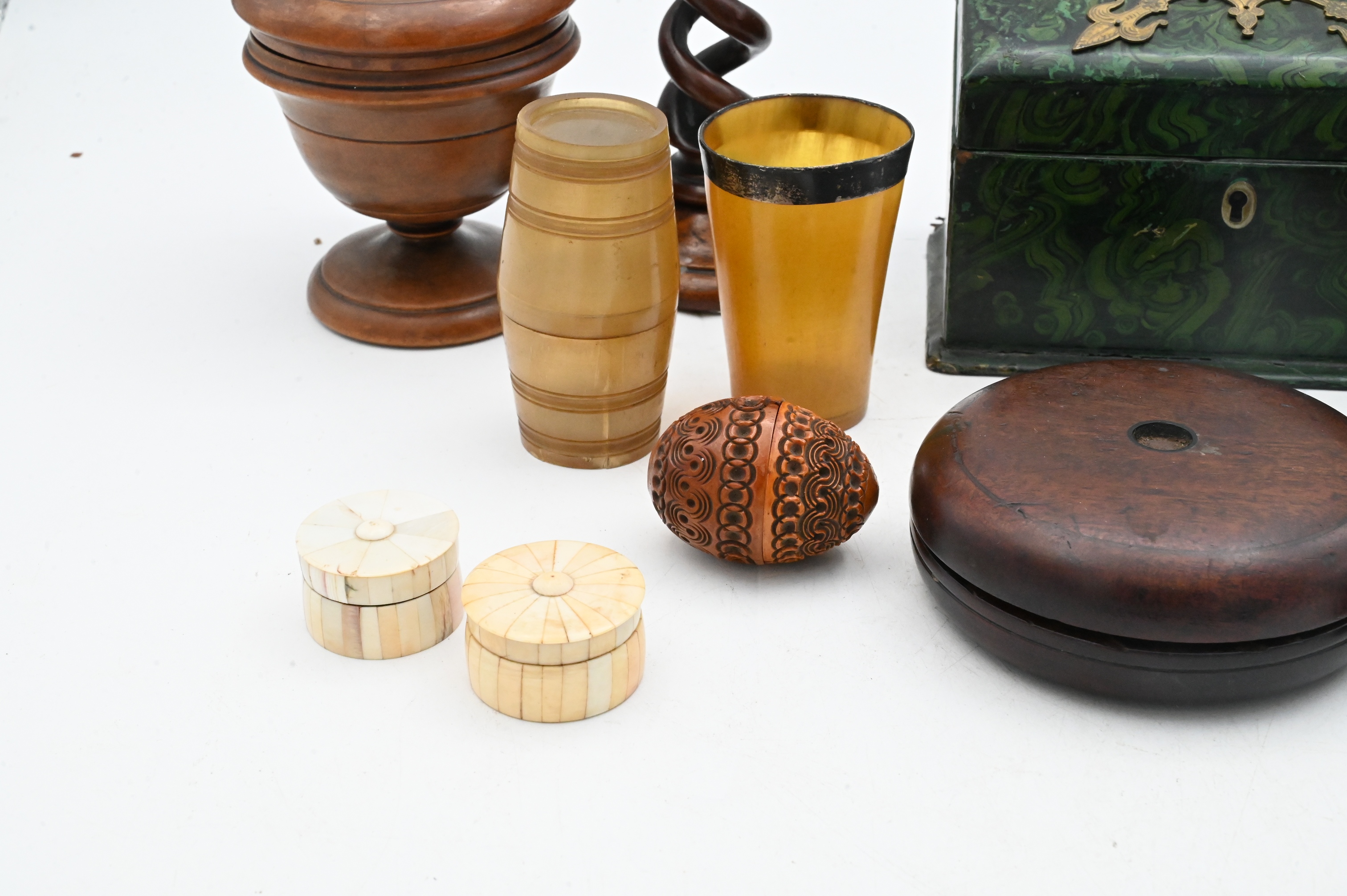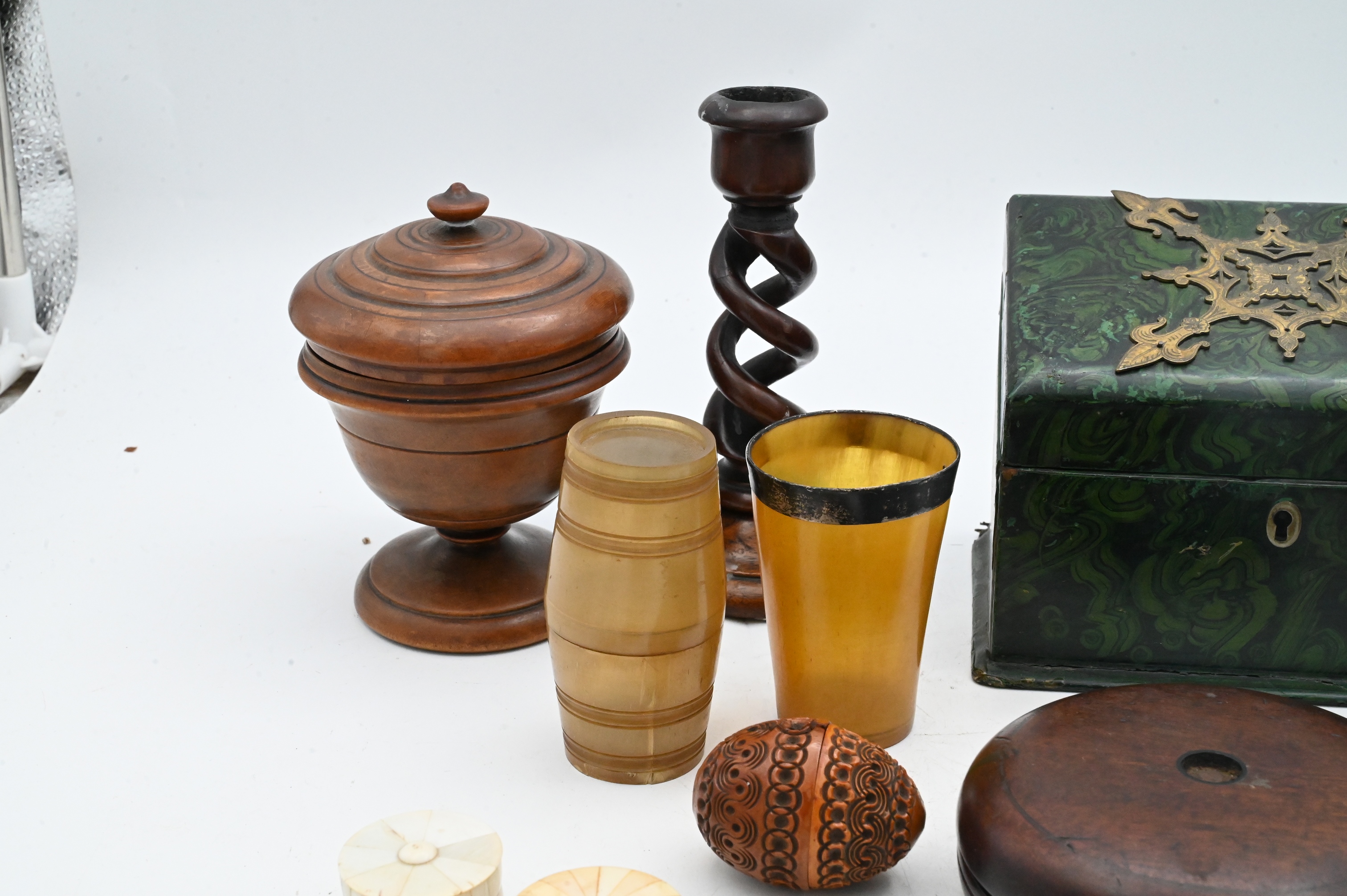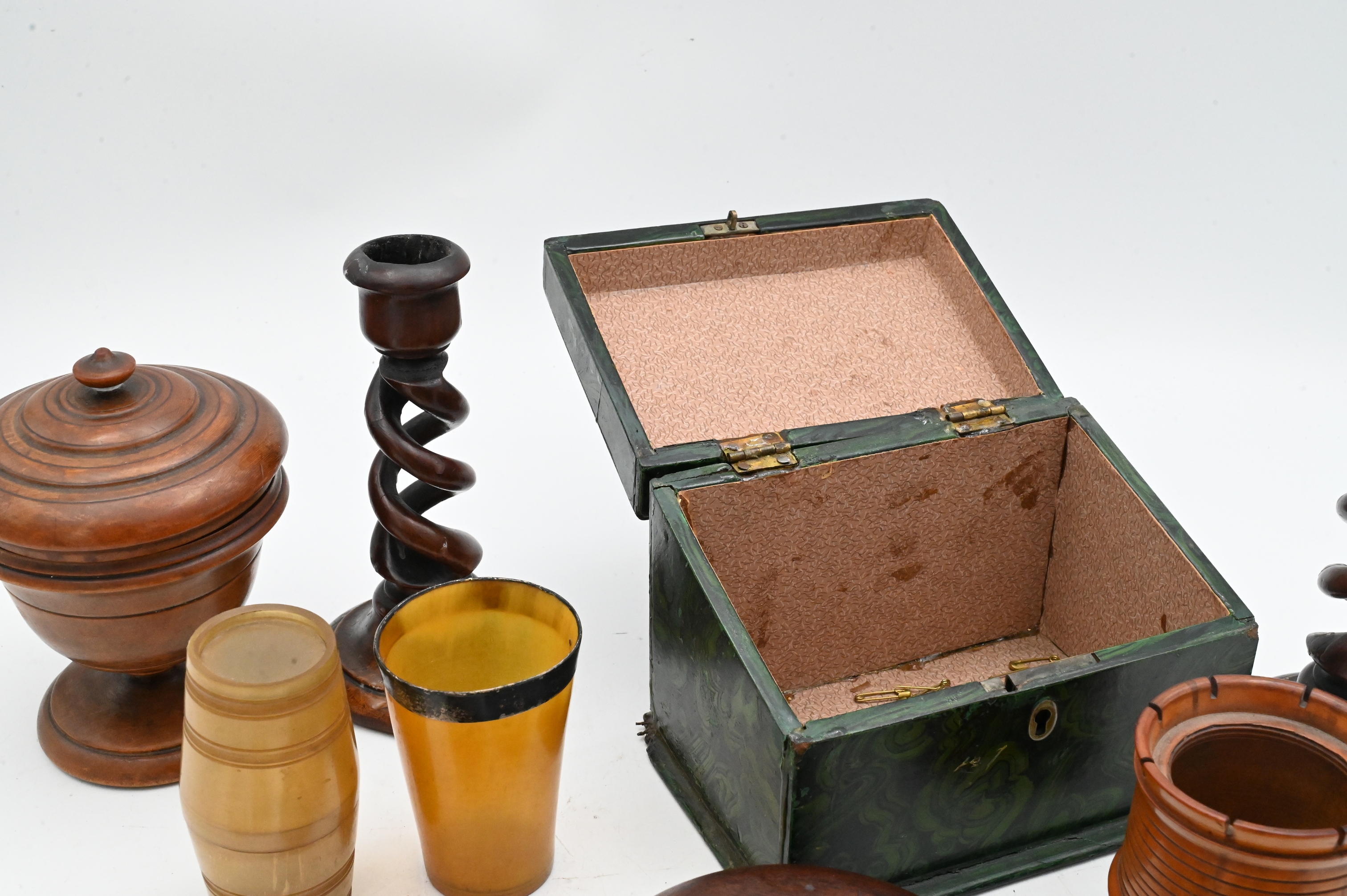 An assorted grouping comprising a pair of spiral-twist candlesticks; a turned covered urn-form box with knob finial; a small barrel-form horn box with fitted lid; a horn cup with silver rim; boxwood dice shaker without lid; and two circular veneered snuff boxes with radiating segmented lids and button finials, 18th/19th Century