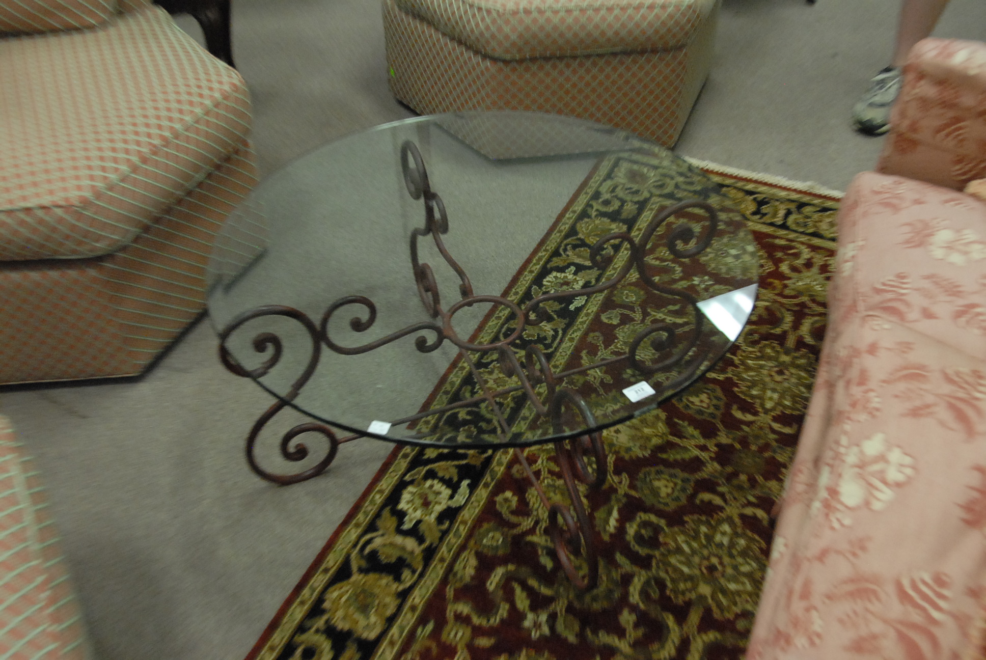 Contemporary glass top coffee table with iron base, ht. 16in. dia. 36in.