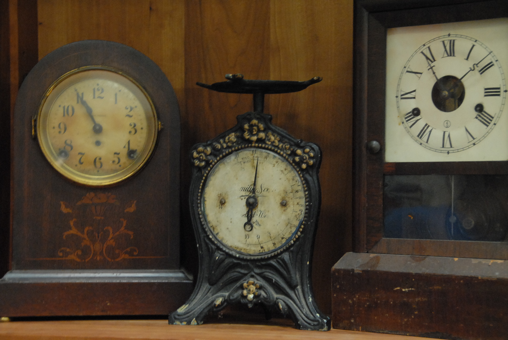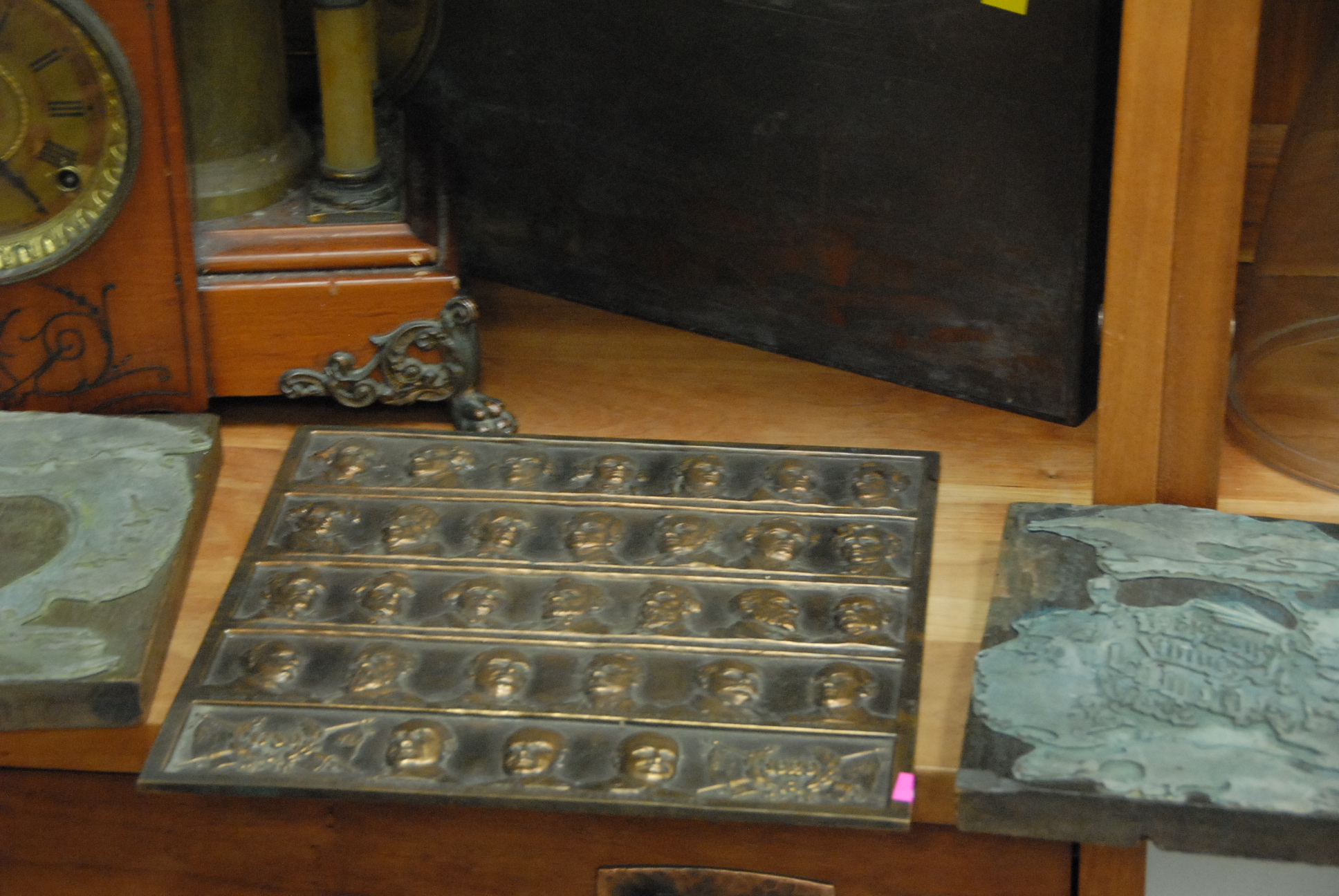 Lot 212: Eleven piece group lot to include three mantle clocks, four scales, bronze presidential plaque, print blocks, etc.