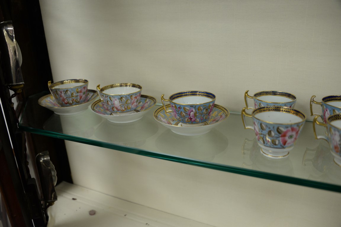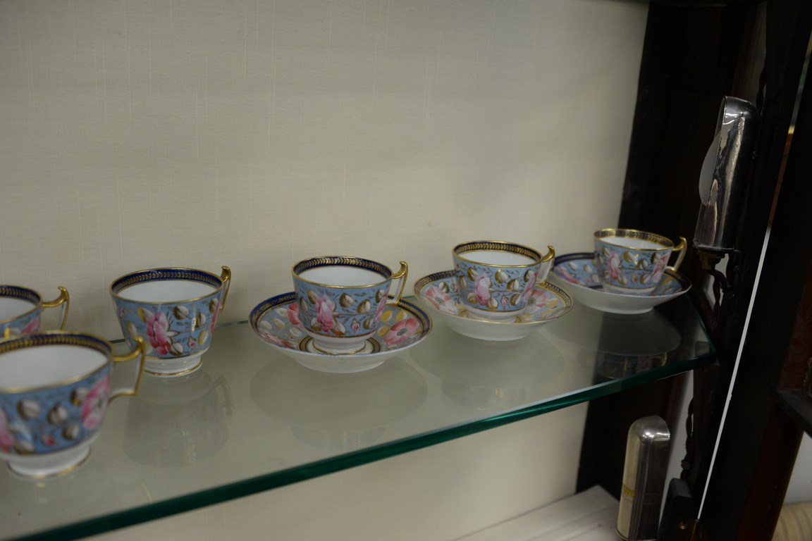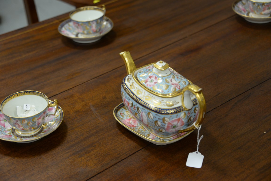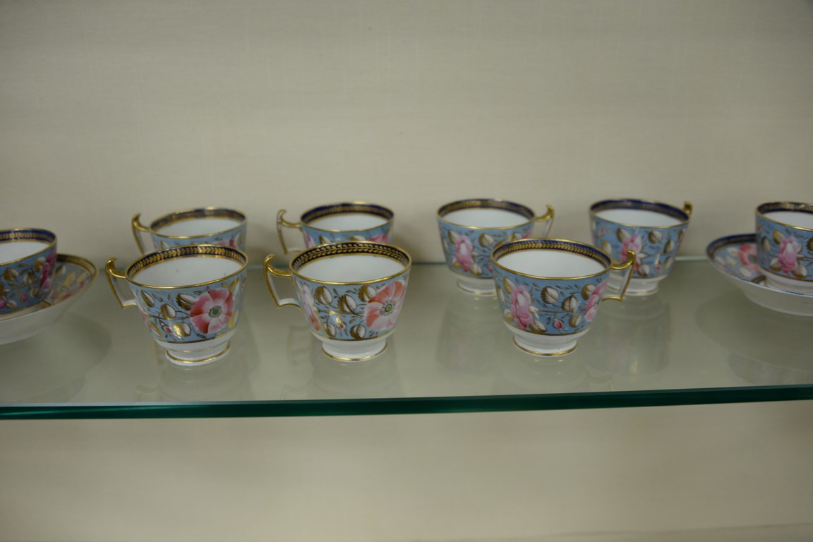 Lot 212: English tea and coffee set, thirty-five pieces including 9 coffee cups, 10 tea cups, 12 saucers, teapot, underplate, bowl, and plate.