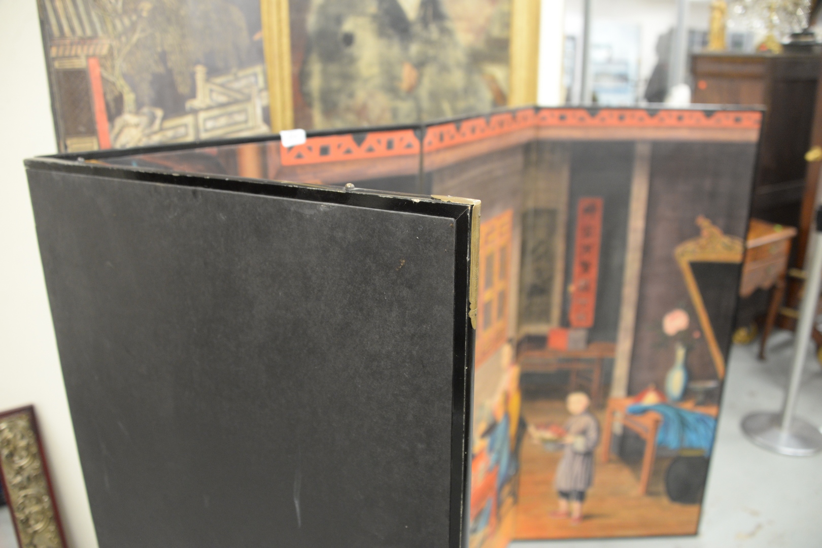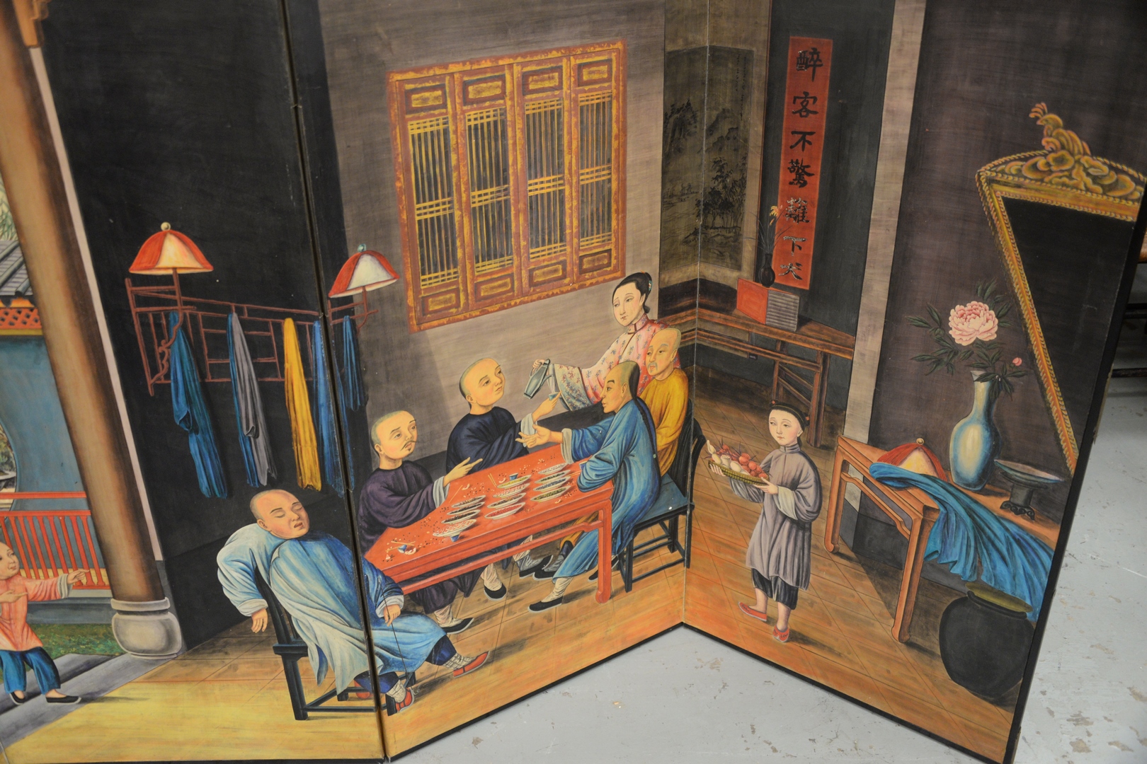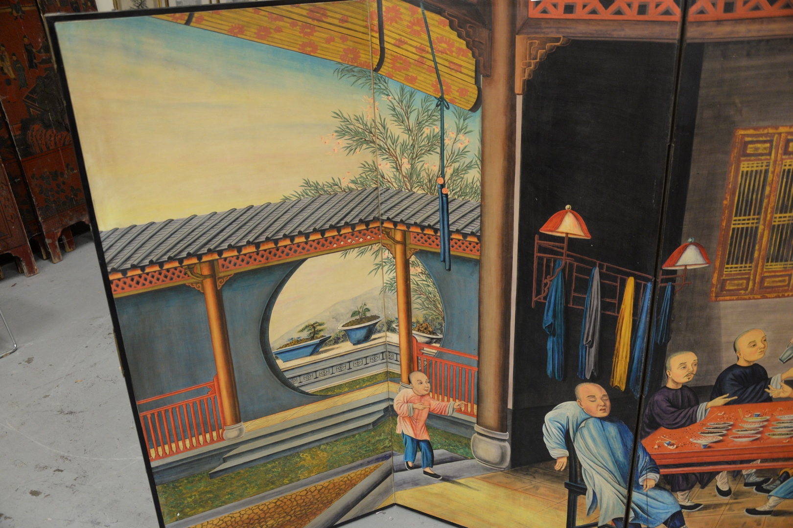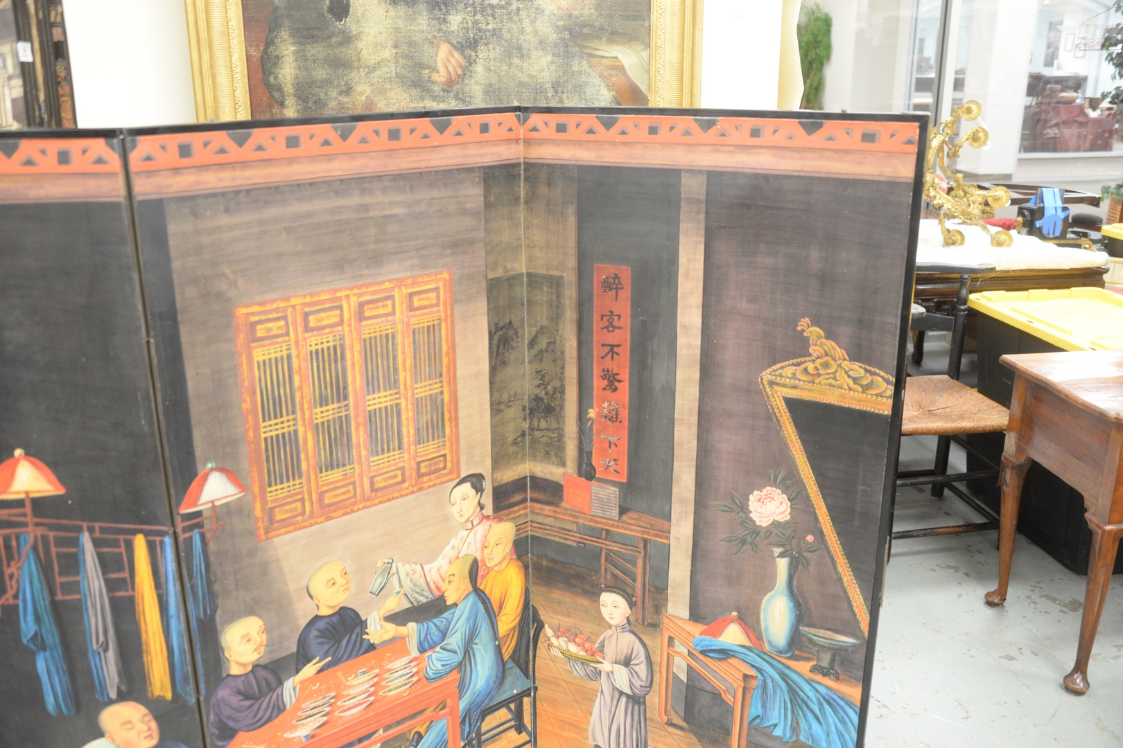 Four Panel Oriental Screen, having painted courtyard scene and interior scene depicting family dinner, height 55 inches, total length 100 inches.