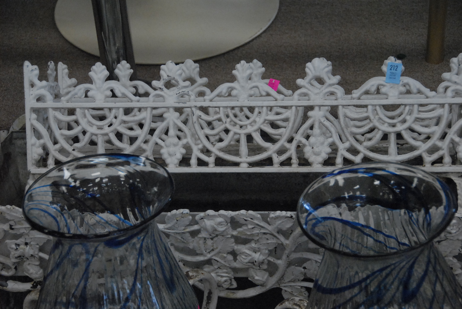 Four piece lot to include two outdoor metal planters and two glass vases on metal stands.