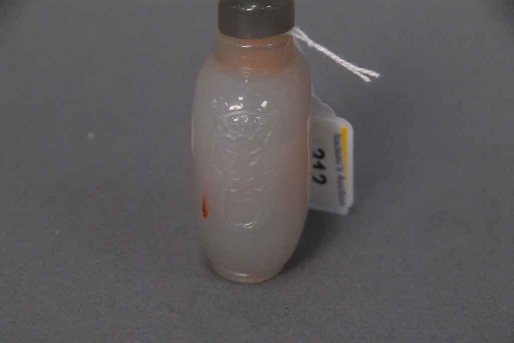 Grey agate master snuff bottle with carved sides, 19th century, ht 3 1/4.