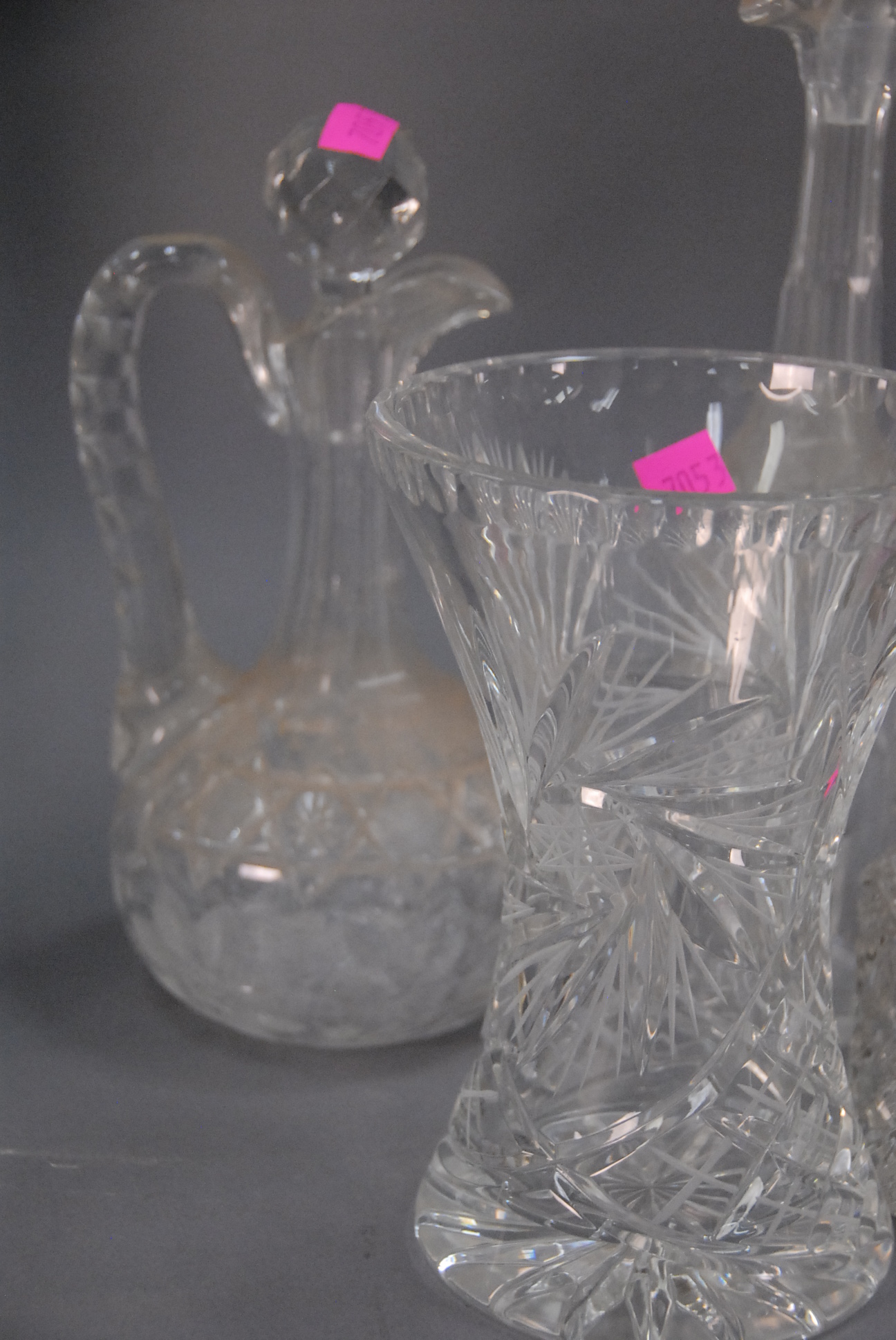 Group of eight cut glass decanters, vases, and bowl.