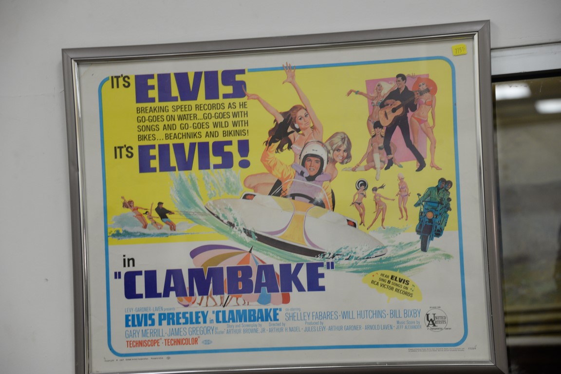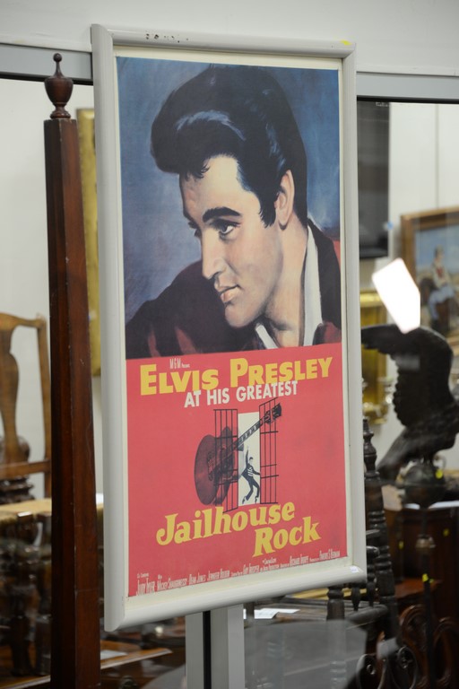 Group of six Elvis Presley one sheet movie poster lithographs including Elvis 69′ Trouble with Girls, Elvis Double Trouble, Elvis Goes West, Its Elvis in Clambake, Elvis Presley Jailhouse Rock, and Elvis banner. largest 40 x 26
