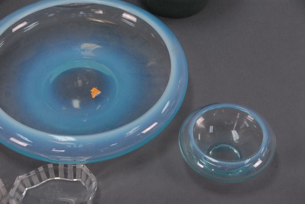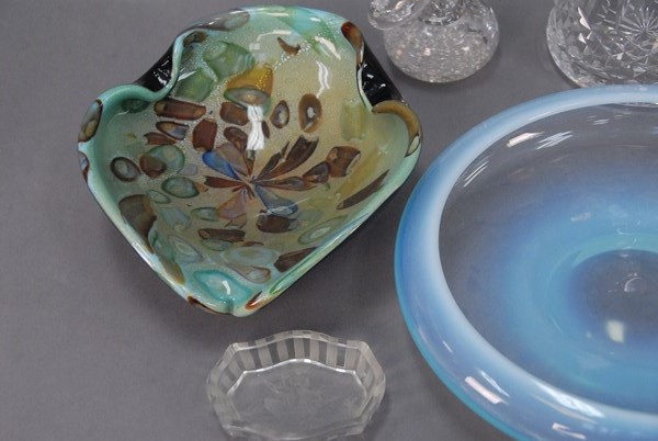 Lot 212: Group to include three art glass bowls, three Hawks dishes, Waterford decanter, Weller green matte vase, and a Capricorn.