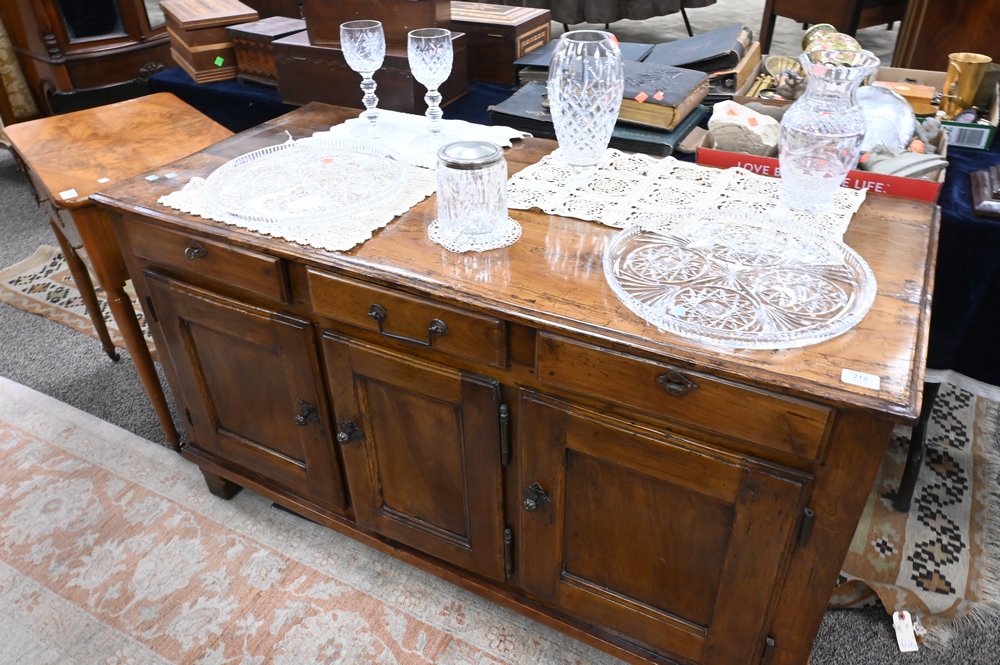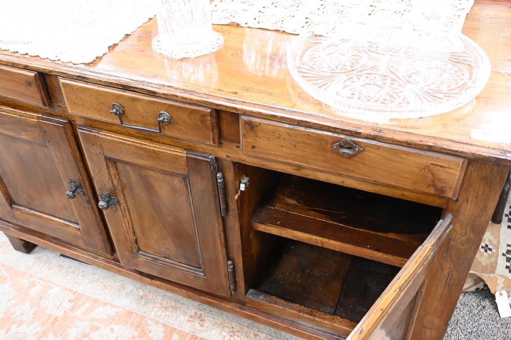 Lot 212: Louis XVI Fruitwood Sideboard, having three drawers and three doors, 18th century, height 30 inches, top 24″ x 53″.