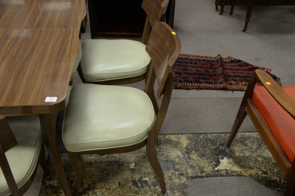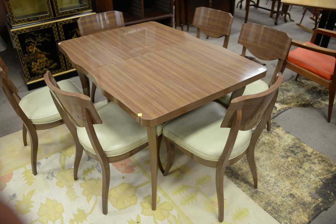 Lot 212: MCM laminate dinette set including a table with one 12 leaf and six chairs. ht. 29 in. top: 34 x 48 opens to 34 x 60.