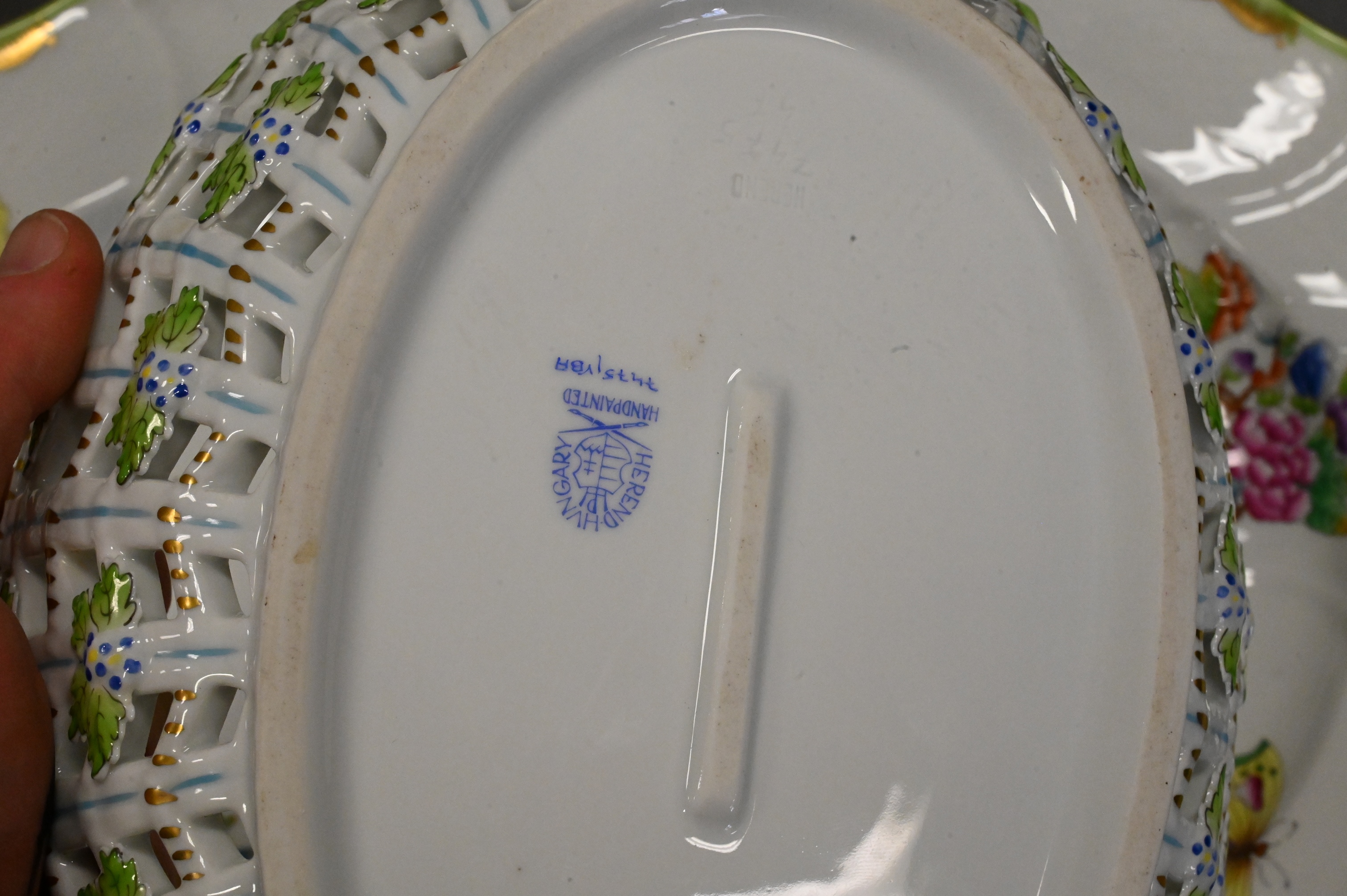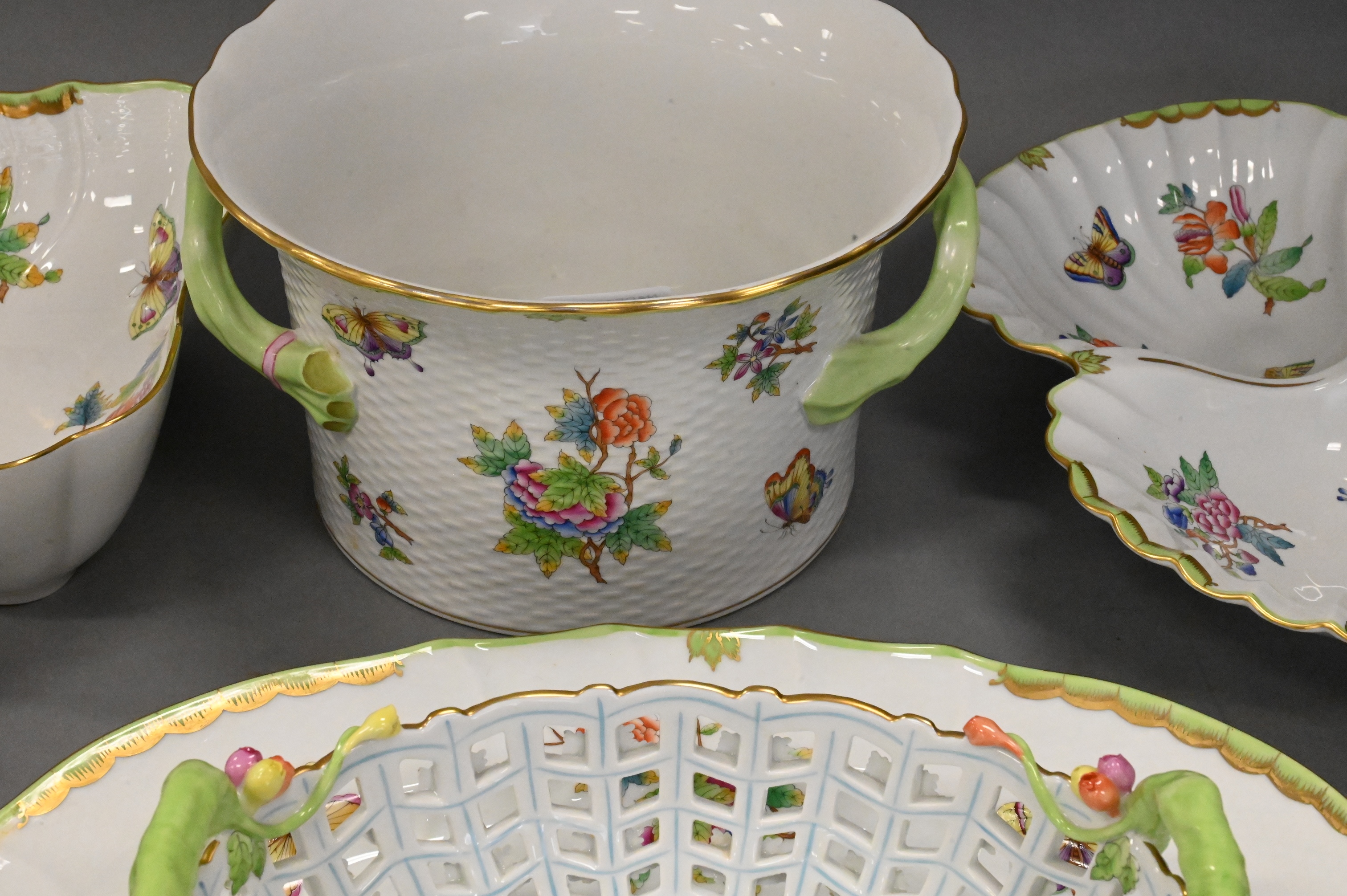 Nine Piece Lot of Herend “Queen Victoria” Porcelain Serving Pieces, to include two trays, a round plate, three bowls, a reticulated basket, along with a two handled pot.