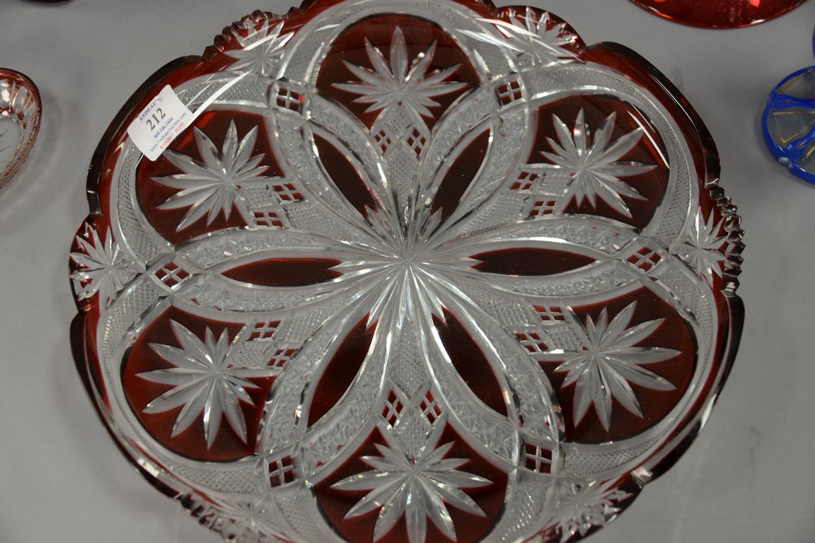 Lot 212: Six crystal pieces to include white, ruby, and blue cut to clear glass, large ruby cut to clear circular tray dia. 13 3/4in., smal…