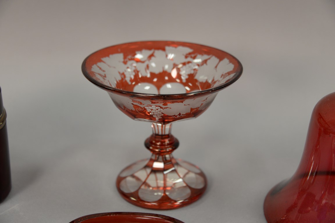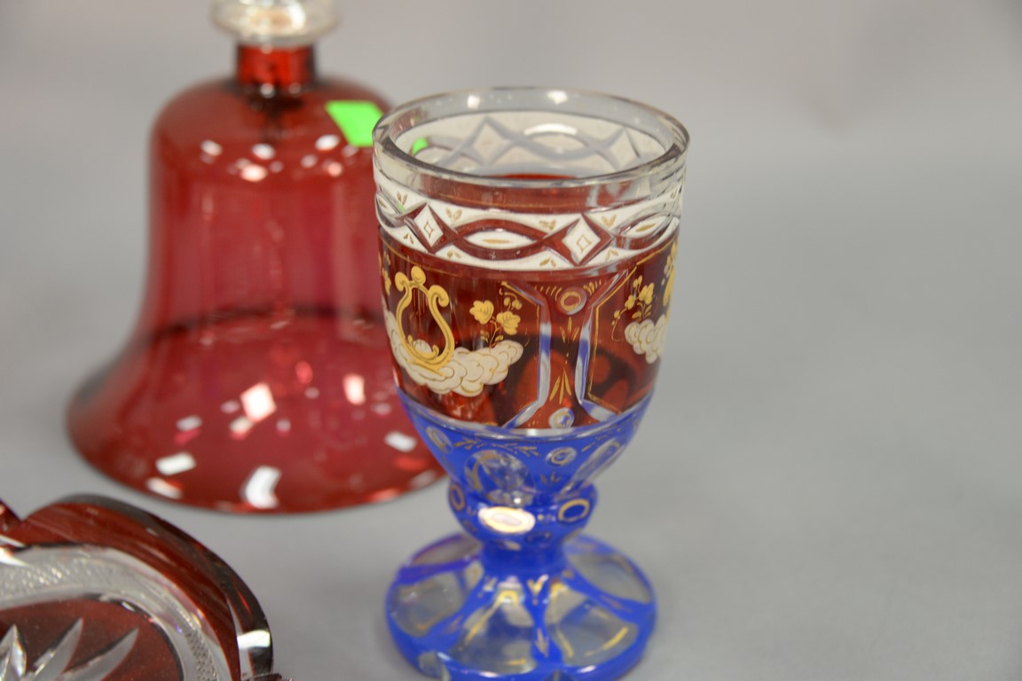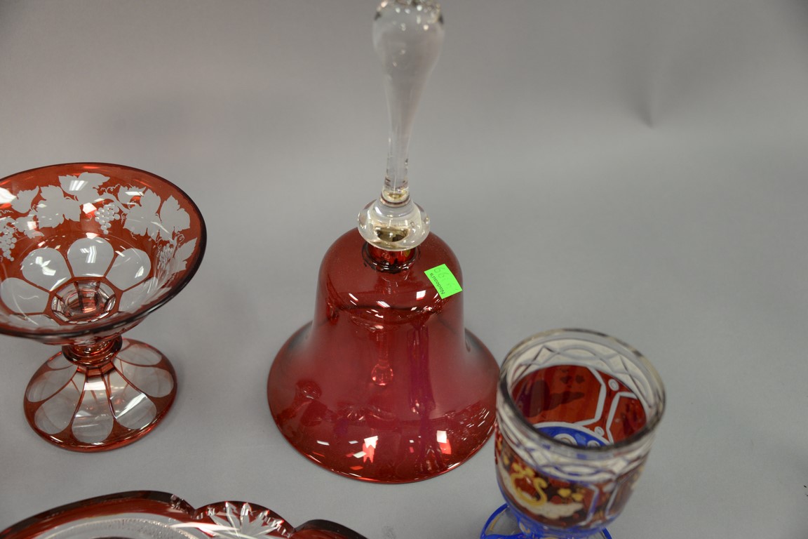 Six crystal pieces to include white, ruby, and blue cut to clear glass, large ruby cut to clear circular tray dia. 13 3/4in., small dish, ruby flash glass Bohemian compote, large ruby and clear glass bell, and ruby box.