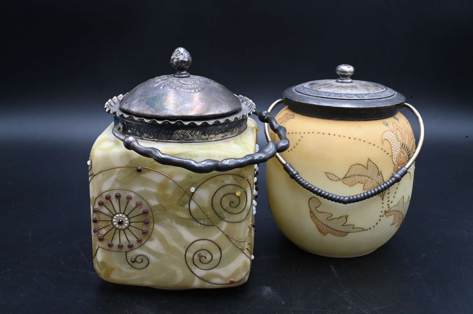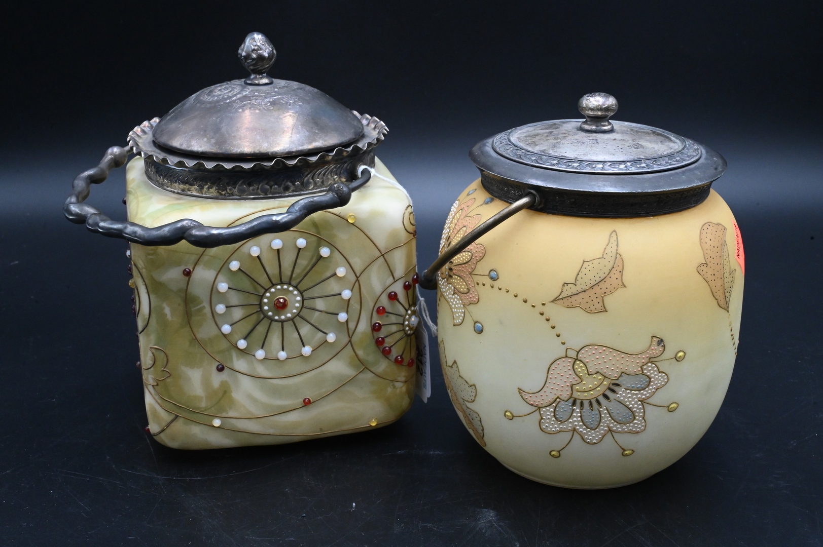 Two Mt. Washington Crown Milano Biscuit Jars, to include Queens pattern having stylized flowers and foliage, burmese color; along with a square form enameled with scroll and floral designs, applied jewels and beads, height 6 inches, height 7 inches. Provenance: From the Estate of Elwyn W. Lemon, Enfield, Connecticut.