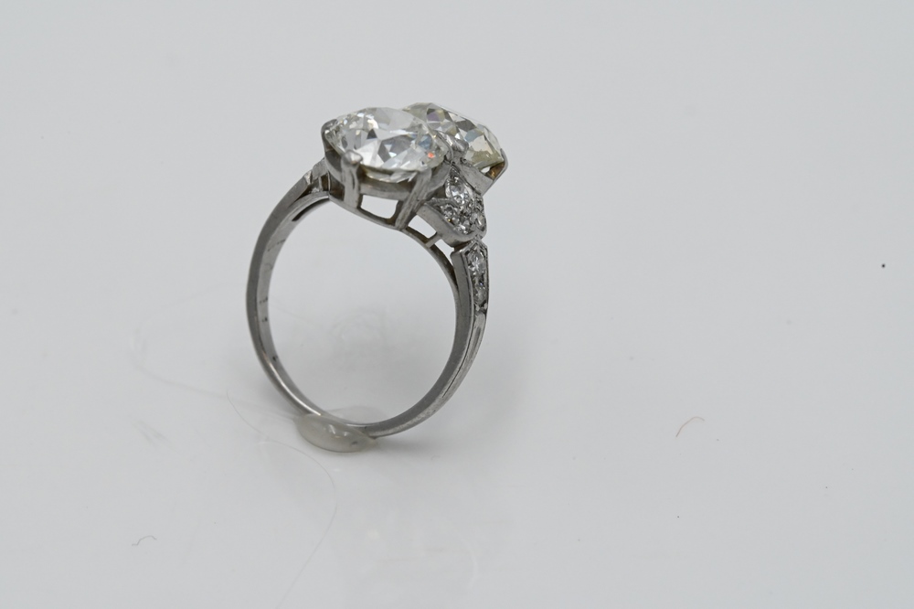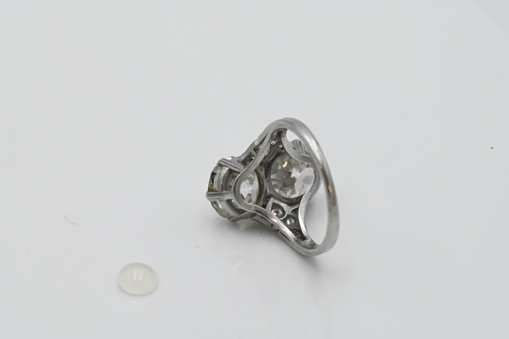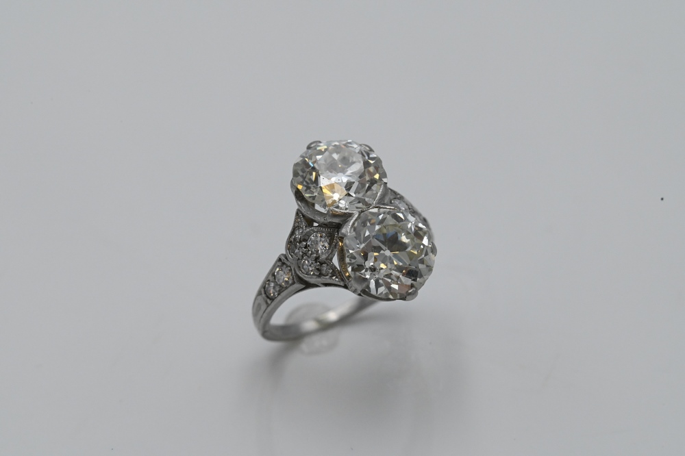 Lot 213: 18 Karat White Gold and Diamond Ring, set with two diamonds, 2.20 carats and 2.07 carats, approximately 8.3 millimeters, size 4 3/4.
