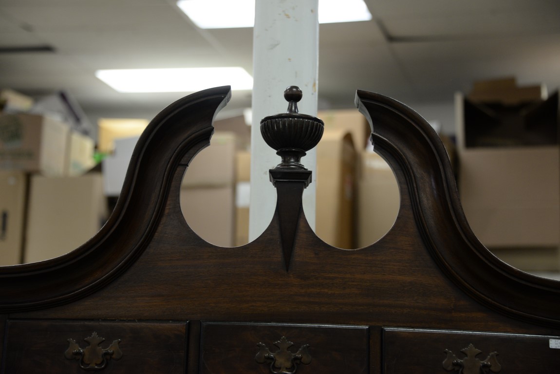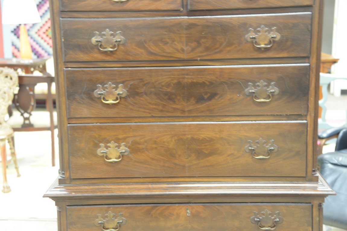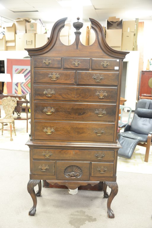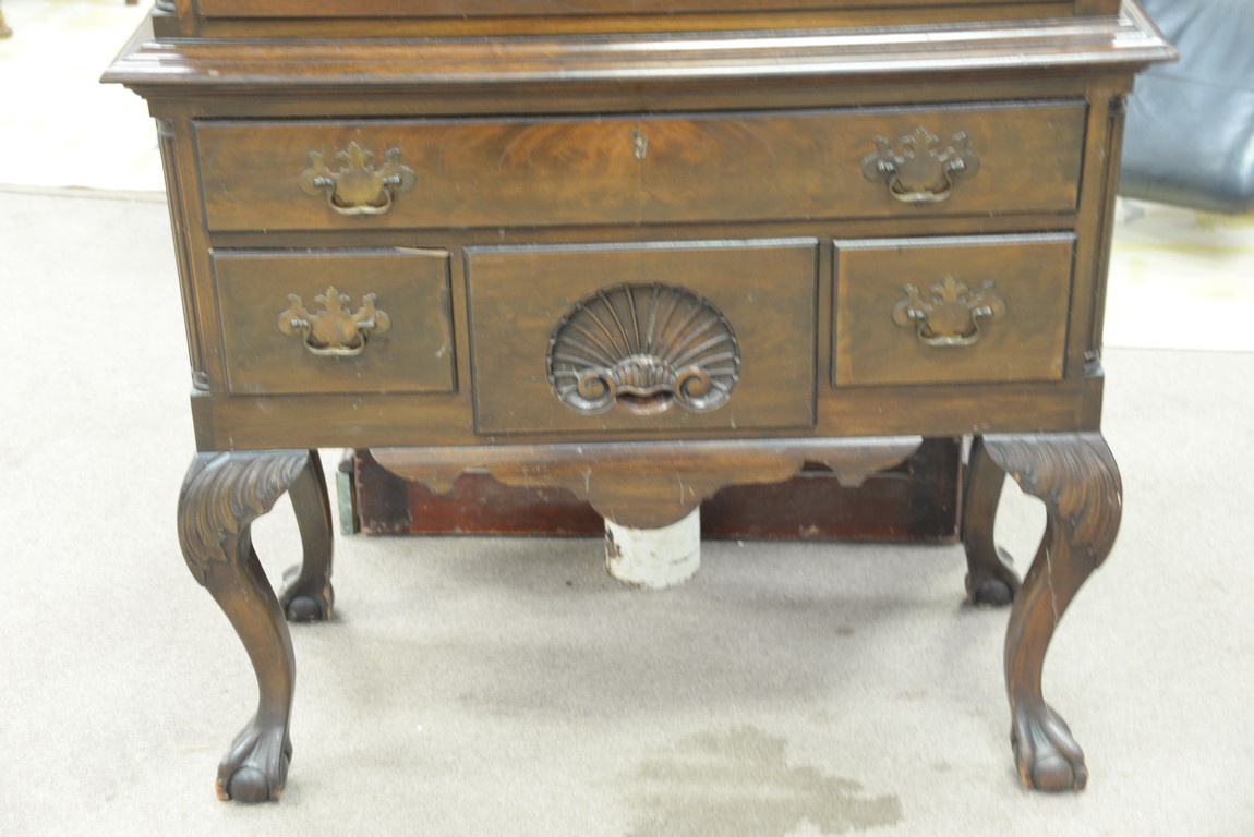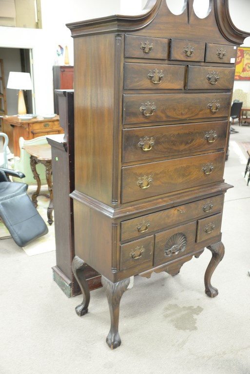 Custom mahogany highboy in two parts with ball and claw feet. ht. 84 in. wd. 36 1/2 in.