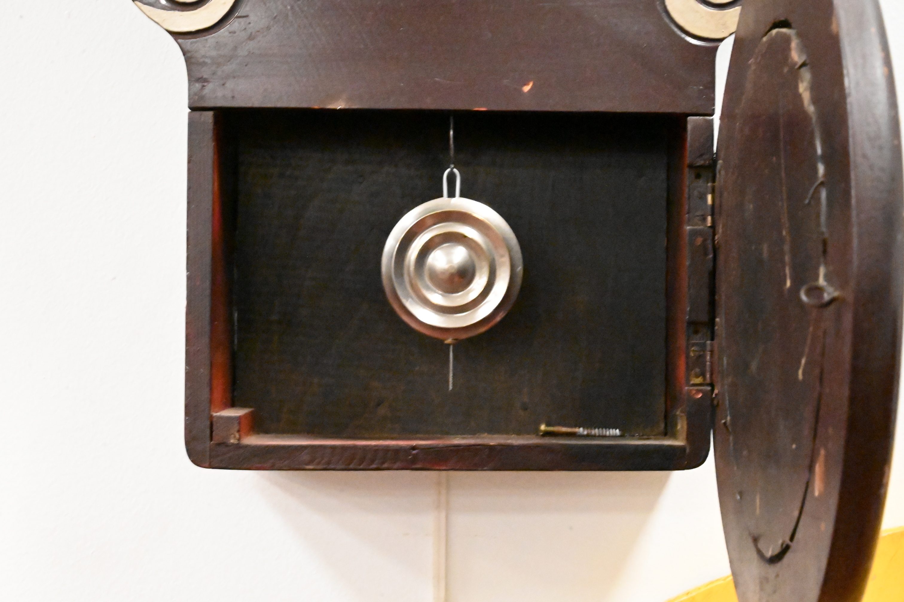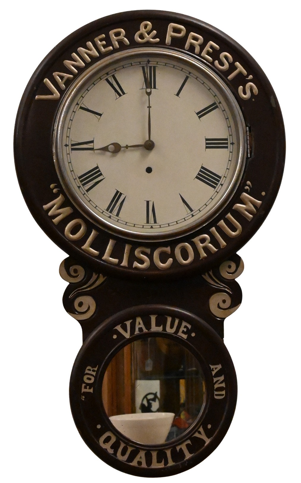 American painted wooden double-dial advertising wall clock for Vanner & Prest’s “Molliscorium,” the surrounding lettering reading “Molliscorium” and “For Value and Quality.” Roman numeral dial with adjacent mirror advertising panel in a shaped painted wall case. key-wind movement with pendulum.