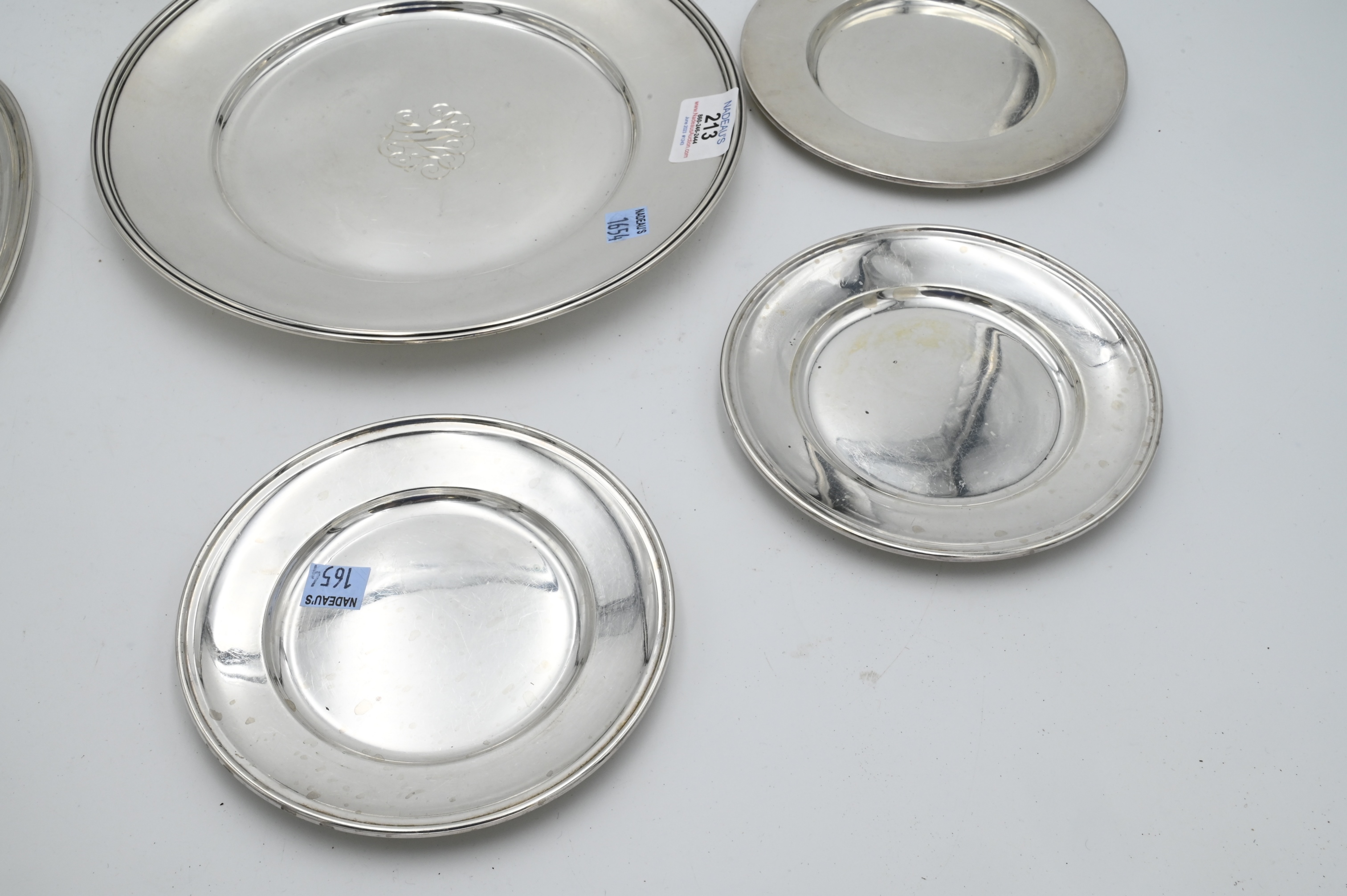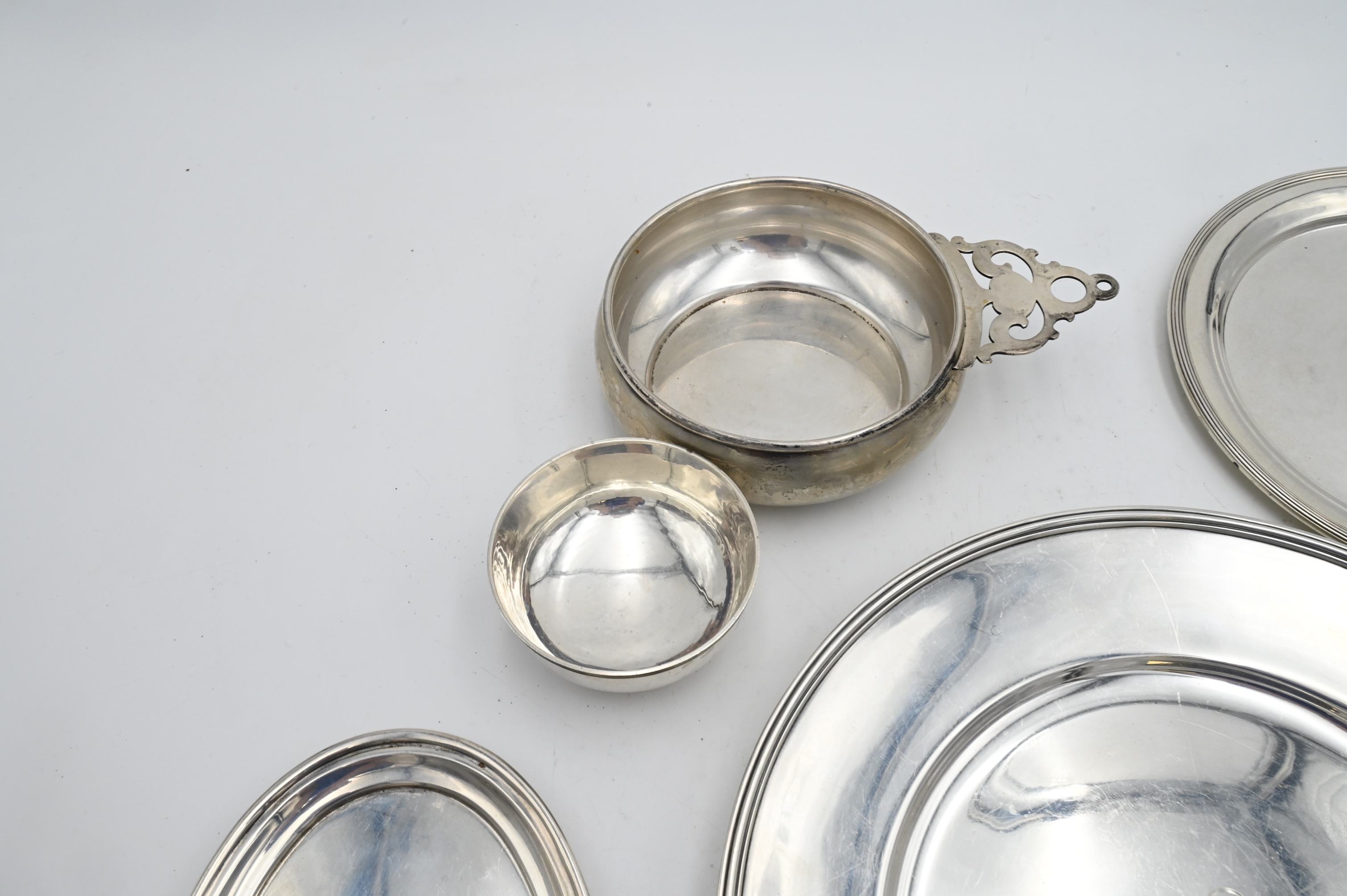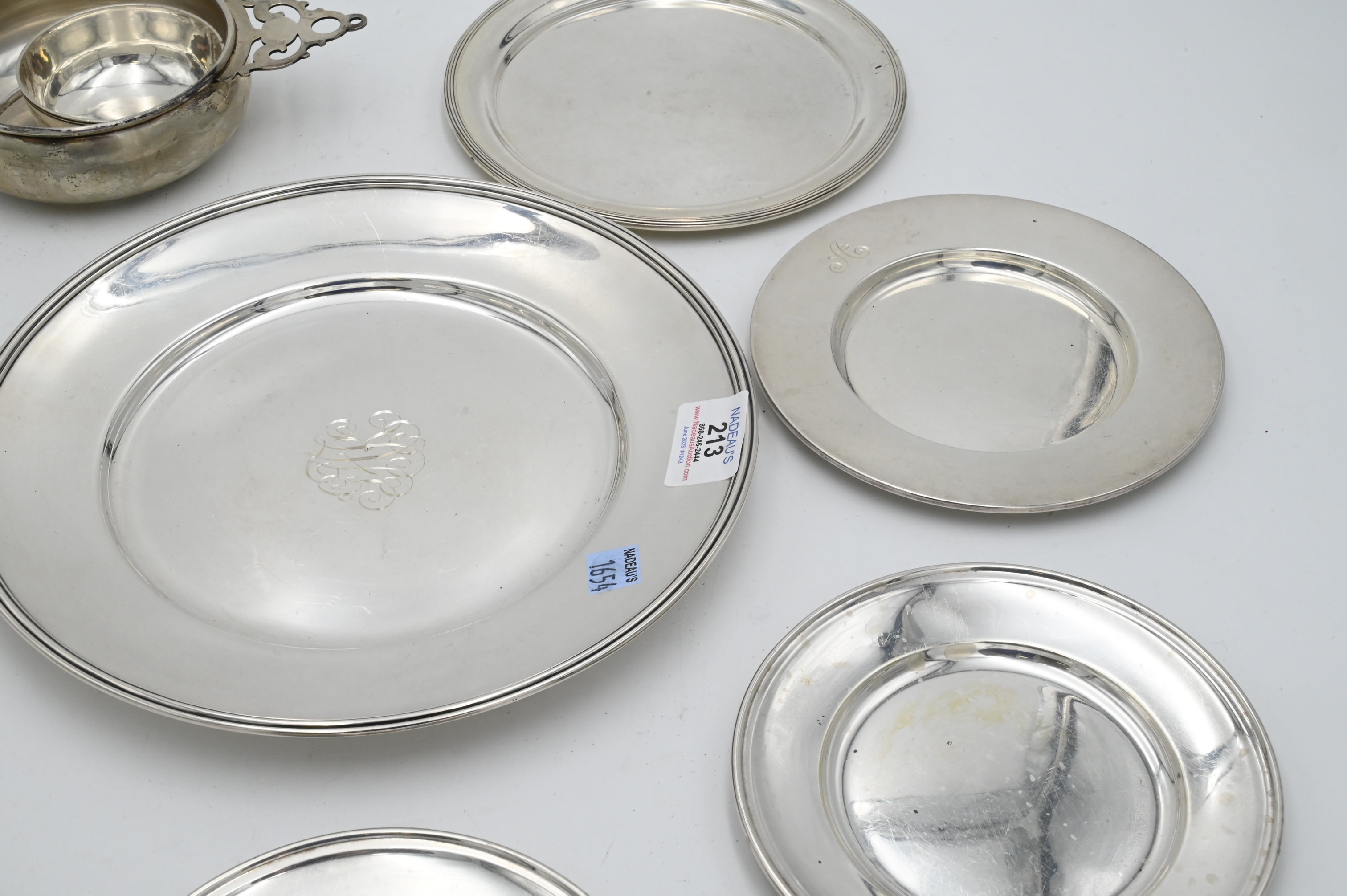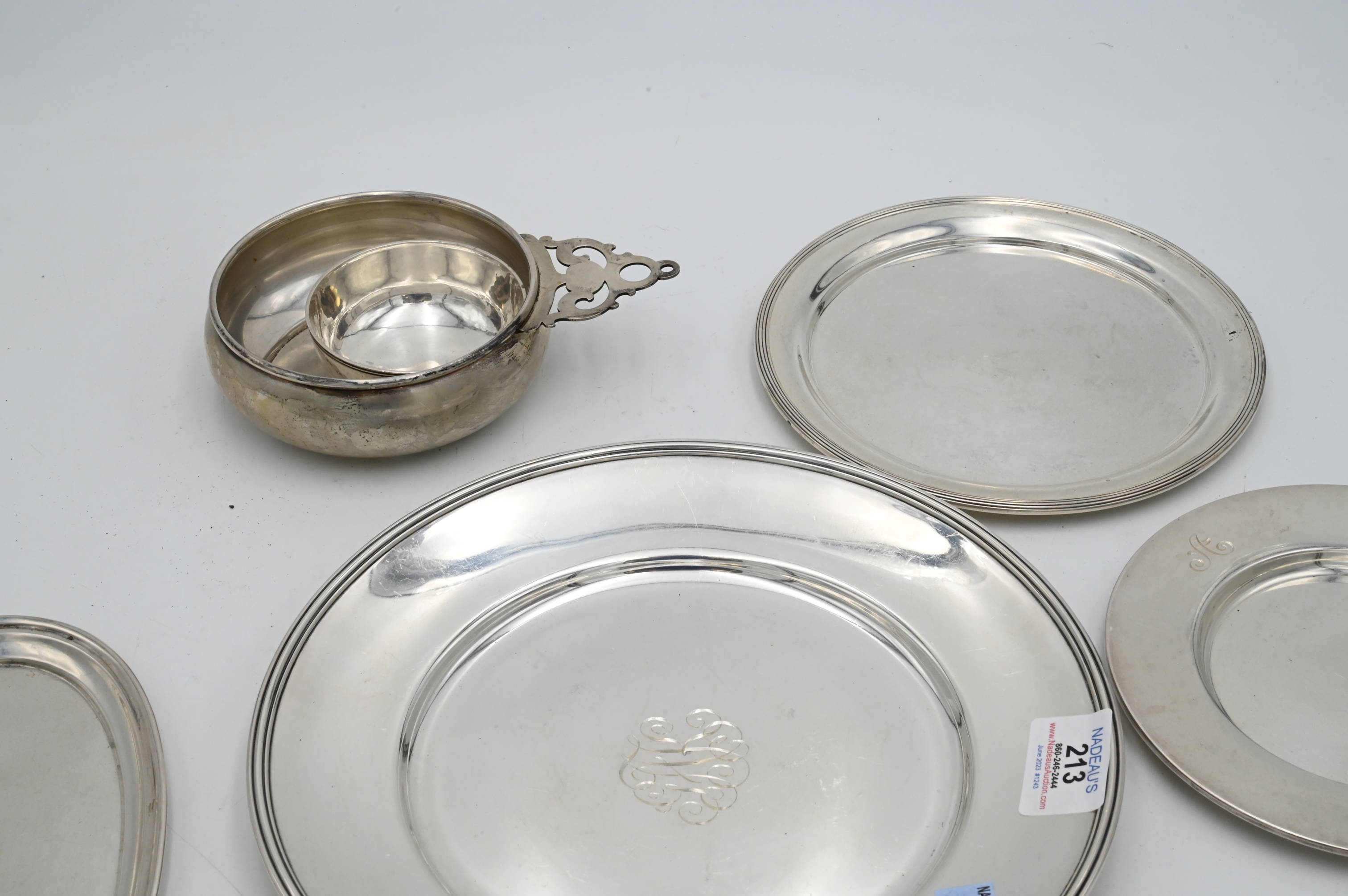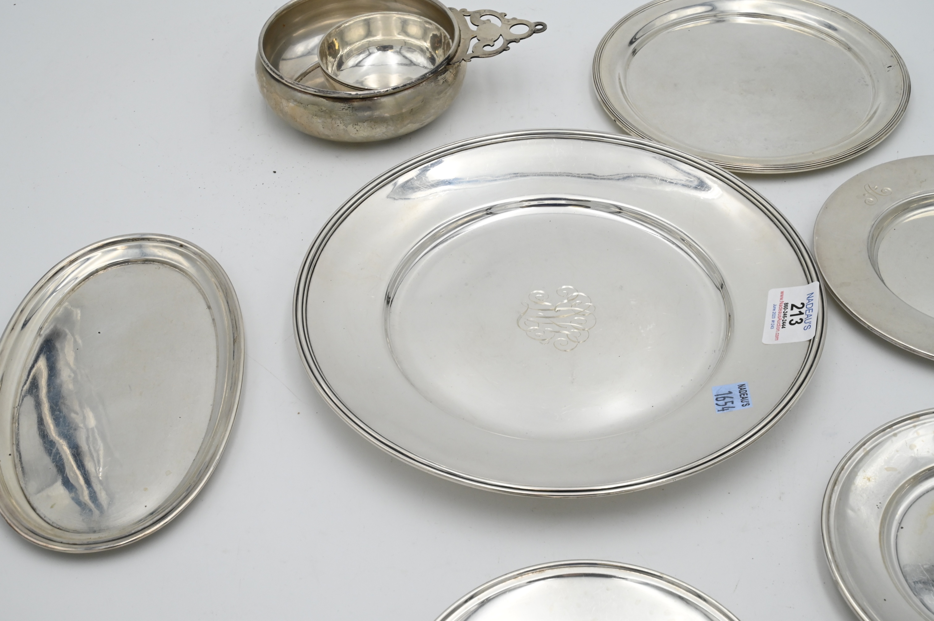 Eight Piece Silver Lot, to include plates, porringer, small cup, largest diameter 10 inches 38.4 t.o.z