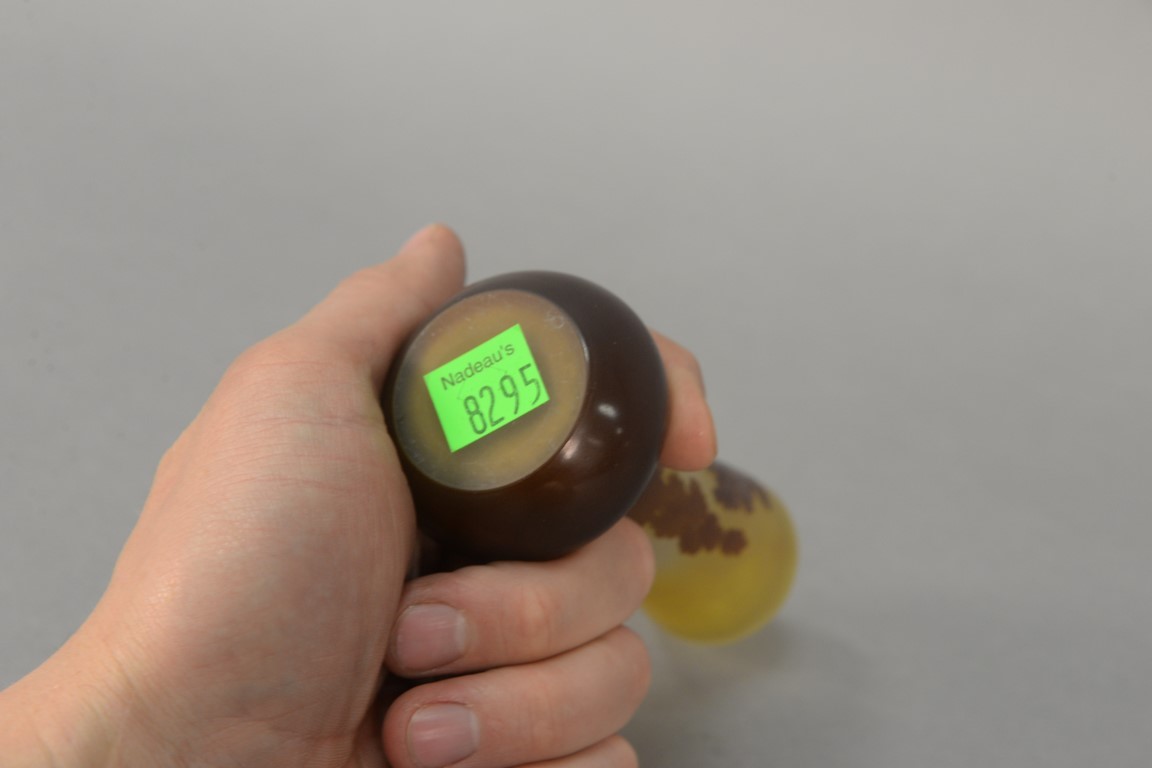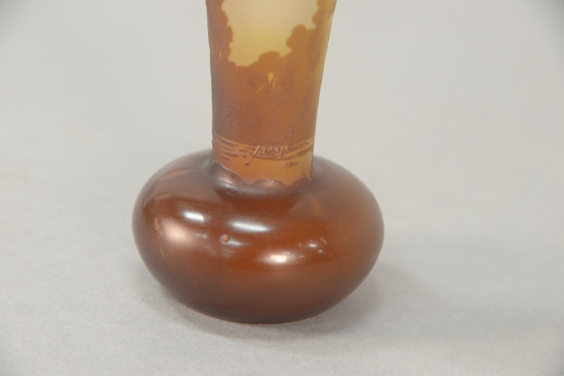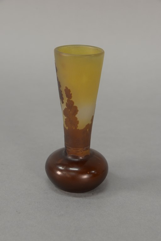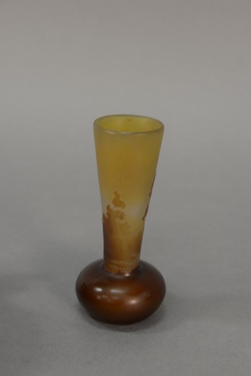 Lot 213: Emile Galle cameo bud vase, overlaid green and brown, etched with lakeside forest. ht. 4 5/8in.