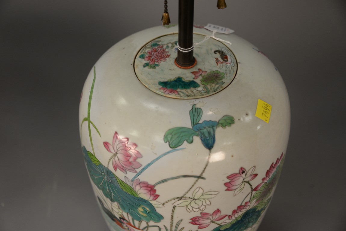 Lot 213: Famille Rose porcelain covered ginger jar with enameled ducks amongst blossoming lotus, made into a table lamp repair to top. vase ht. 12 in. total ht. 25 in.
