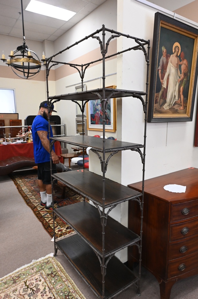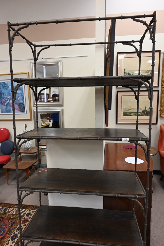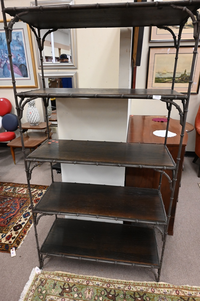 Faux Bamboo Etagere, having wood shelves and five tiers, height 80 inches, width 35 inches, depth 16 inches.