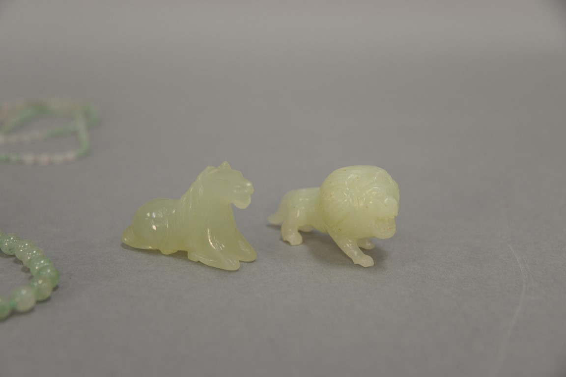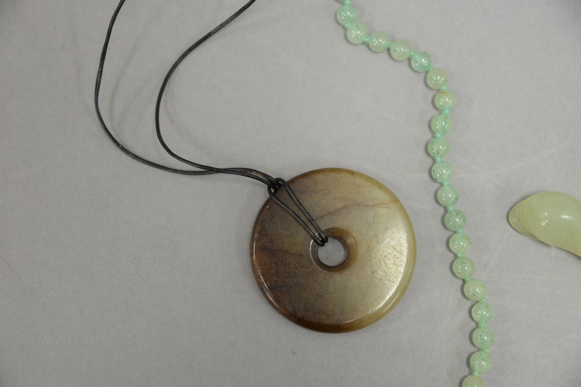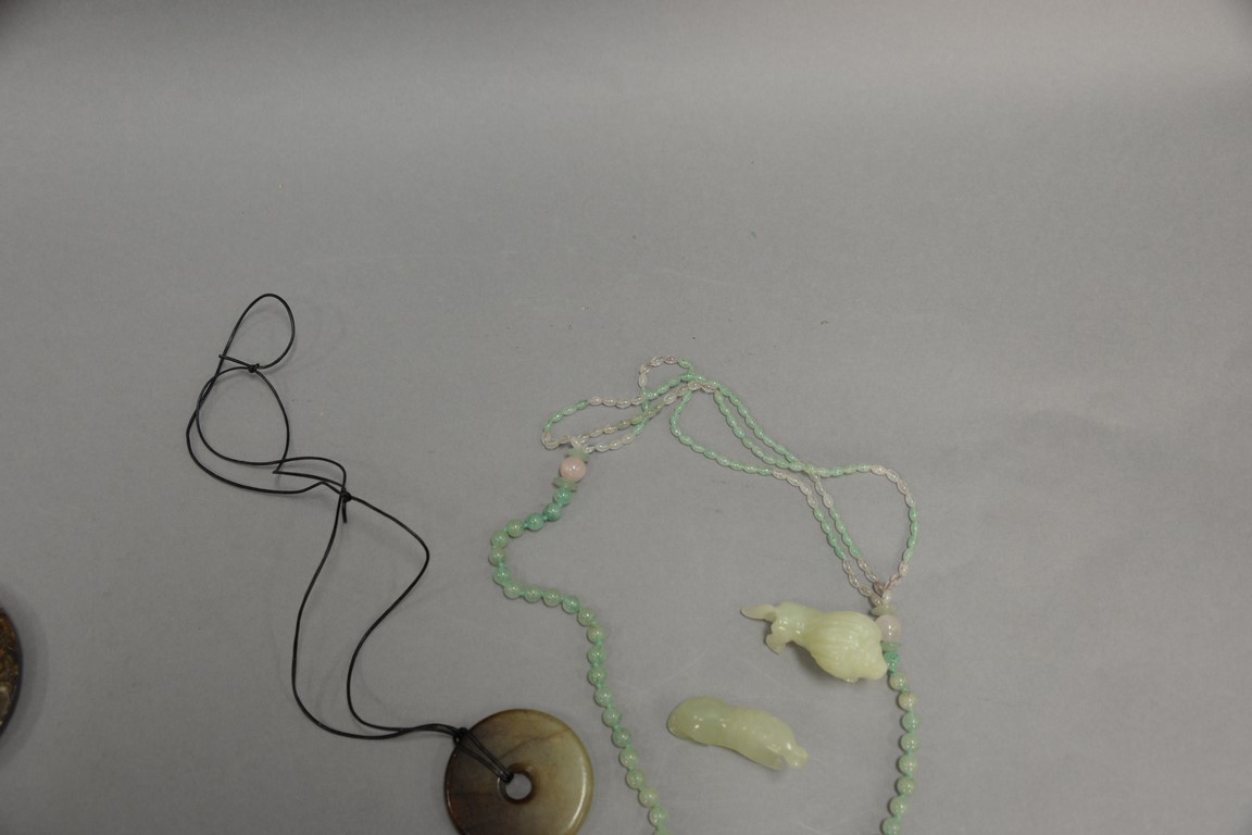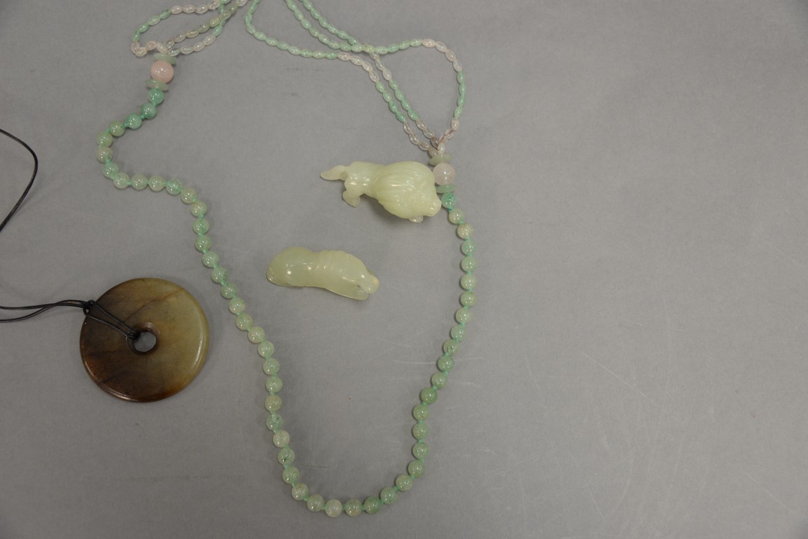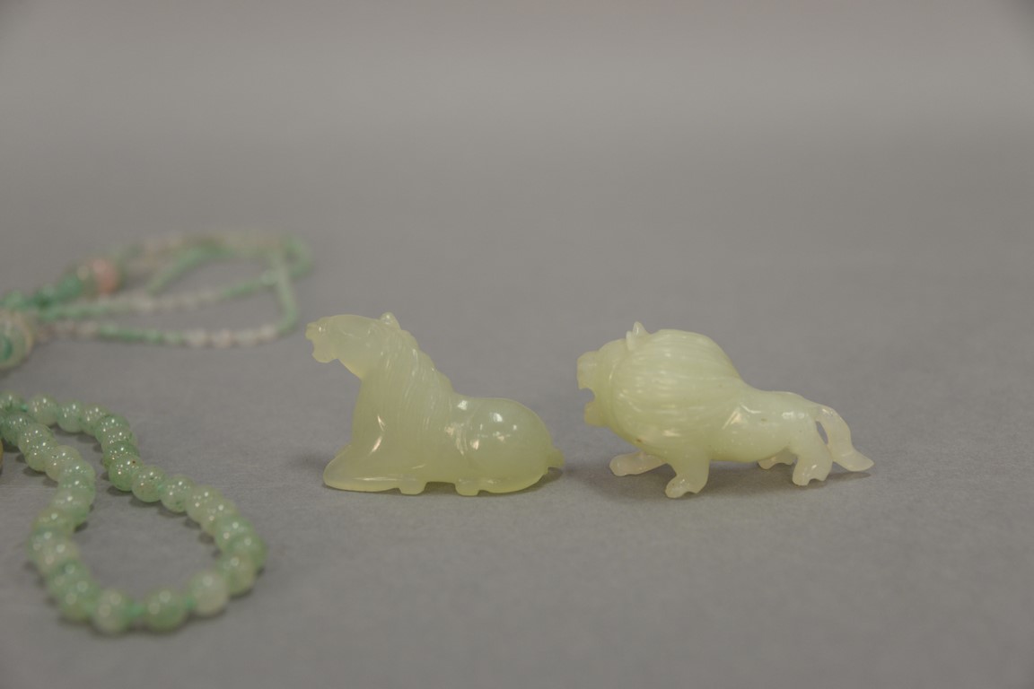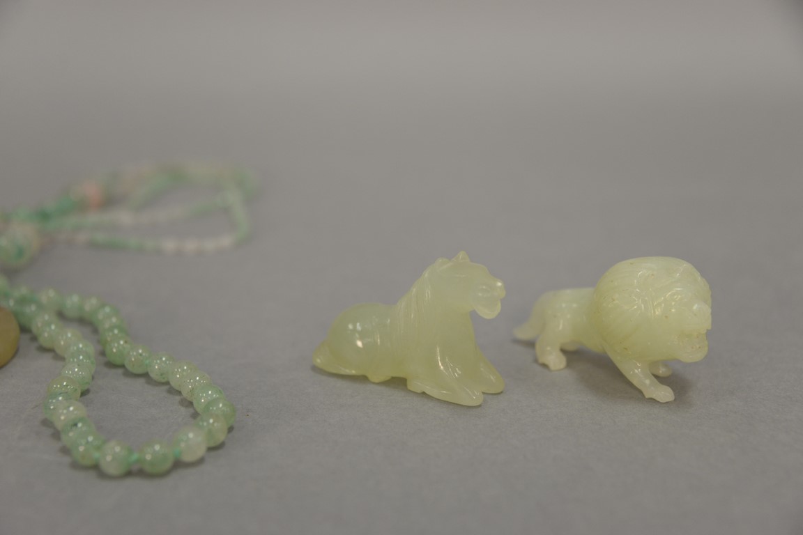 Four Chinese hardstone piecest to include two carved jade animals, necklace, and a hardstone disc.