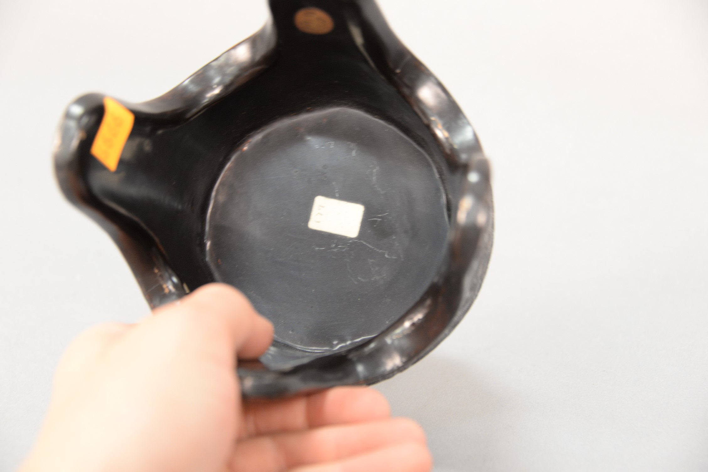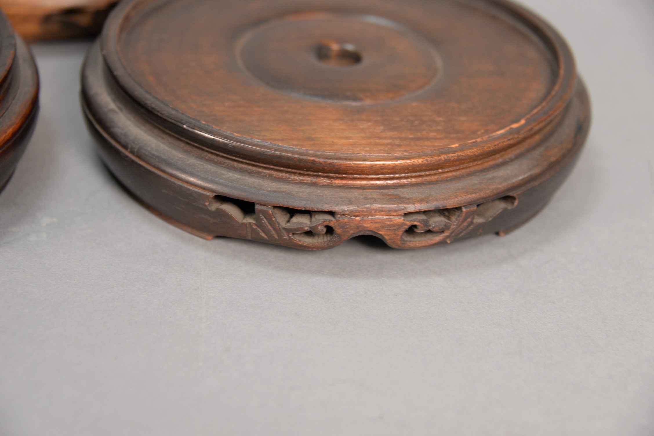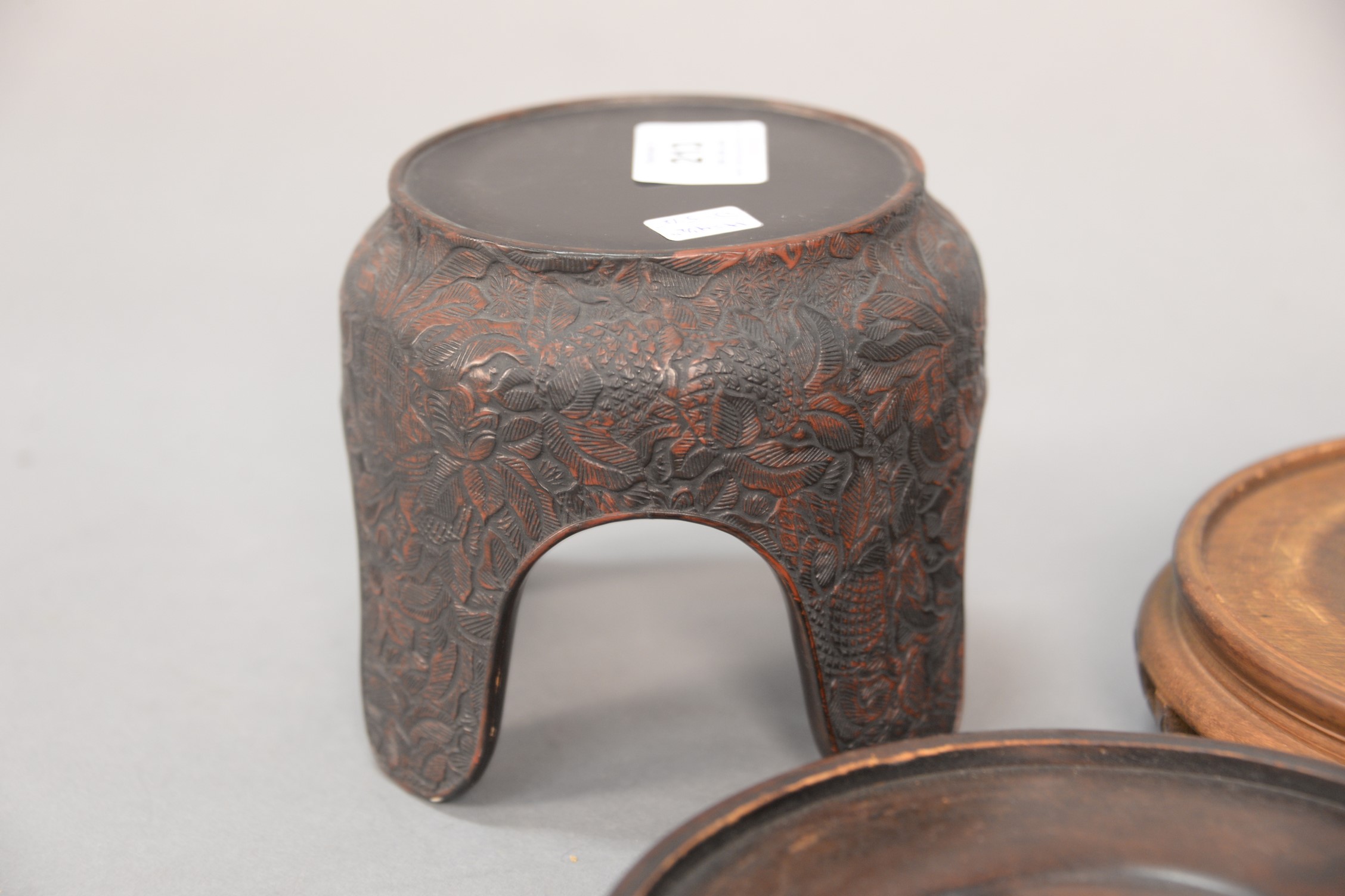Four piece lot to include a 19th/20th century Chinese dark cinnabar stand for vase and three round Chinese hardwood stands. cinnabar stand: ht. 4 1/ 2in. dia. 5 1/2 in. and ht. 1 1/2 in. dia. 6 1/2 in.