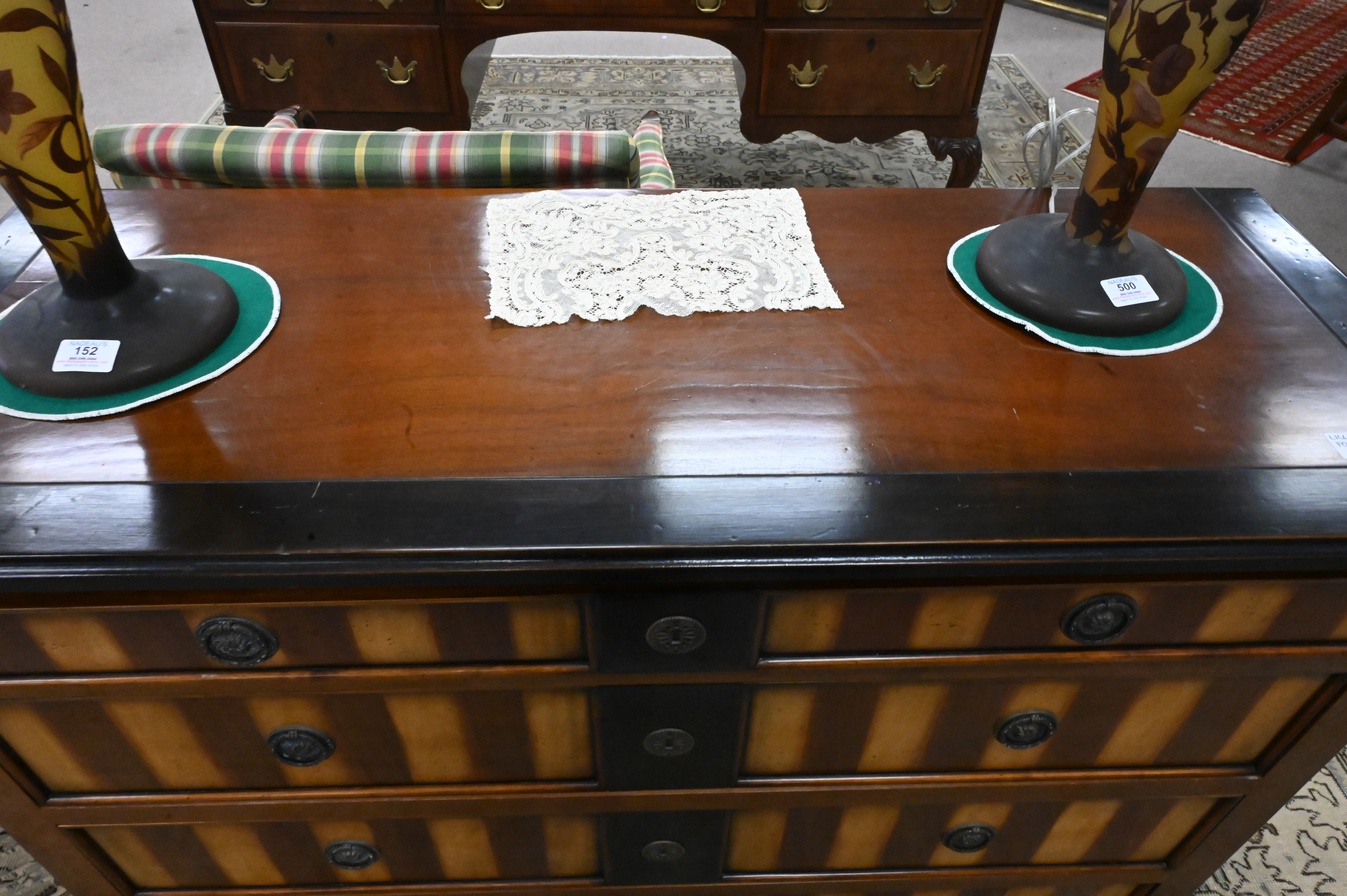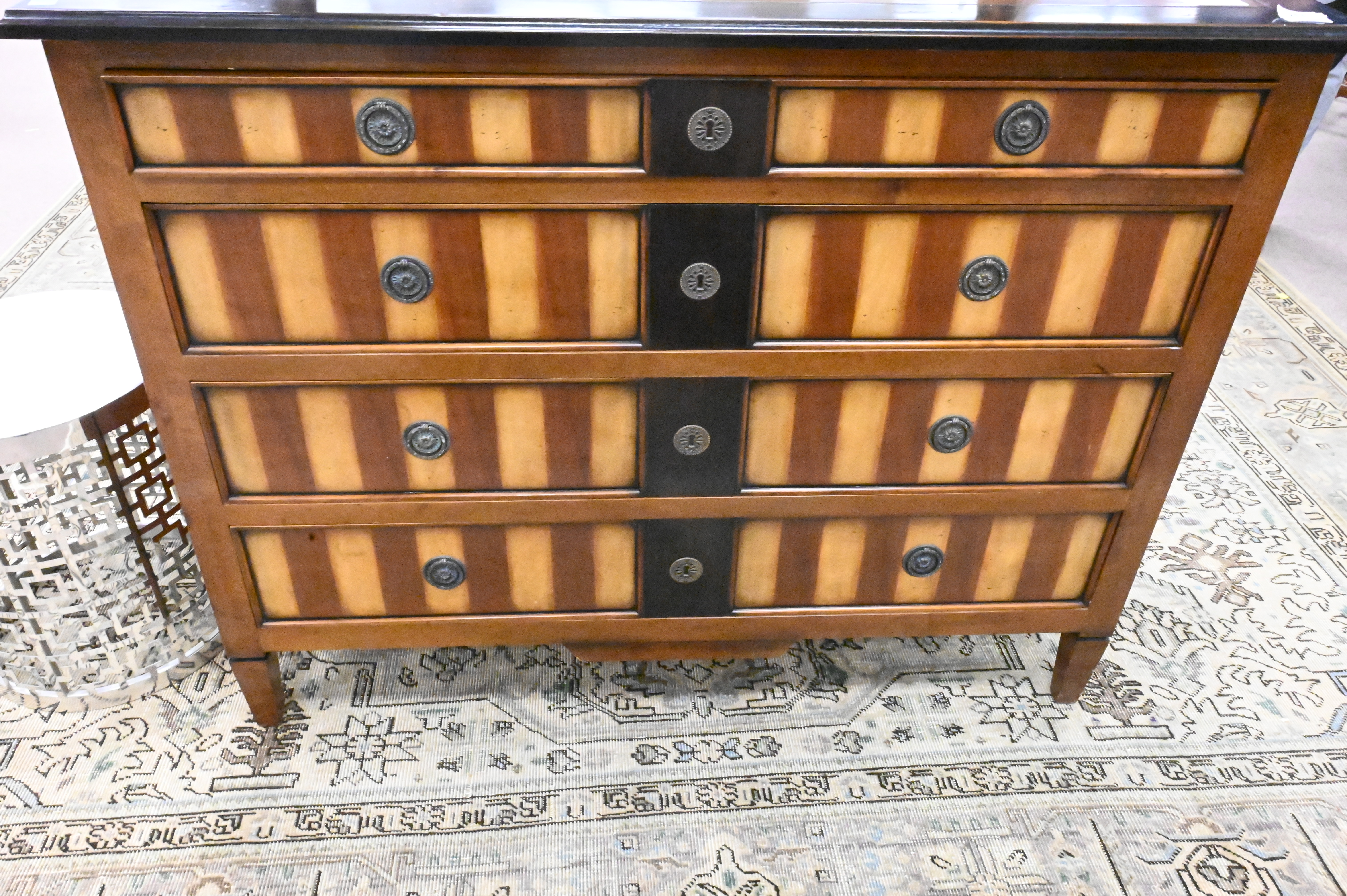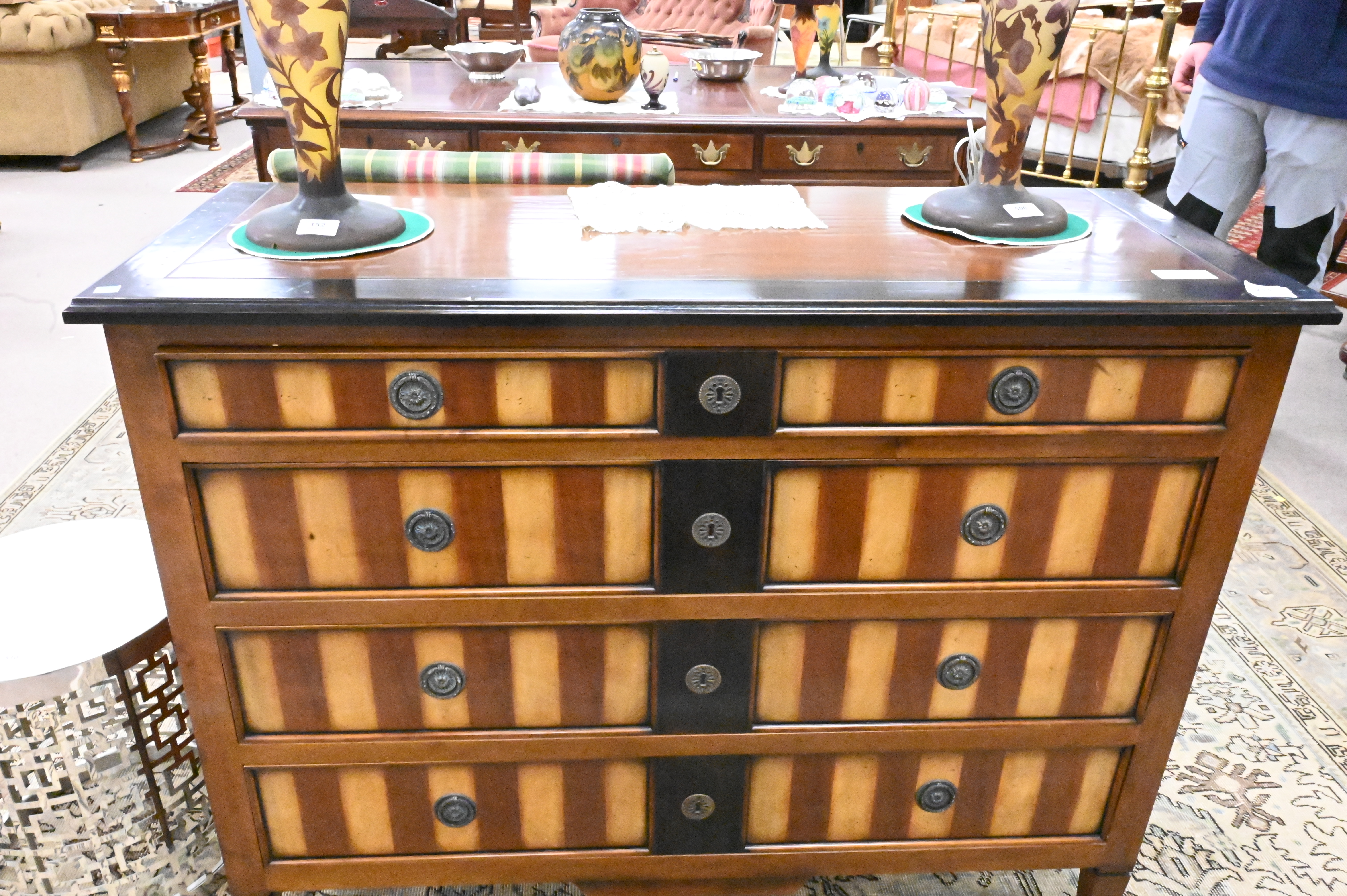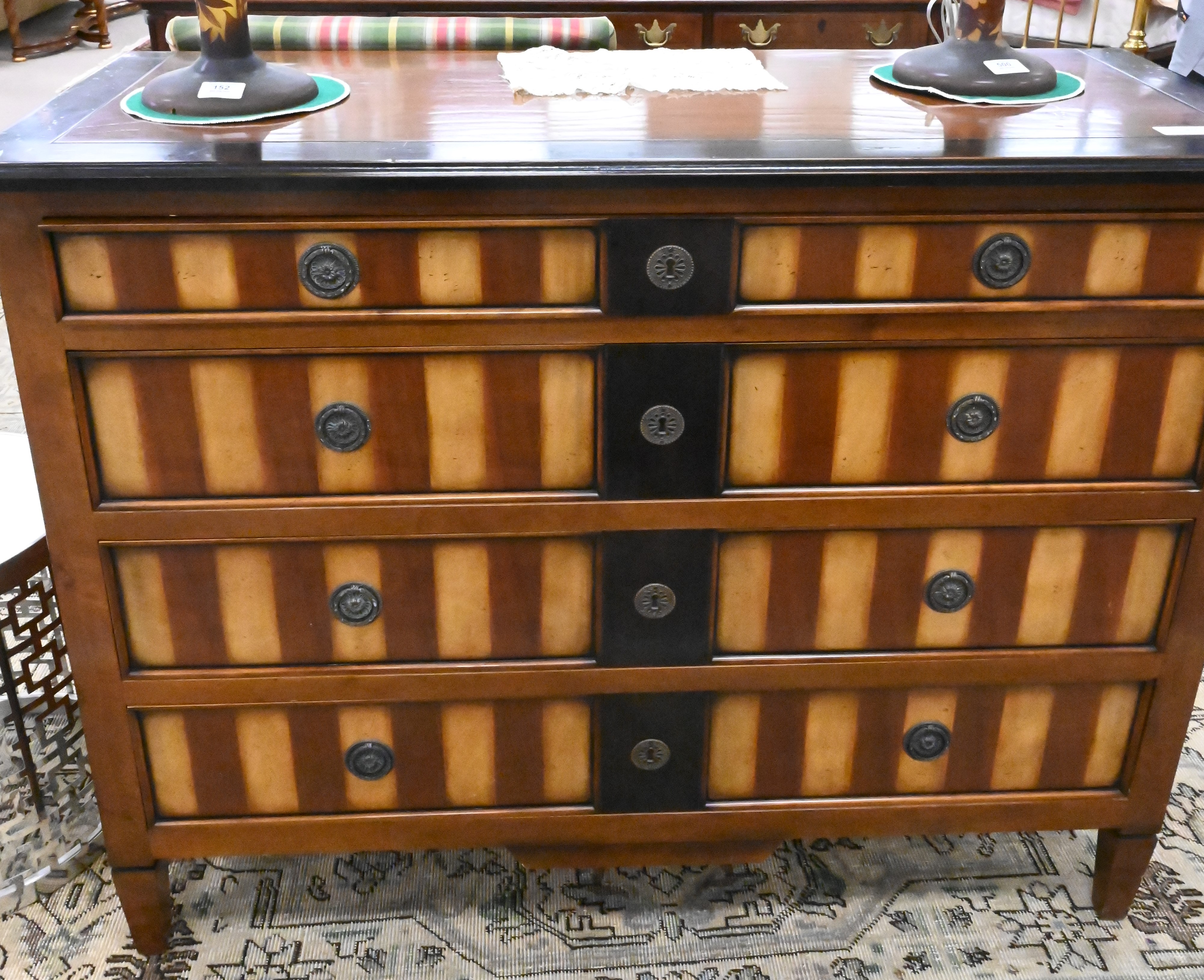 Lillian August Four Drawer Fruitwood Chest, having decorated drawer fronts, height 35 inches, top 17 1/2″ x 45″.