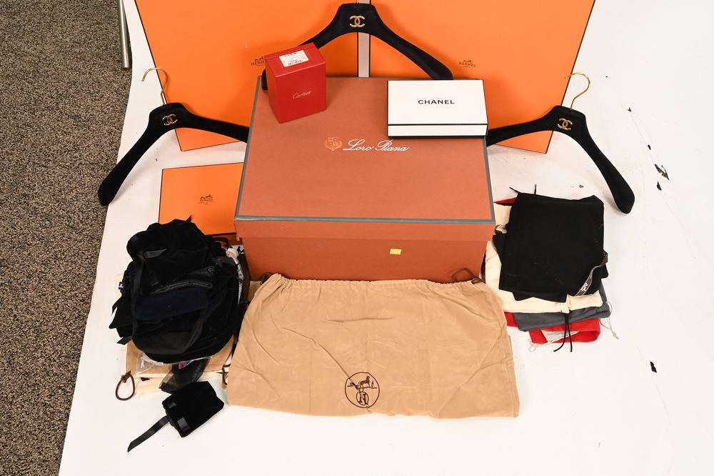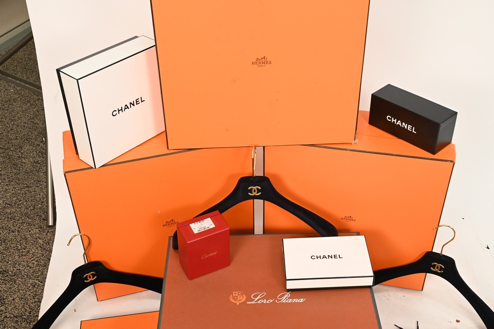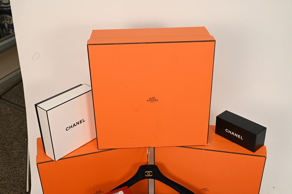 Miscellaneous Lot of Designer Boxes, Bags and Hangers, to include large Hermes hat box, Hermes brown ribbon, medium Hermes box, five Chanel boxes, leather sunglass case, Cartier box, along with five Chanel hangers, various sizes, large Hermes box has one split in top, otherwise in good condition.
