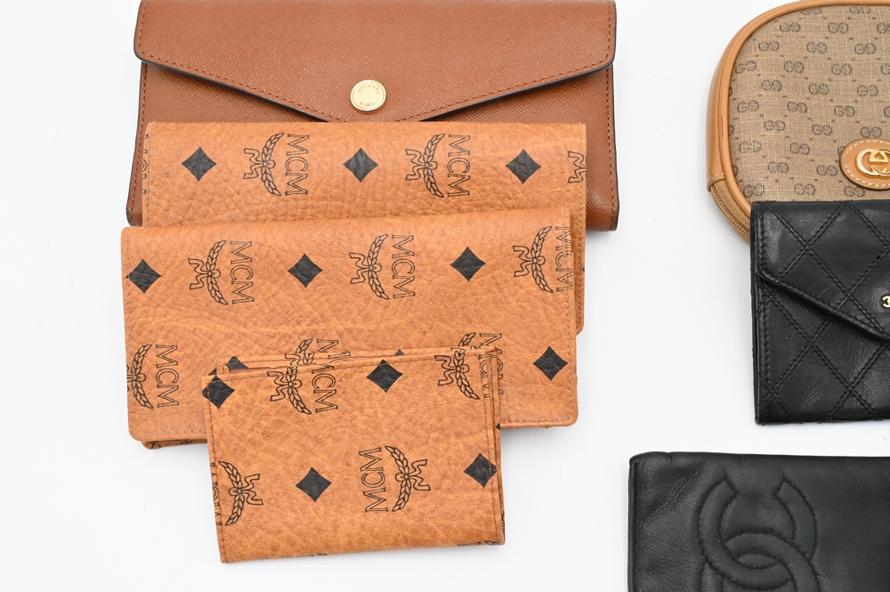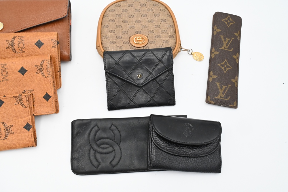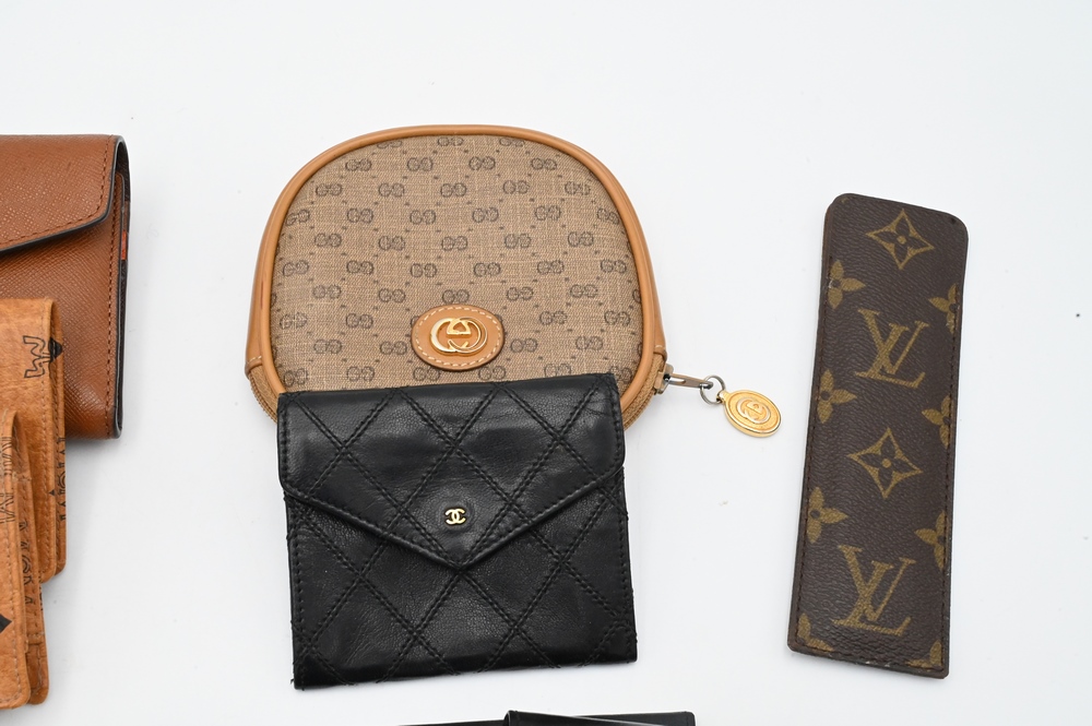 Nine Piece Leather Couture Lot, to include a Louis Vuitton comb holder, a Gucci purse, Chanel change purse, Chanel eyeglass holder, Mark Cross wallet, Michael Kors wallet, along with a three piece MCM set.