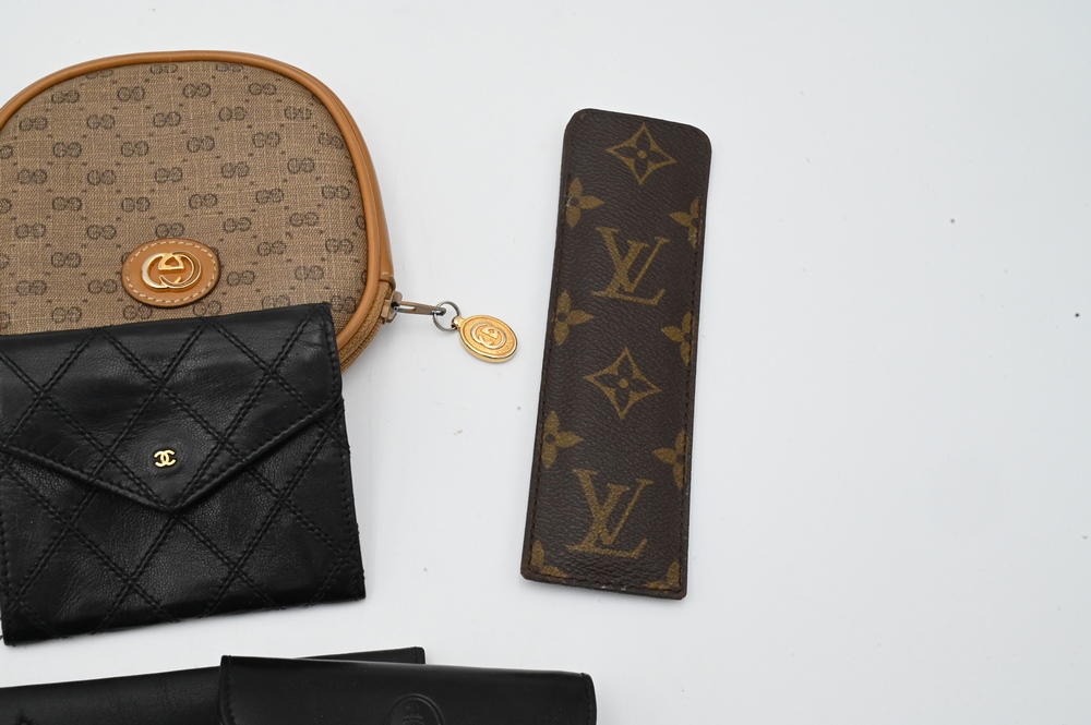 Lot 213: Nine Piece Leather Couture Lot, to include a Louis Vuitton comb holder, a Gucci purse, Chanel change purse, Chanel eyeglass holder,…