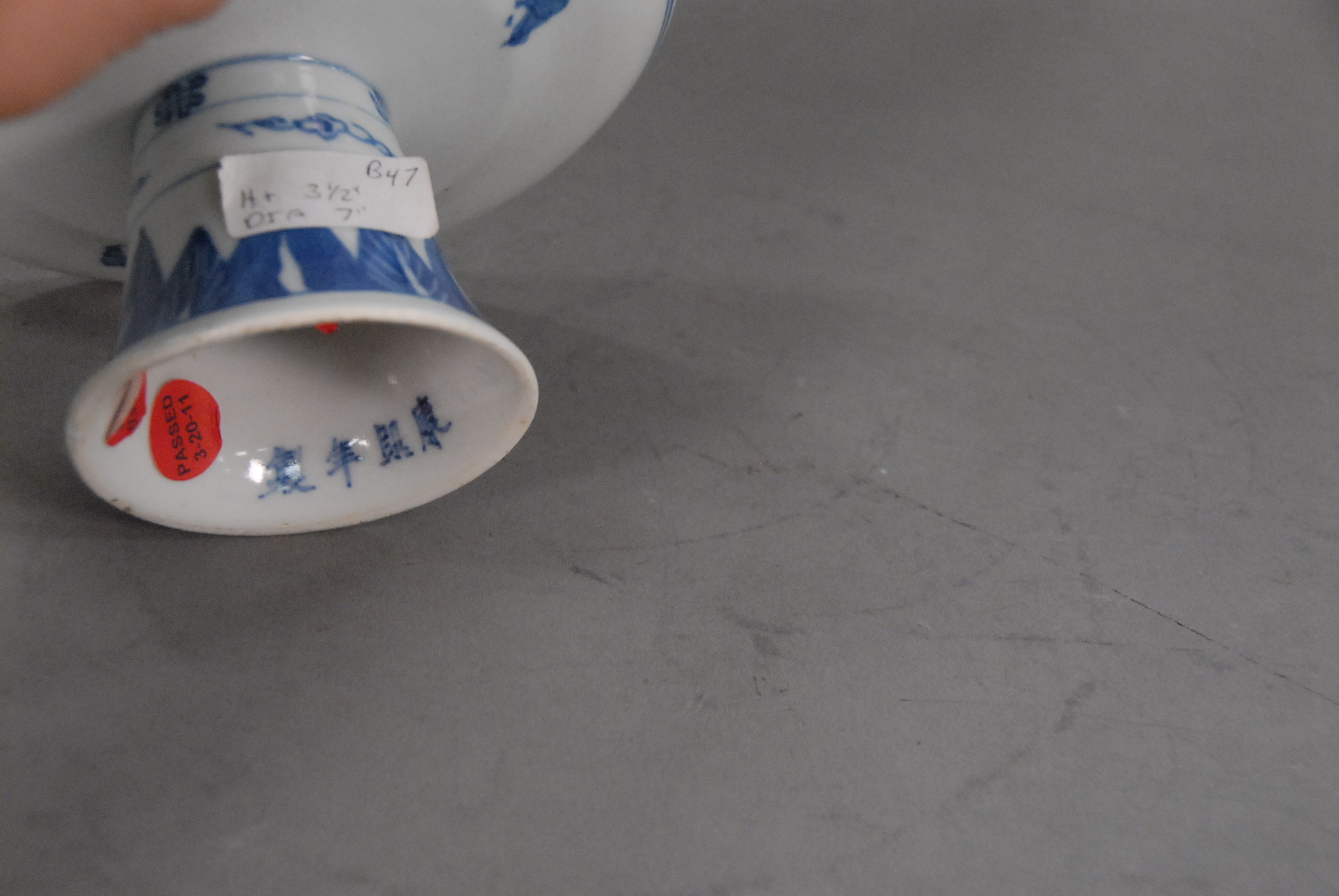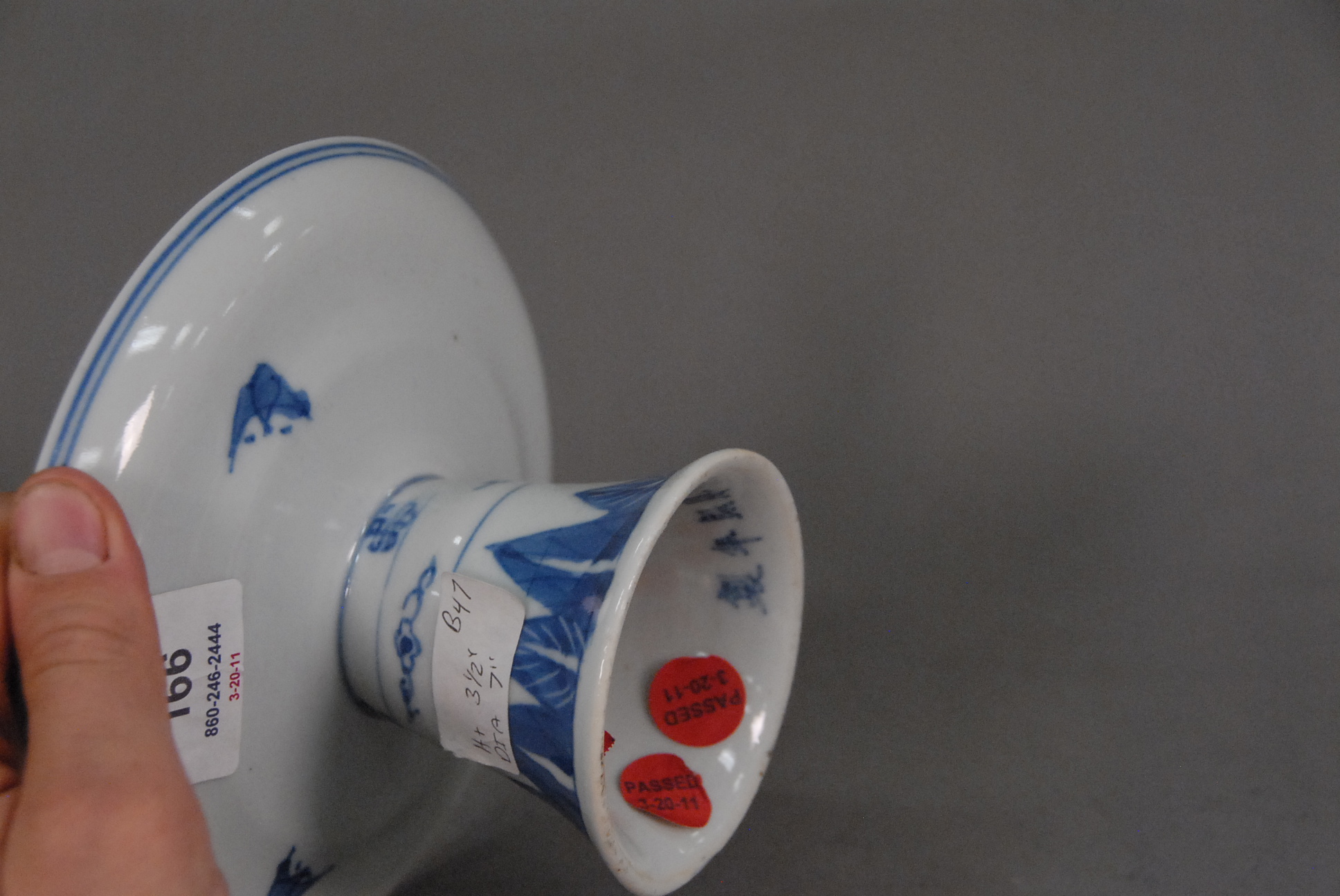 Oriental porcelain blue and white stemmed plate having a bat decoration.