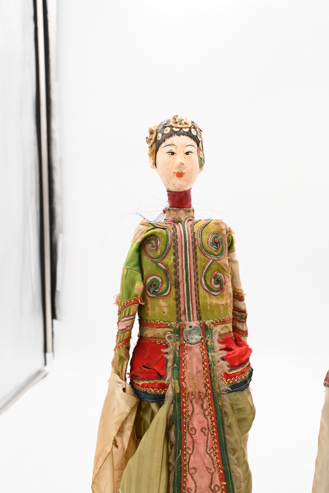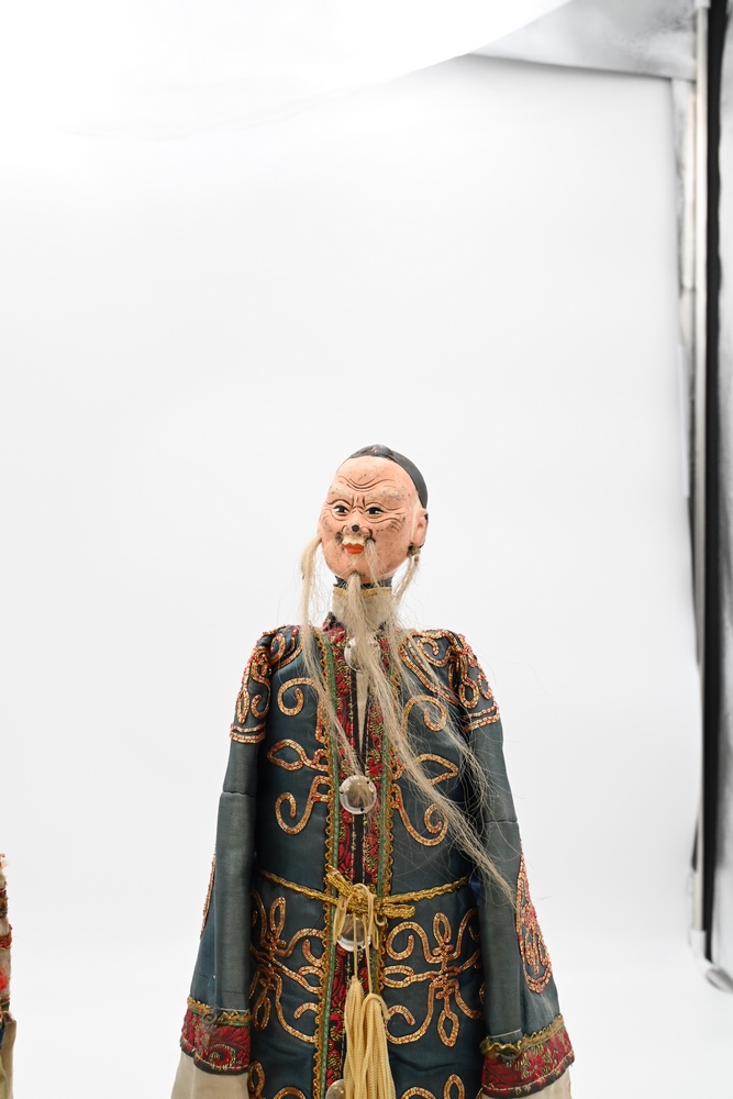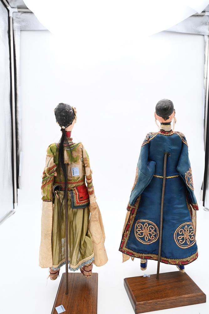 Lot 213: Pair of Chinese Wood Carved Doll Figures scholar wearing a silk robe, and a guanyan with tattered silk robe, 19th century height 19 1/2 inches