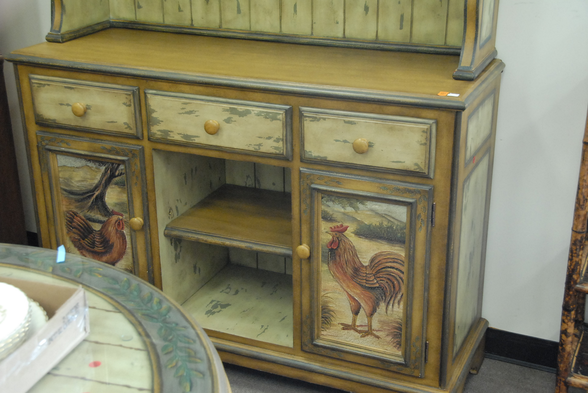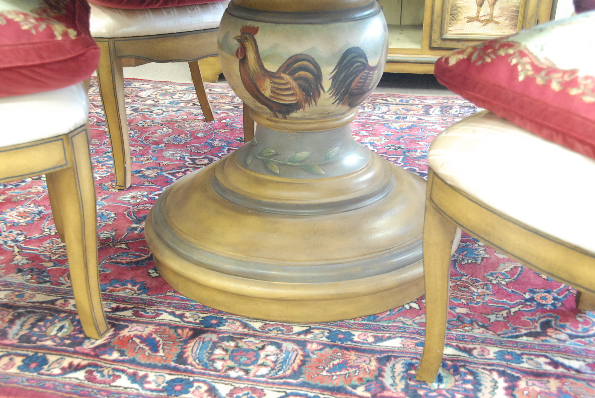 Pulaski Furniture Company six piece dining set including a table and four chairs, hutch with glass door top, all painted with chickens, roosters, and scenery, along with four needle point rooster cushions.