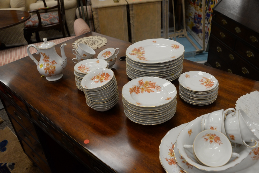 Seventy Two Piece Lot of Krautheim Selb Bavaria Germany Hispana Dinnerware Set, to include 11 dinner plates, 11 salad plates, 11 bread and butter plates, 12 berry bowls, 13 saucers, 12 teacups, 1 tea pot, along with 3 serving dishes, diameter 10 3/4 inches.