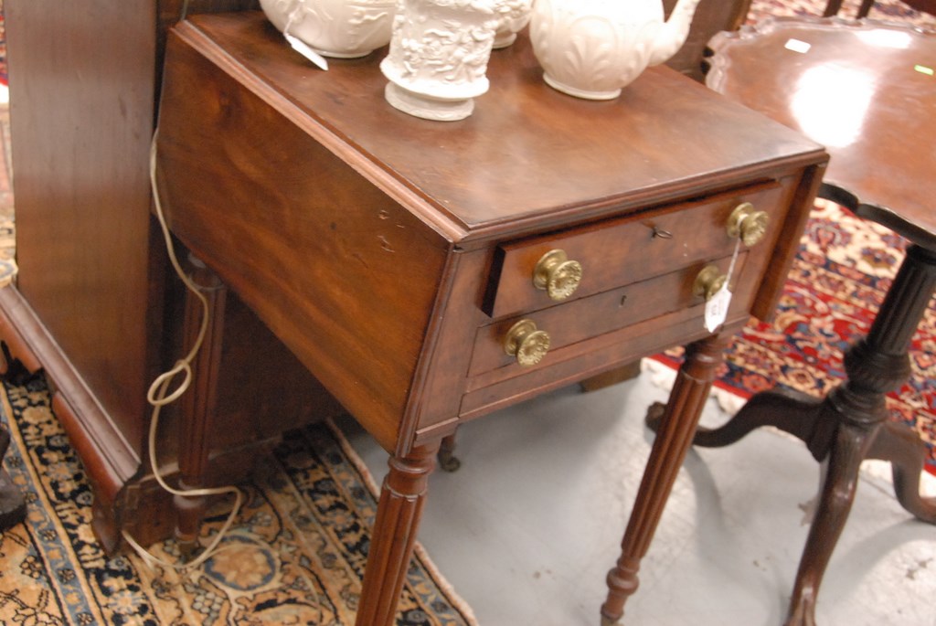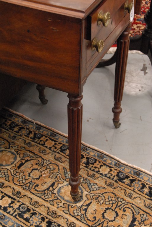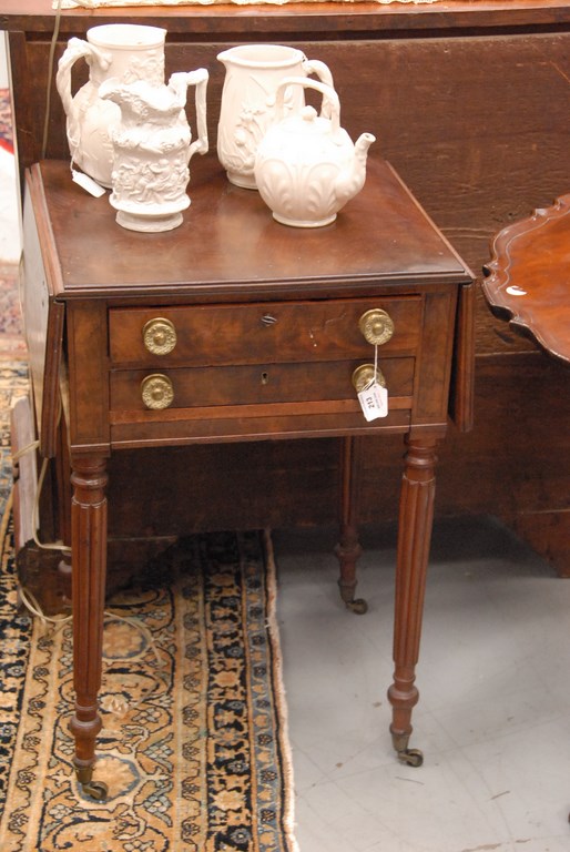 Lot 213: Sheraton mahogany work table with drop leaves and drawers plus bag drawer on fluted legs ending in brass capped feet and wheels. ht….