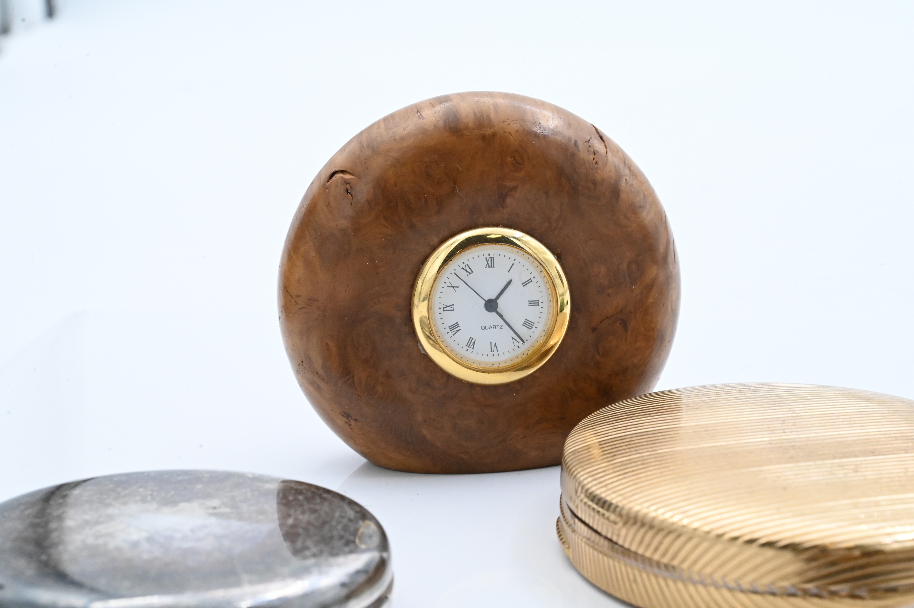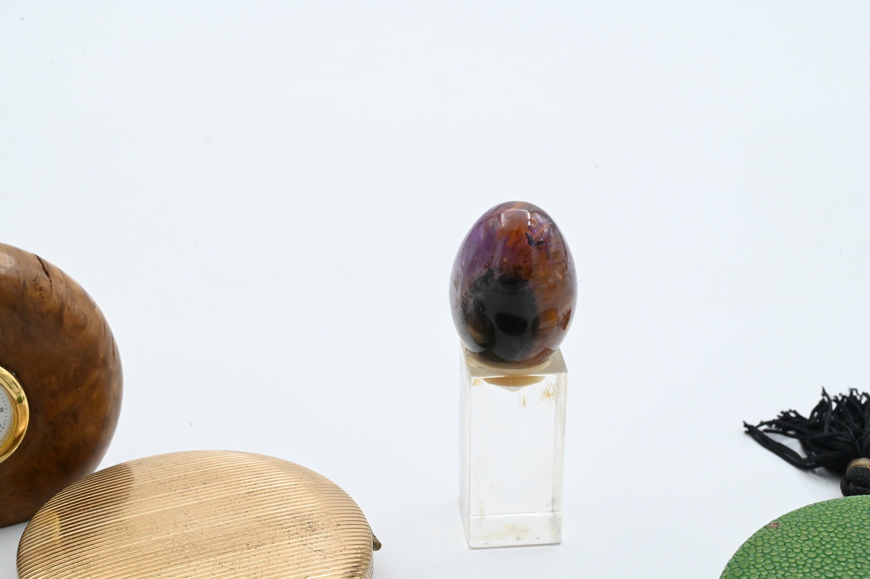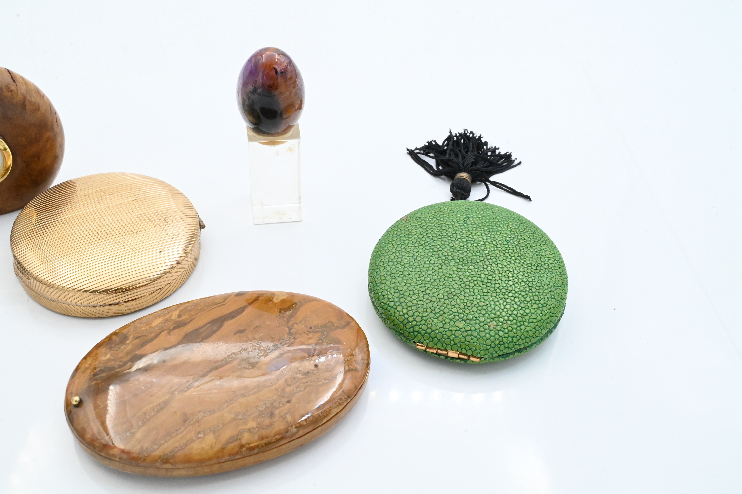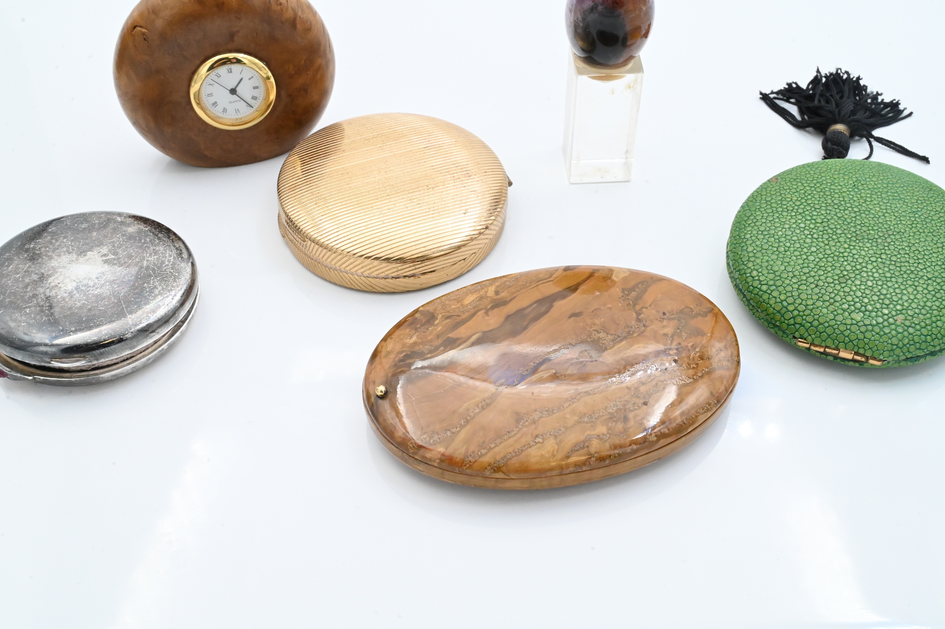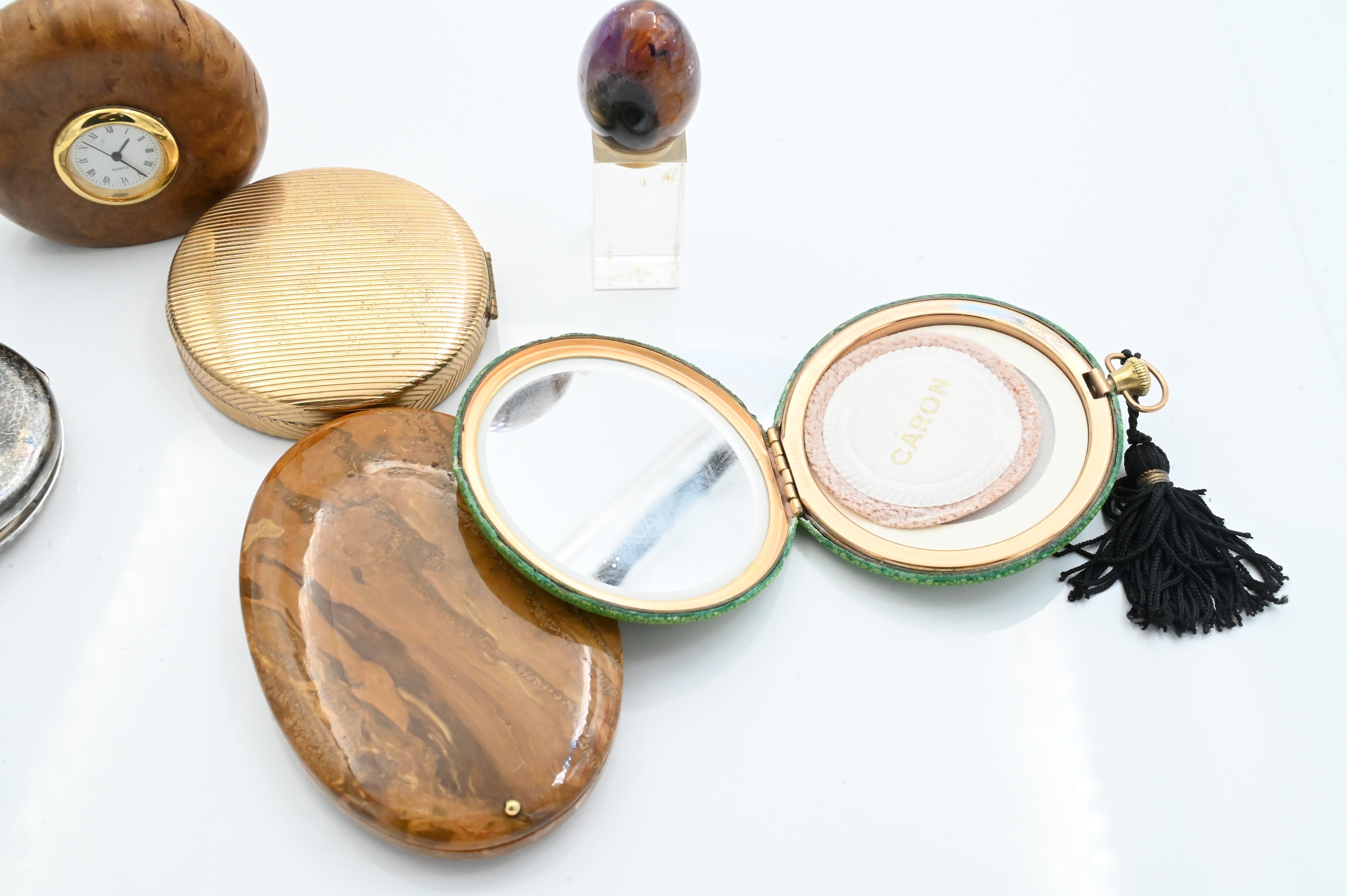 to include a P Caron Paris compact with shagreen case, quartz clock with burl case, silver compact, stone mirror, purple quartz and lucite paper weight, and a gold color compact