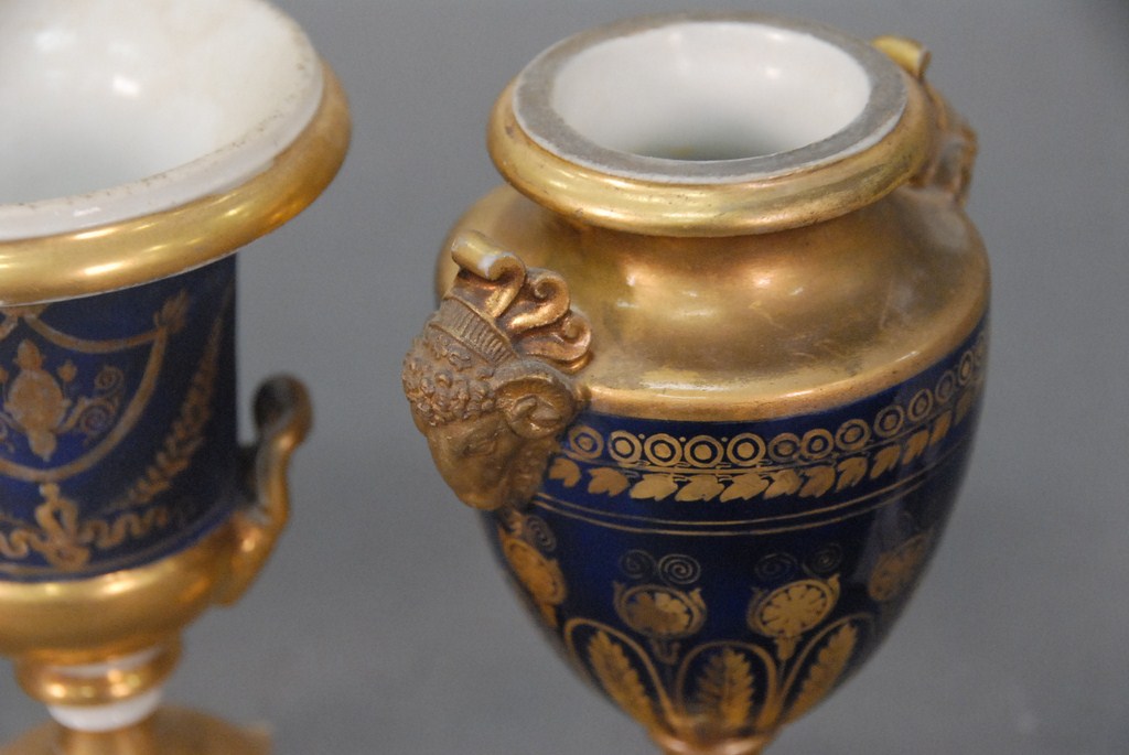 Six piece lot pair of white Paris porcelain campania urns with gold trim circa 1810-1830, pair of blue Napoleon I old Paris campania urns with a design of wreaths foliage, and acanthus leaves circa 1820 and pair of Paris porcelain urns circa 1800 with rams’ heads and neo-classical motifs. Provenance: From prominent Woodbridge, Connecticut family collection. tallest ht. 6 3/4in.