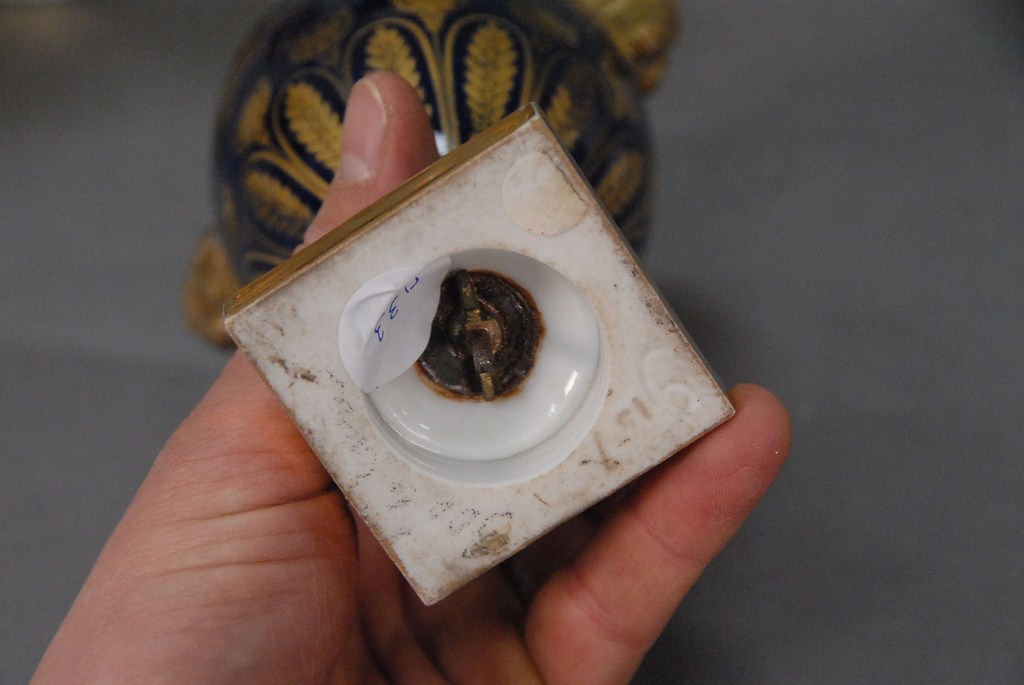 Lot 213: Six piece lot pair of white Paris porcelain campania urns with gold trim circa 1810-1830, pair of blue Napoleon I old Paris campani…